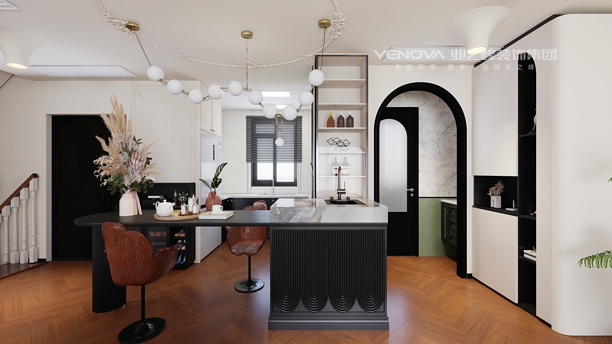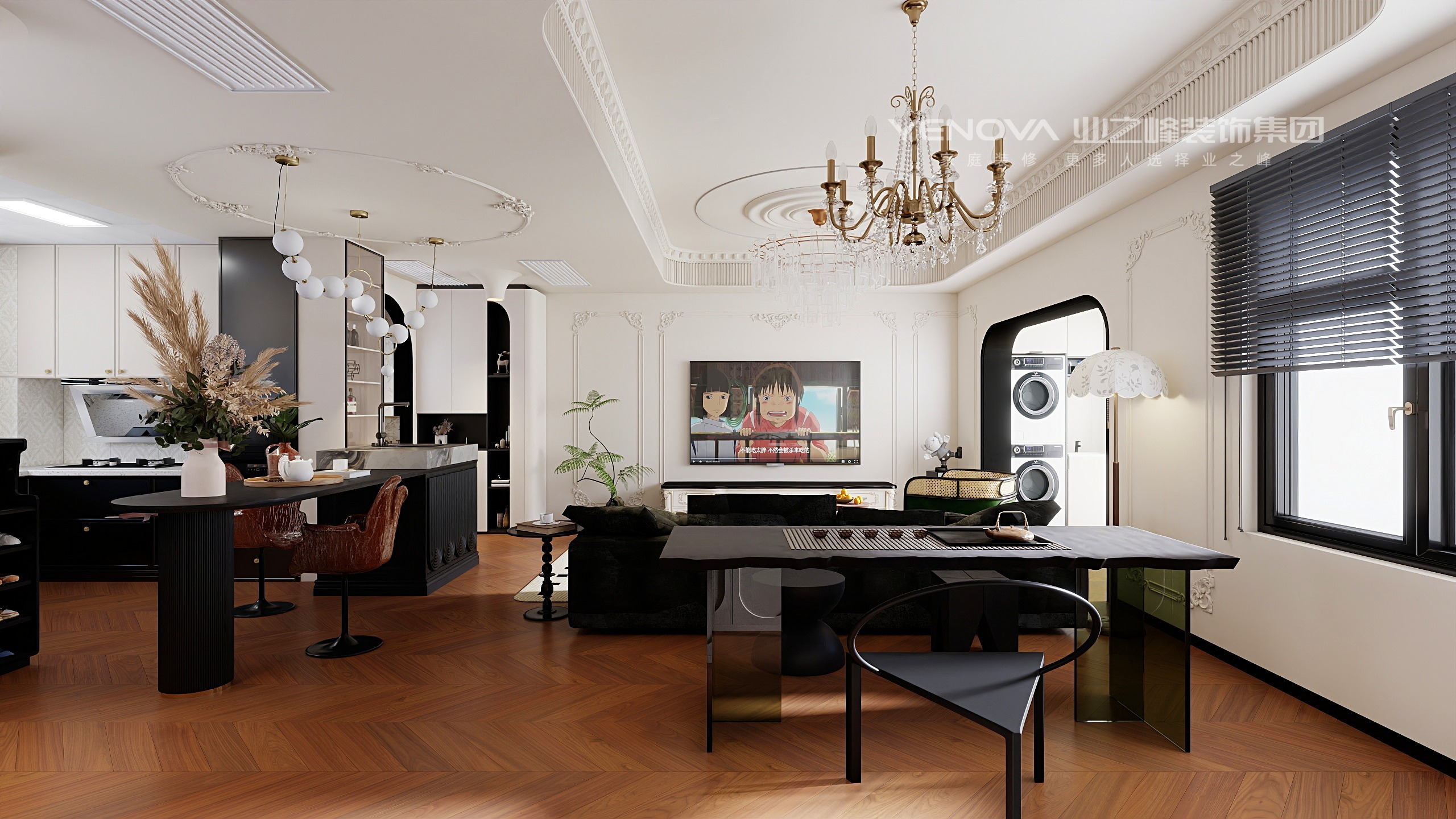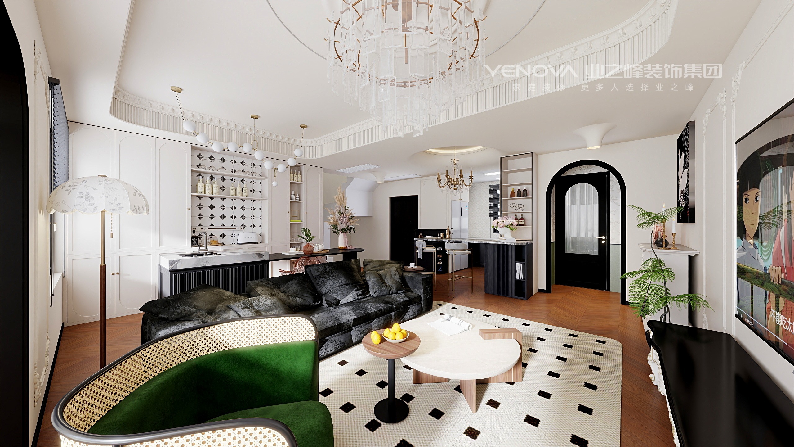 本设计采用奶白加黑色点缀部分绿色的搭配,运用石膏线条、金属元素、柔光灯等营造出法式的高级浪漫感。客餐厅区域布局通透,客厅中黑色布艺沙发搭配造型独特的茶几,搭配绿色的小沙发,浪漫精致;餐厅黑色岛台搭配异性座椅,典雅复古,电视背景墙面与顶面多用石膏线制造视觉焦点,营造法式氛围增加复古感。整体设计通过法式元素与现代材质的融合,如布艺、木质与金属的搭配,实现奢华与自然的平衡,有选择的搭配,留出呼吸的空间,为居住者打造出一个既有法式美学的浪漫又有现代家居生活舒适松弛的居住空间。
