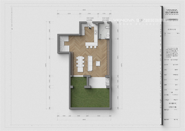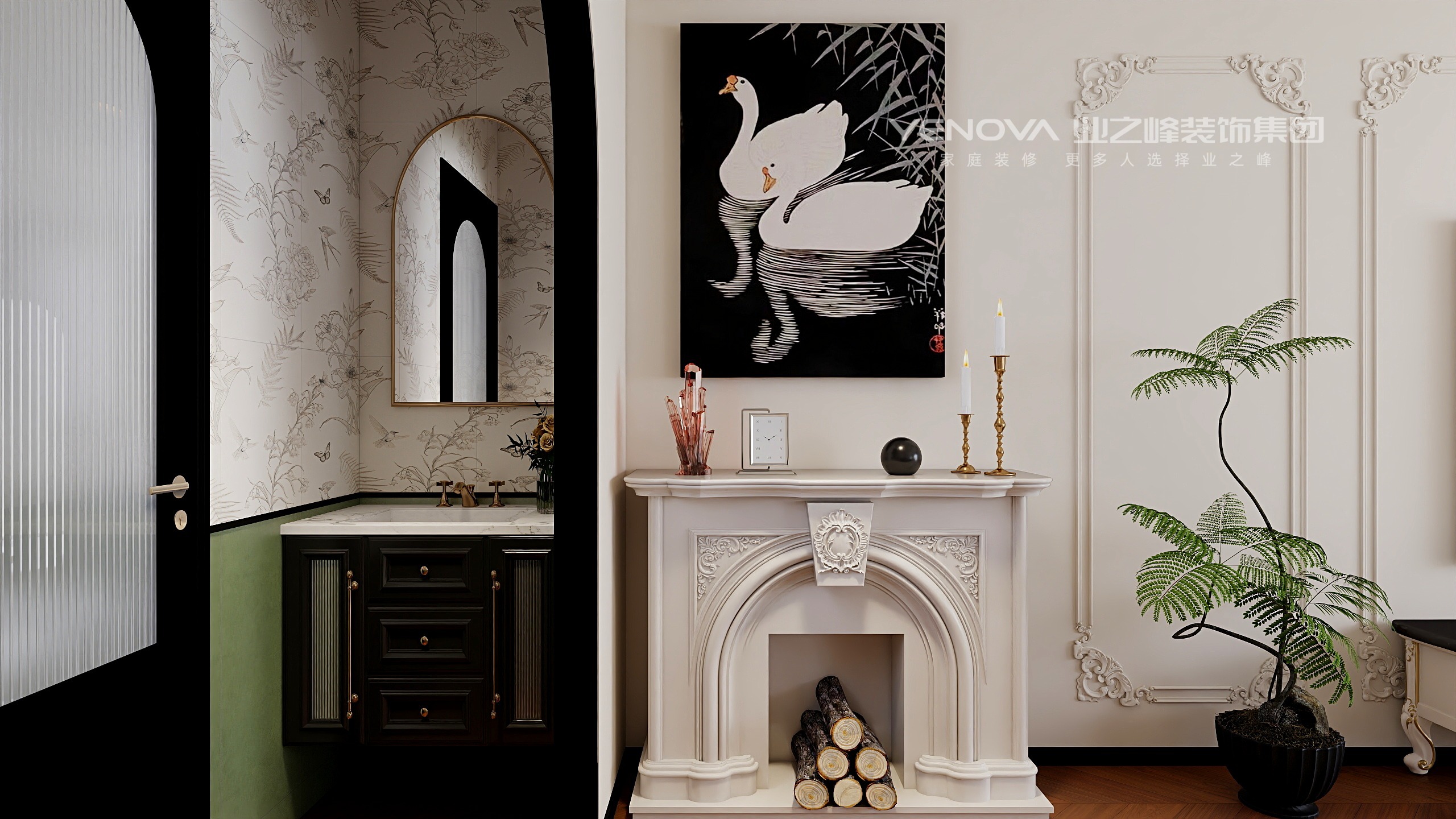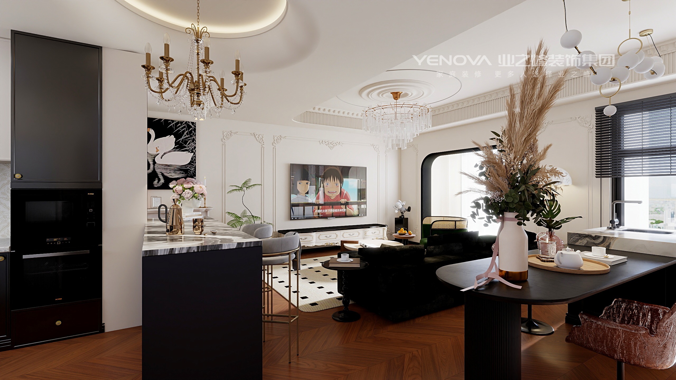 本设计采用奶白加黑色点缀部分绿色的搭配,运用石膏线条、金属元素、柔光灯等营造出法式的高级浪漫感。客餐厅区域布局通透,客厅中黑色布艺沙发搭配造型独特的茶几,搭配绿色的小沙发,浪漫精致;餐厅黑色岛台搭配异性座椅,典雅复古,电视背景墙面与顶面多用石膏线制造视觉焦点,营造法式氛围增加复古感。整体设计通过法式元素与现代材质的融合,如布艺、木质与金属的搭配,实现奢华与自然的平衡,有选择的搭配,留出呼吸的空间,为居住者打造出一个既有法式美学的浪漫又有现代家居生活舒适松弛的居住空间。
