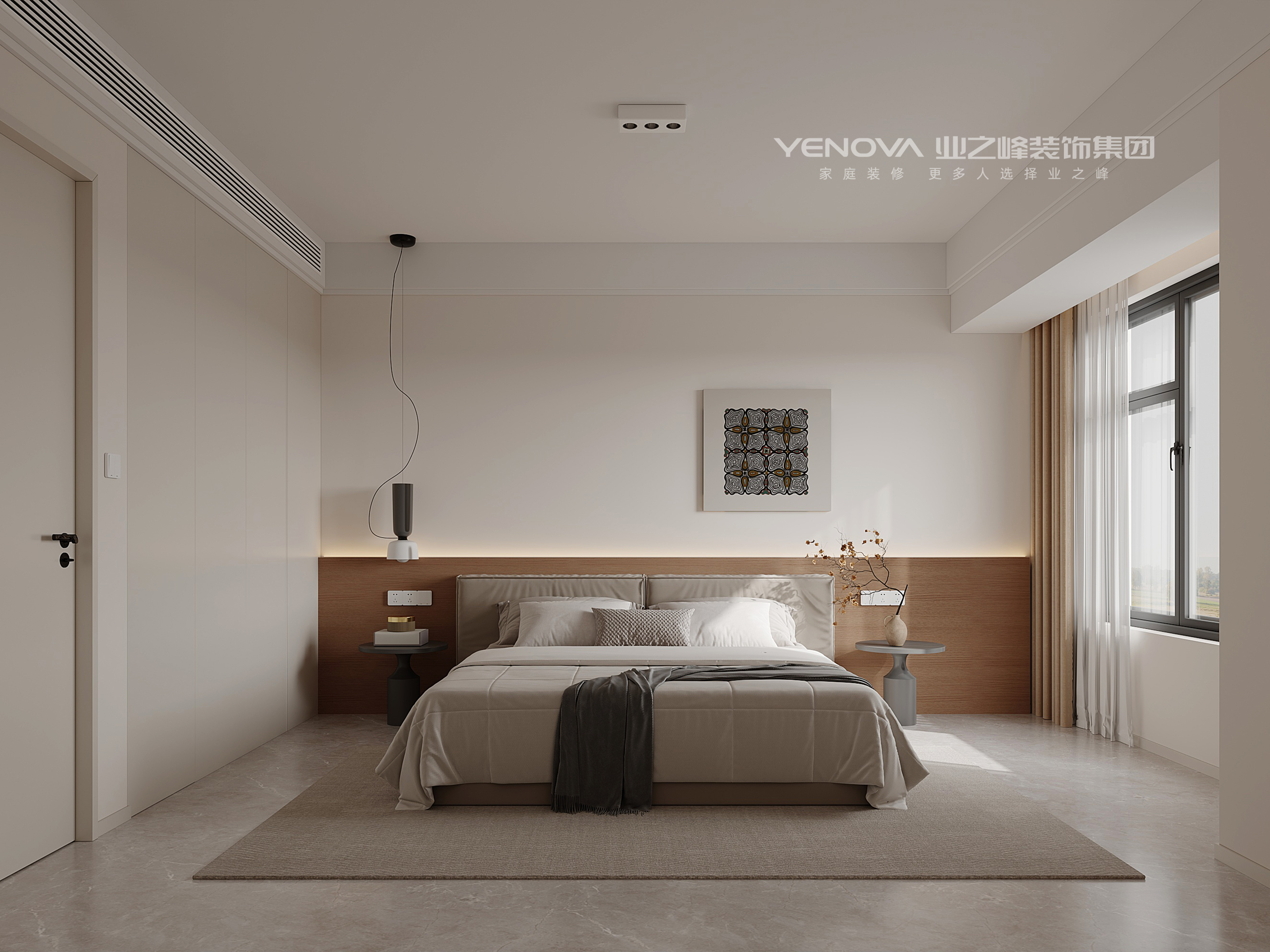 卧室:通顶柜体 + 木质床头背景墙,搭配线性灯光与极简软装,弱化冗余装饰,突出松弛感。