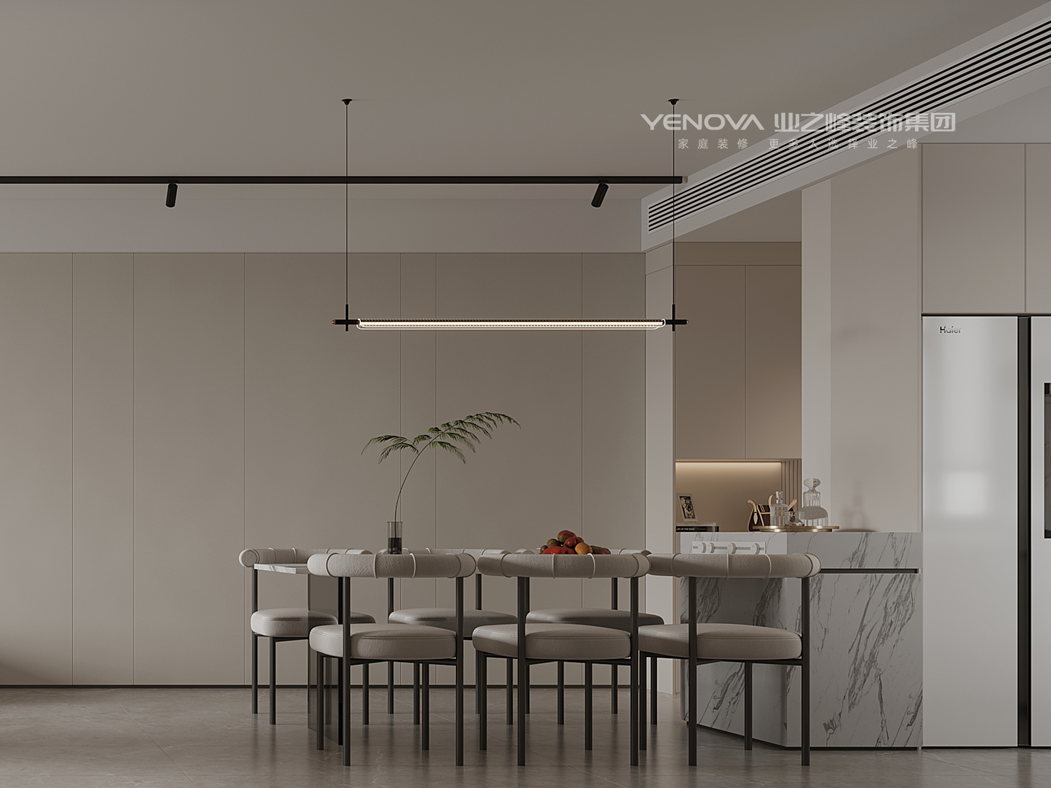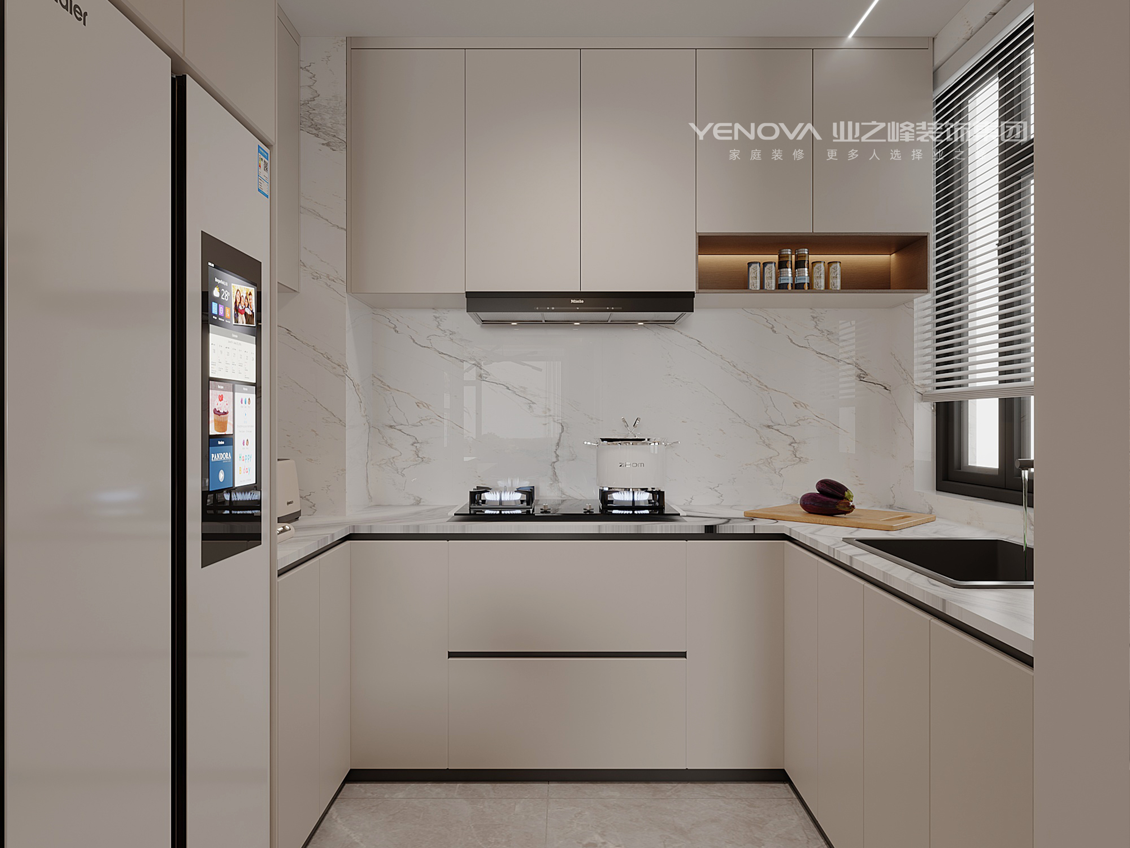 厨房:一体化浅色系橱柜 + 大理石纹台面,嵌入家电 + 局部金属元素点缀,兼顾实用与精致感。