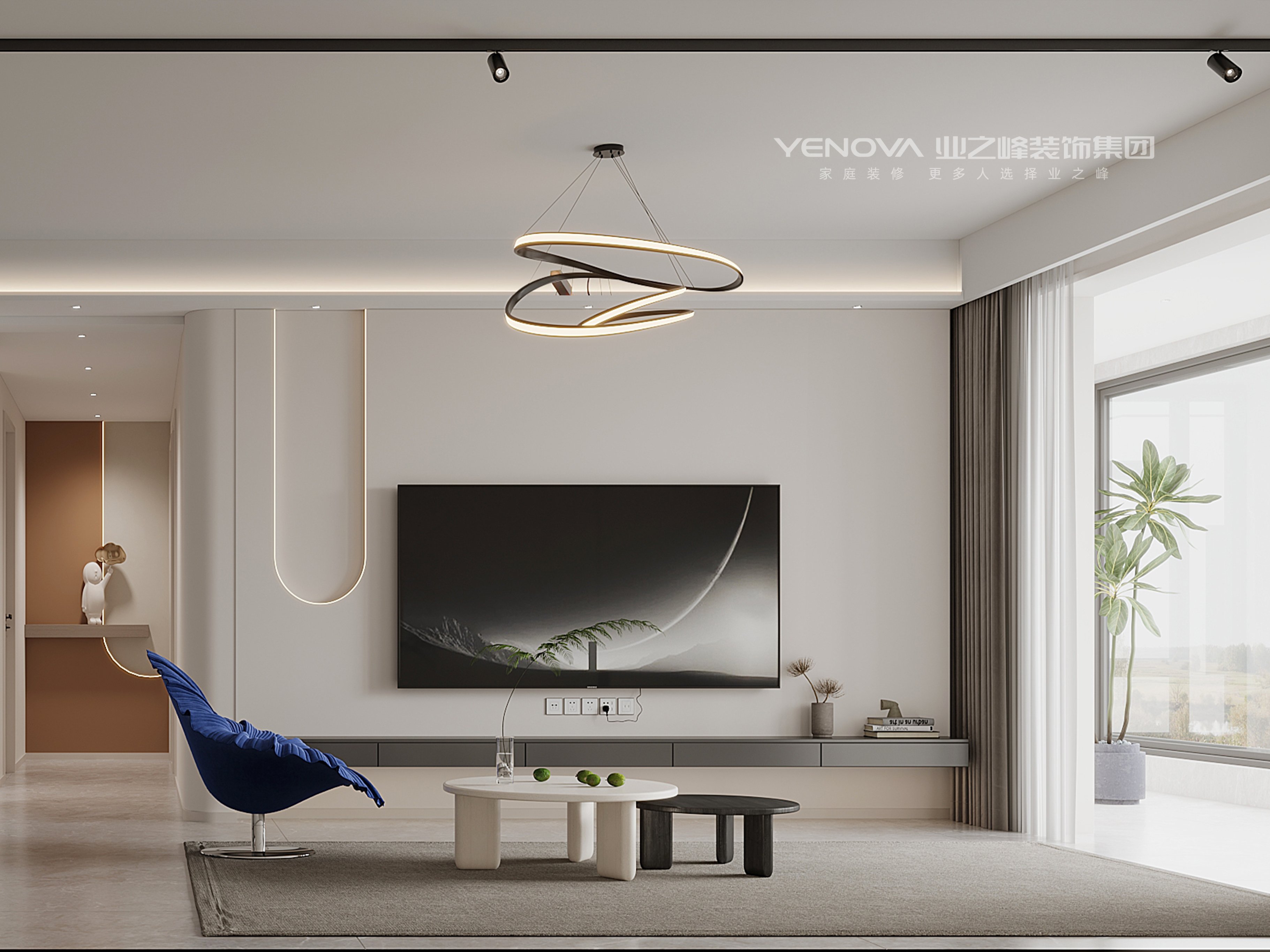 客餐厅:开放式布局 + 无主灯设计(磁吸轨道灯 + 环形吊灯),搭配简约家具与少量跳色单品(如蓝色休闲椅),让空间简约却不单调。