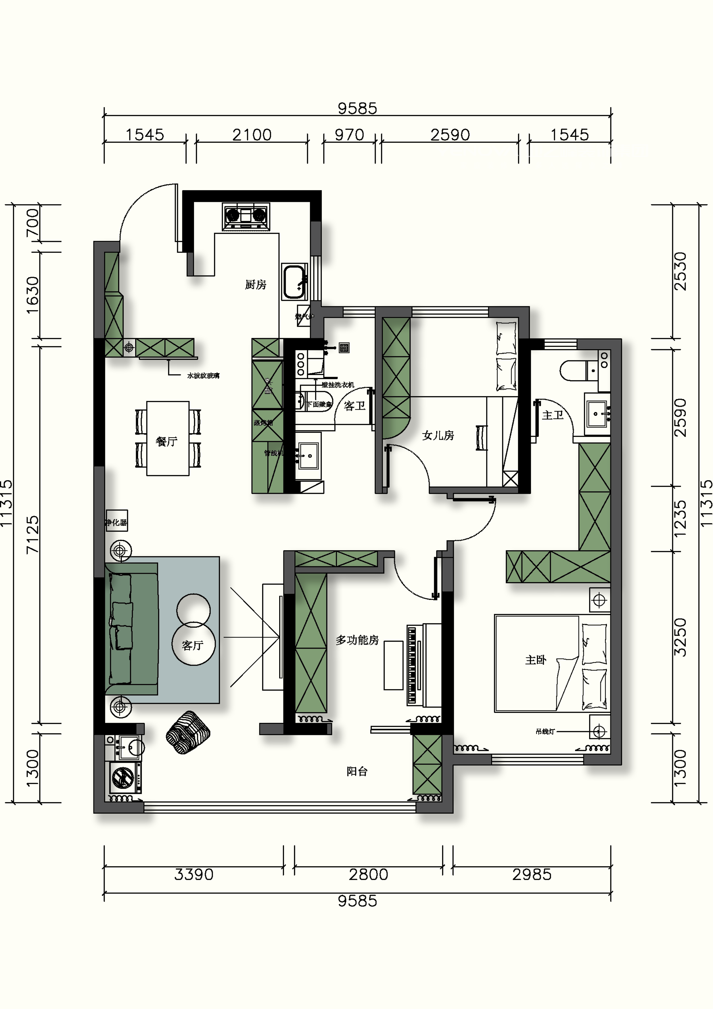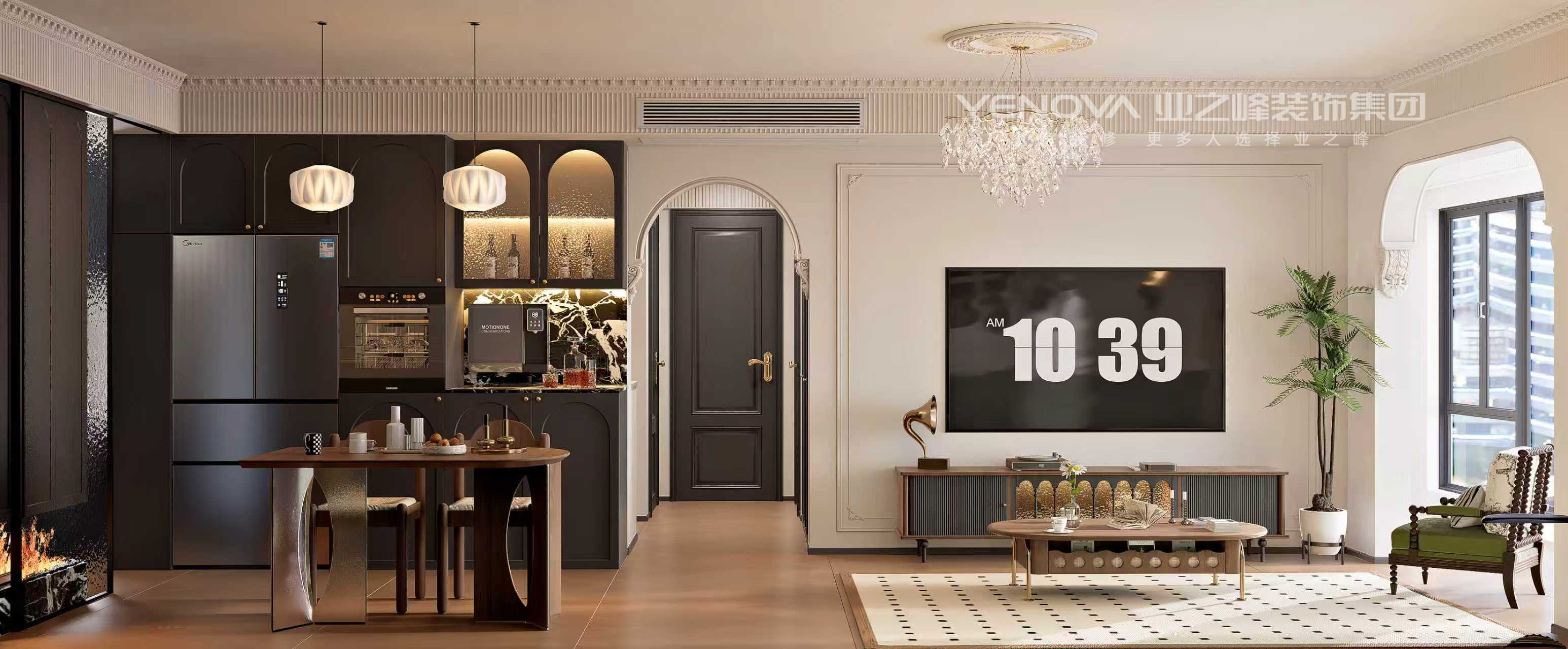 本案以法式复古风为主,核心是把法式的优雅感觉,巧妙装进现代简洁的家里。它要的是舒服和好看,而不是照搬老古董。首先,家要看起来明亮通透。少做硬隔断,让客厅、餐厅自然地连在一起。可以用家具或地毯来划分不同区域,这样既方便又显大。颜色搭配很简单。墙面主卧以米白色为主、配以黑色和复古绿点缀色。家具选深一点的胡桃木色,一下子就有了复古味道。装饰要少而精,这是出味道的关键。吊顶的钢琴键石膏线条和地板铺成人字拼,感觉马上就来了。