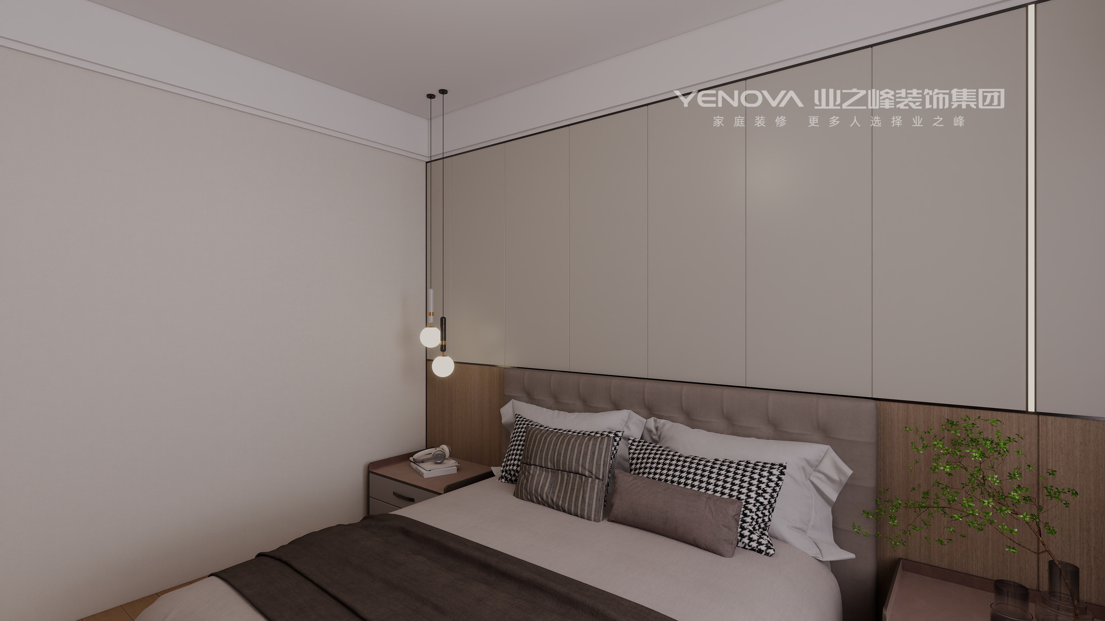 这张卧室以低饱和浅灰为主色调,搭配暖棕木纹局部拼接,营造柔和静谧的氛围。材质上采用哑光质感的墙板+软包床头,弱化空间冷硬感;金属线条勾勒墙板边缘,增添精致细节。灯光选用双球吊灯,暖光柔和不刺眼,配合墙板暗藏灯带,形成层次化间接照明,既满足基础照明需求,又强化了空间的温馨感。