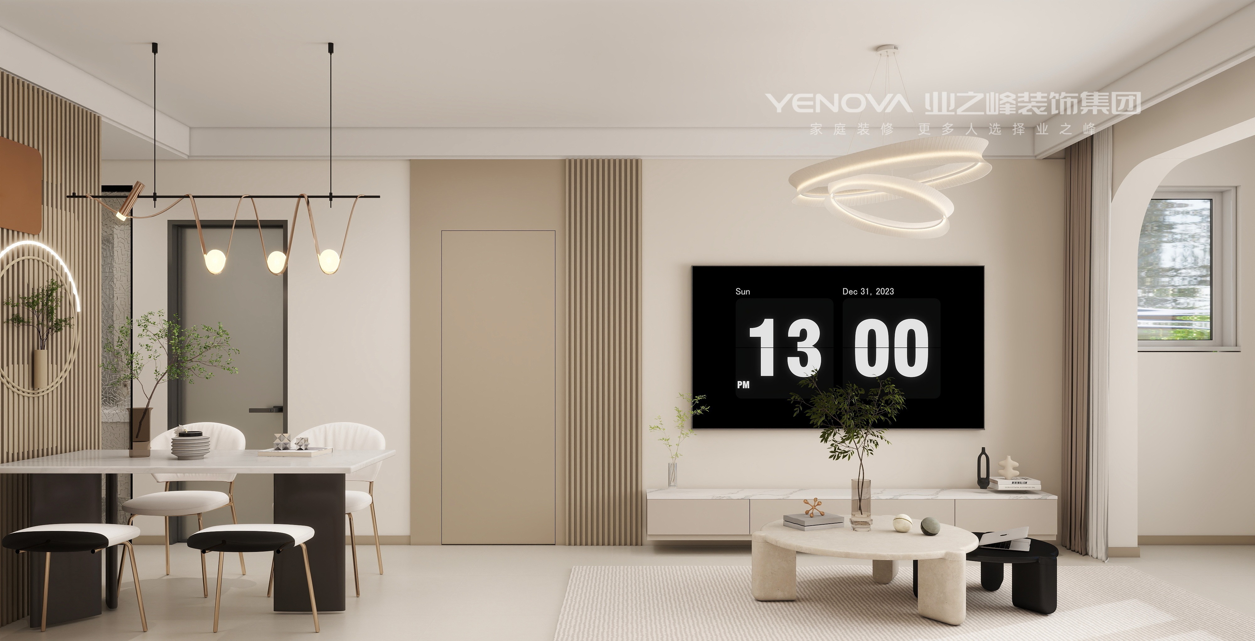 客厅-采用开放式设计,连接餐厅形成一个流动的空间,选择简洁大方的家具,沙发和茶几组合突显空间宽敞感采用多层次照明设计,包括主灯和射灯结合营造出温馨的氛围,通过简约的装饰画和绿植点缀,提升空间艺术感