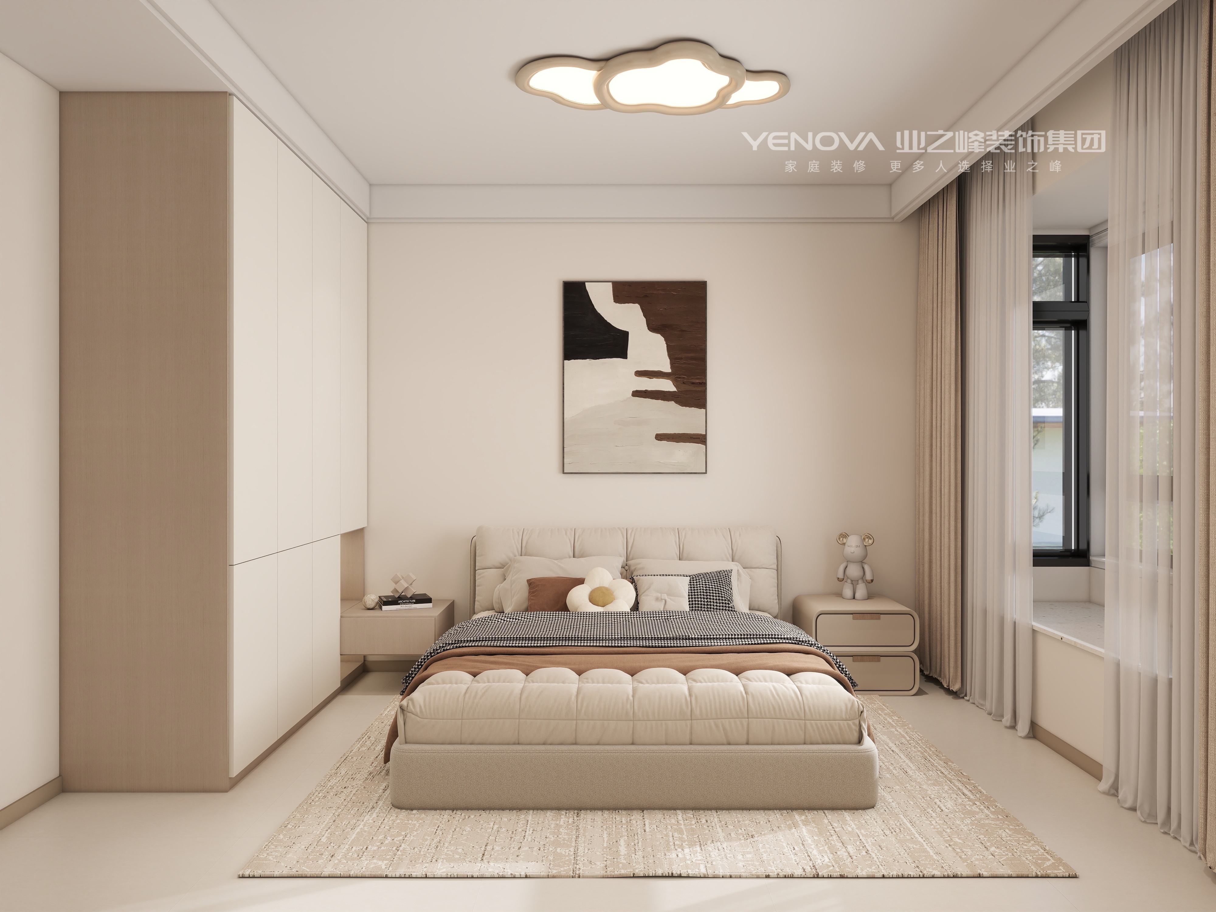 卧室-墙面色彩柔和,通常延续奶油色系,为睡眠营造宁静氛围。不使用过于复杂的造型。床品选择柔软亲肤的材质,地毯增加卧室的舒适感和温暖感。