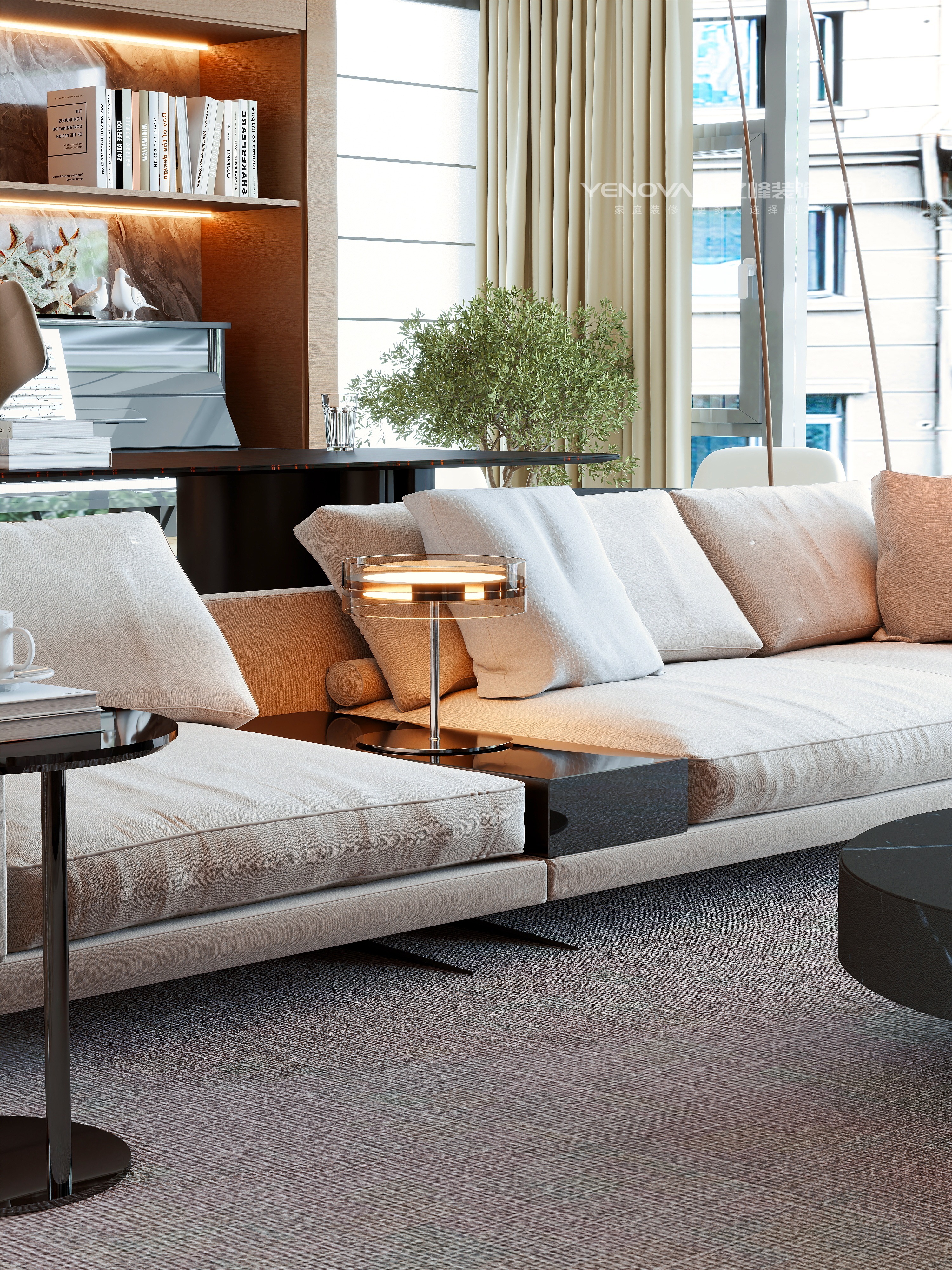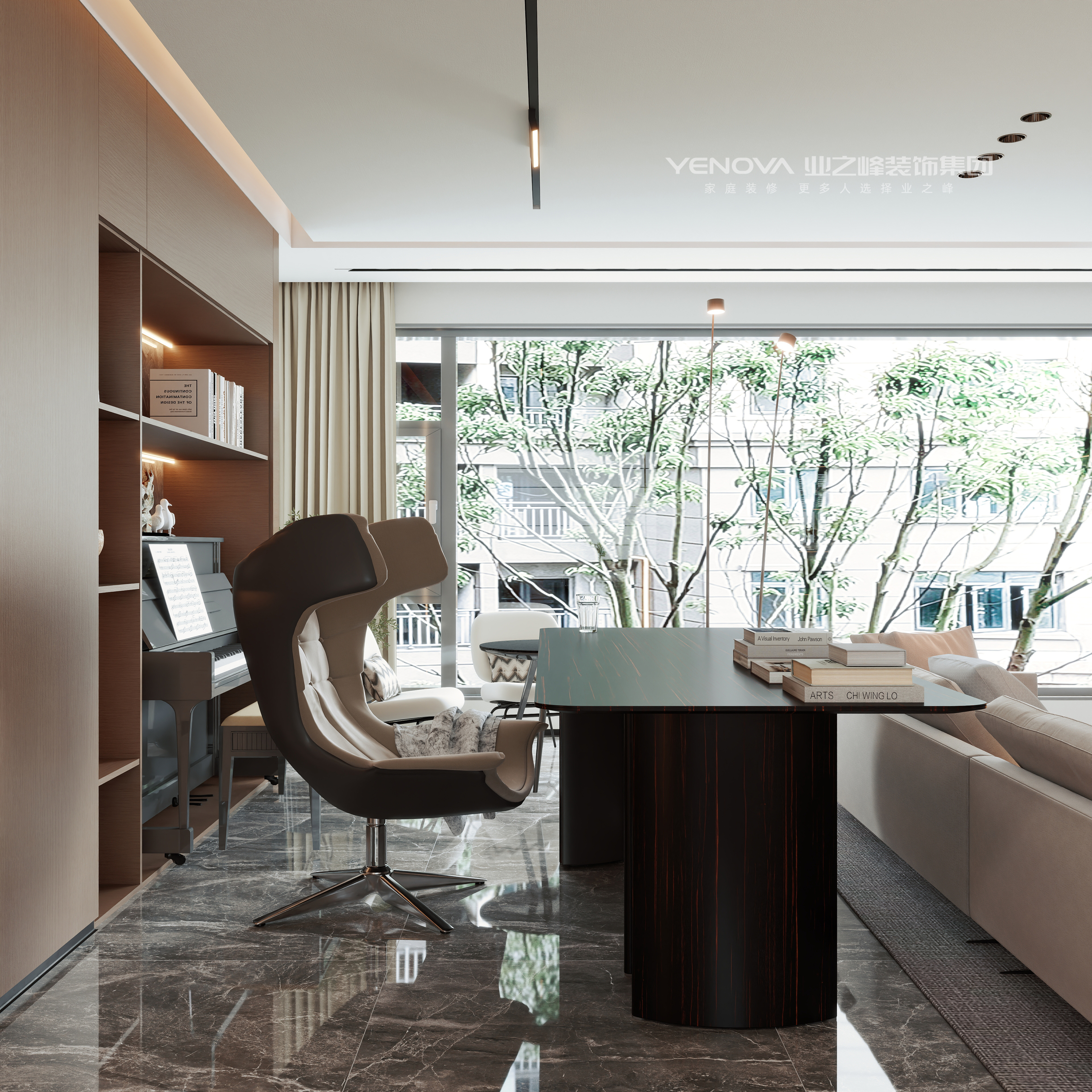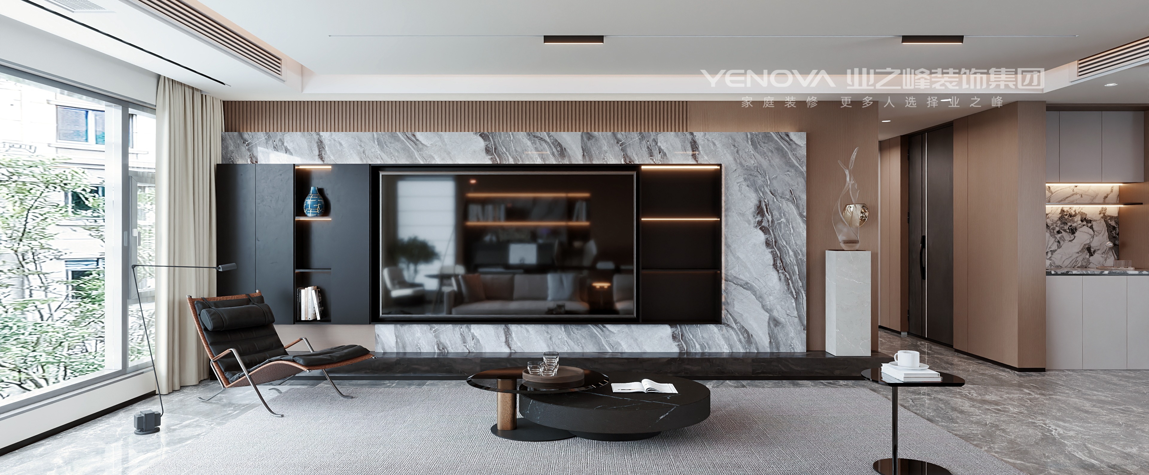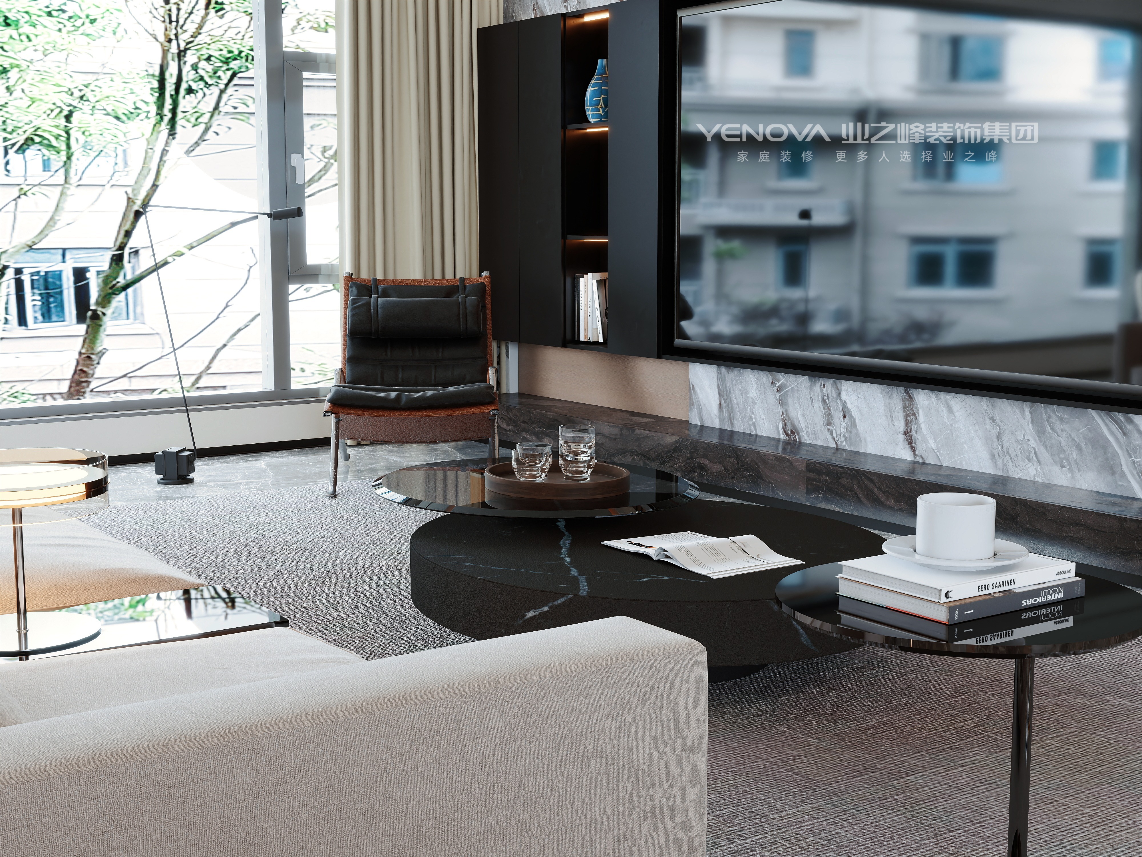 电视墙与储物的巧妙融合,让收纳与美学共存;玻璃茶几的通透感打破沉闷,单人椅的弧度勾勒出休憩的仪式感。