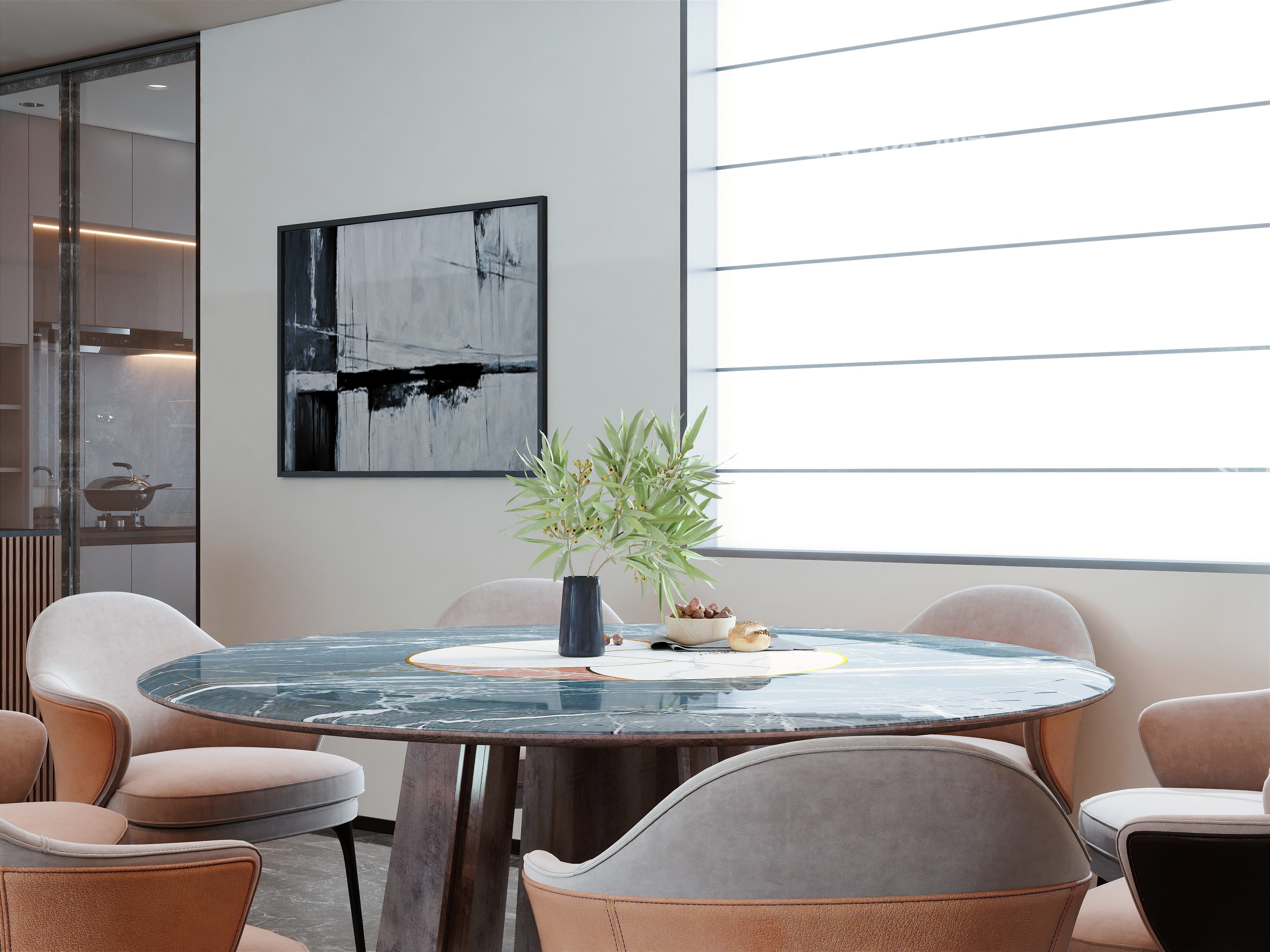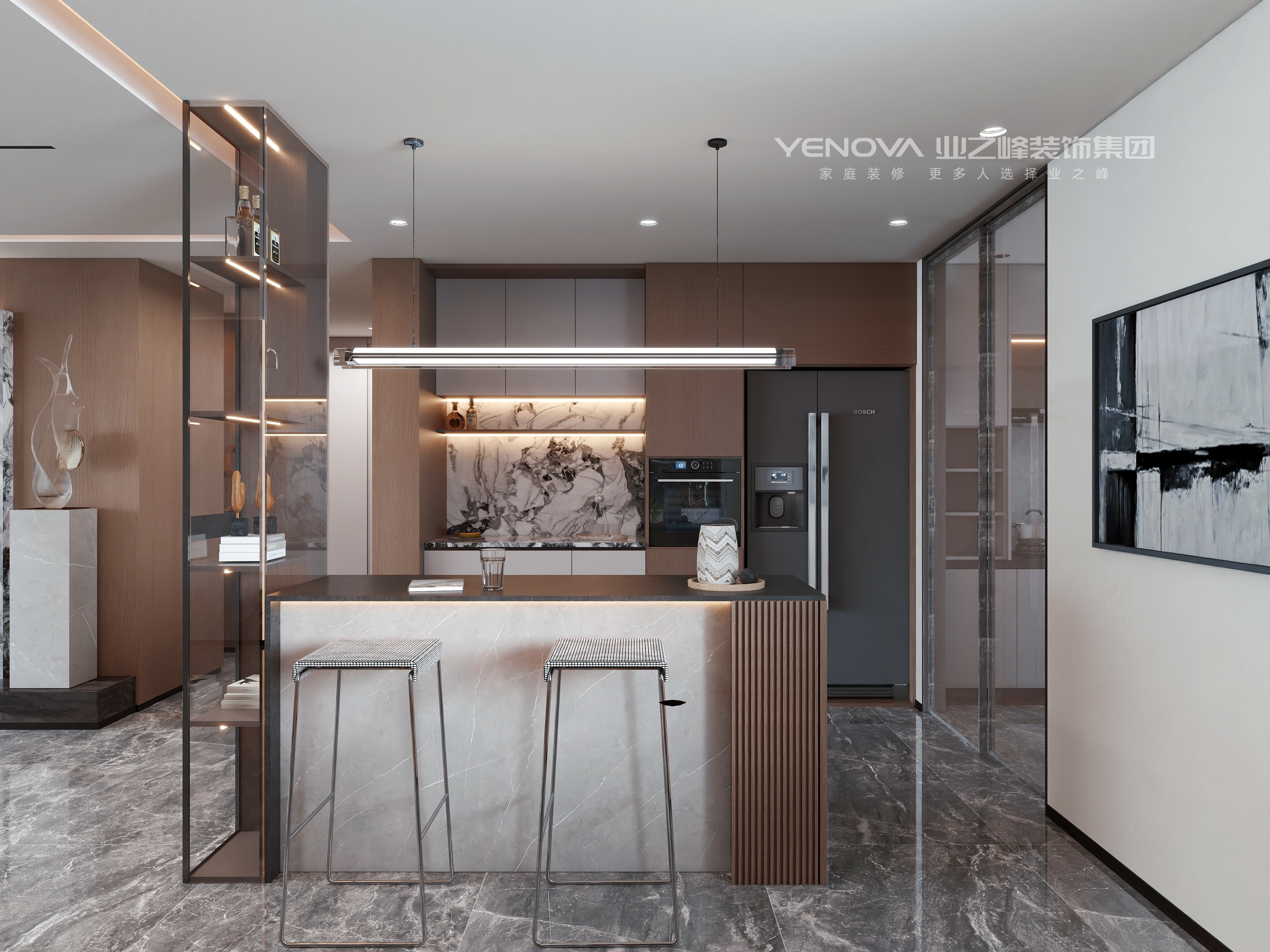 大理石台面延伸出吧台的慵懒轮廓,黑色金属框架勾勒利落线条,开放式厨房在光影中呼吸,每一处细节都在说:高级感,藏在日常的不经意里。