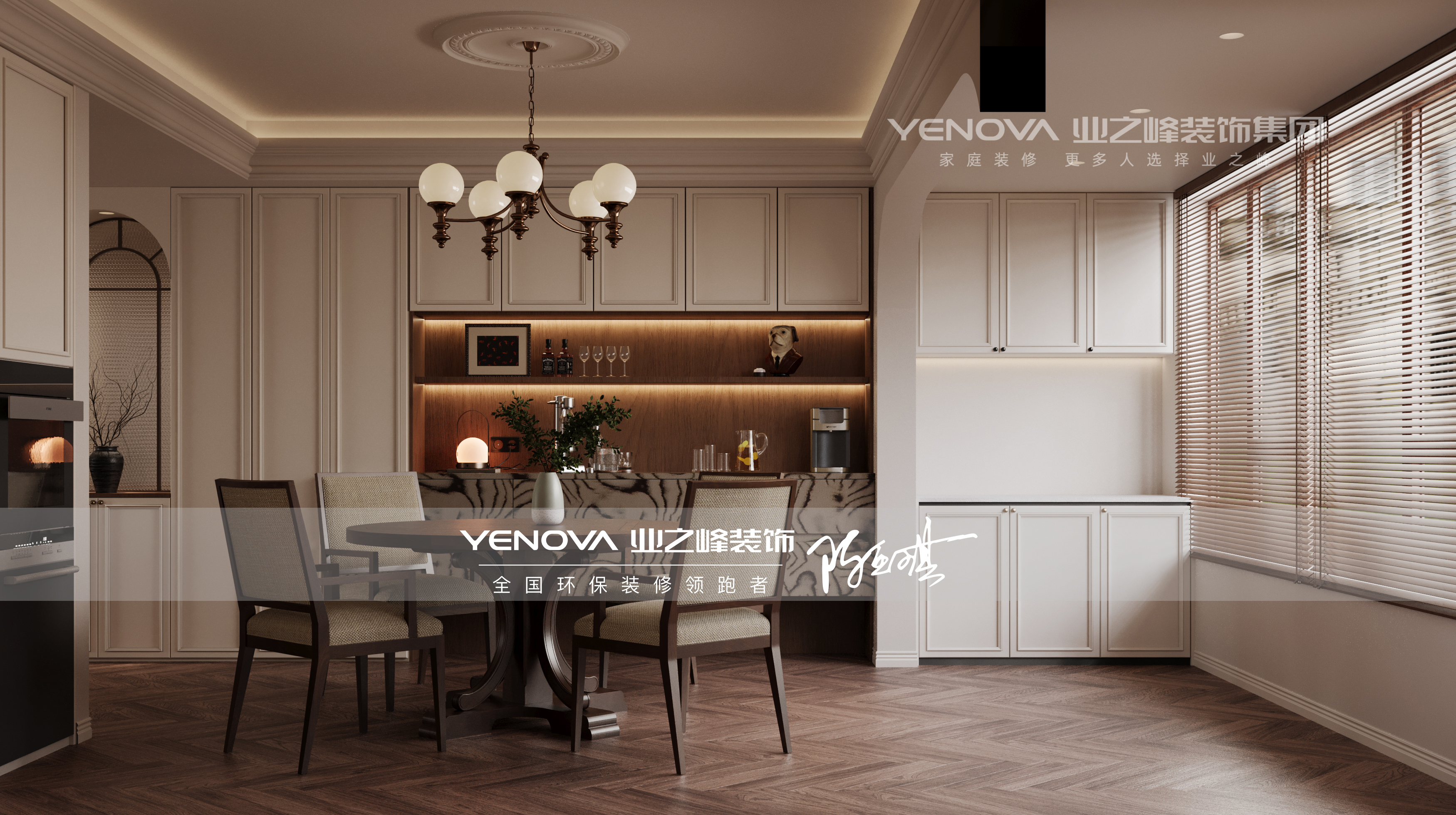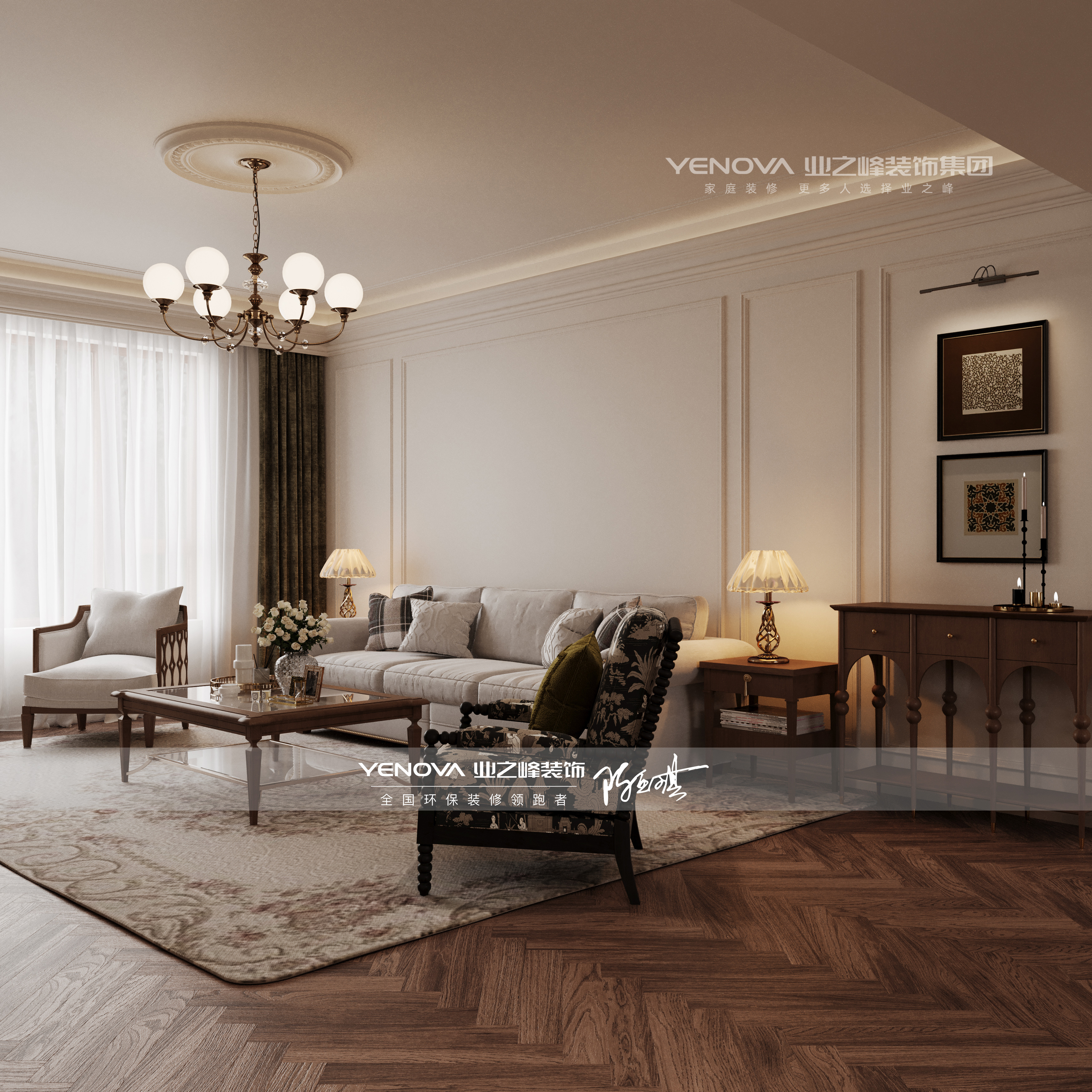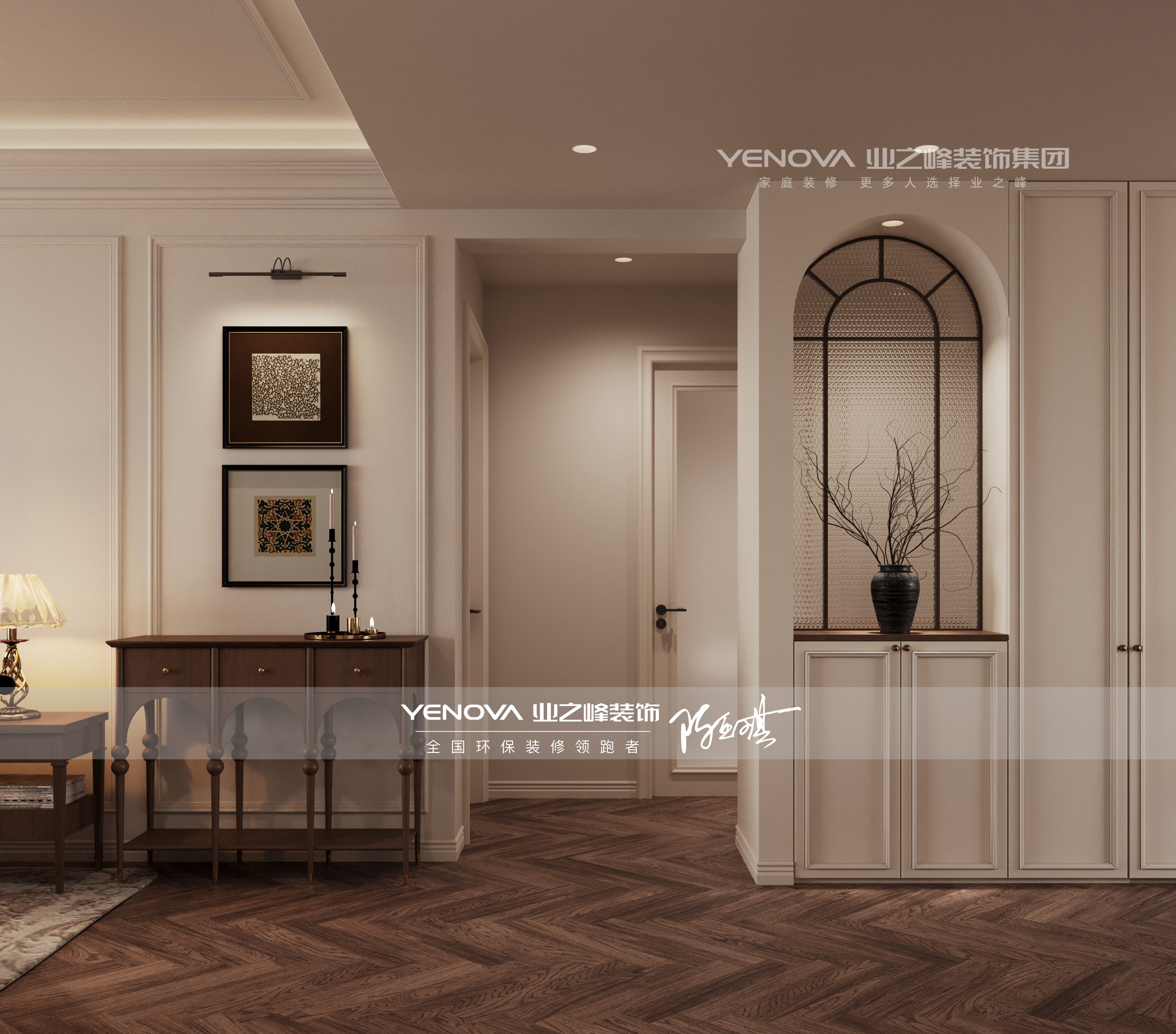 3. 原创亮点:客厅背景墙摒弃常规美式护墙板满铺,采用简单的pu线条,使整个空间的风格得到了升华,降低传统美式的厚重感;入户门的正对面做了一个端景既能保证美观和使用性又能达到不闷重的效果,整体配色运用恰当好处,即深化了整个空间的经典美式风格又保留了温馨的氛围。