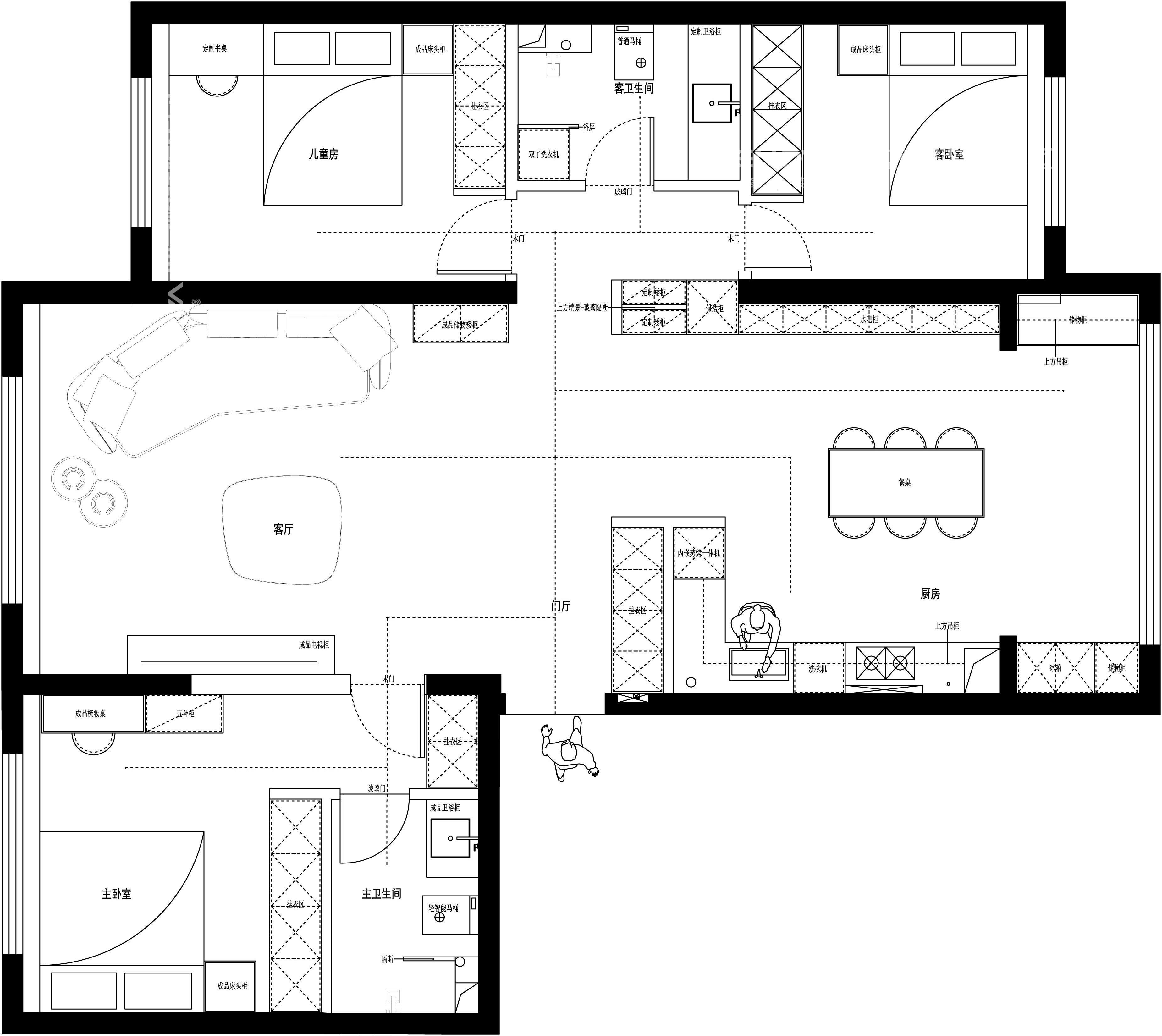 2. 设计依据:根据客户的需求,营造一个以“经典美式”风格为主温馨明亮的家,要保证整体空间采光与收纳,全屋通铺深色木纹地板,使得整个空间经典、沉稳,顶面选用有层次感的石膏线,整个空间以胡桃木色和暖白色为主,黑色作为点缀使整个空间形成“轻复古,重舒适”的经典美式表达。