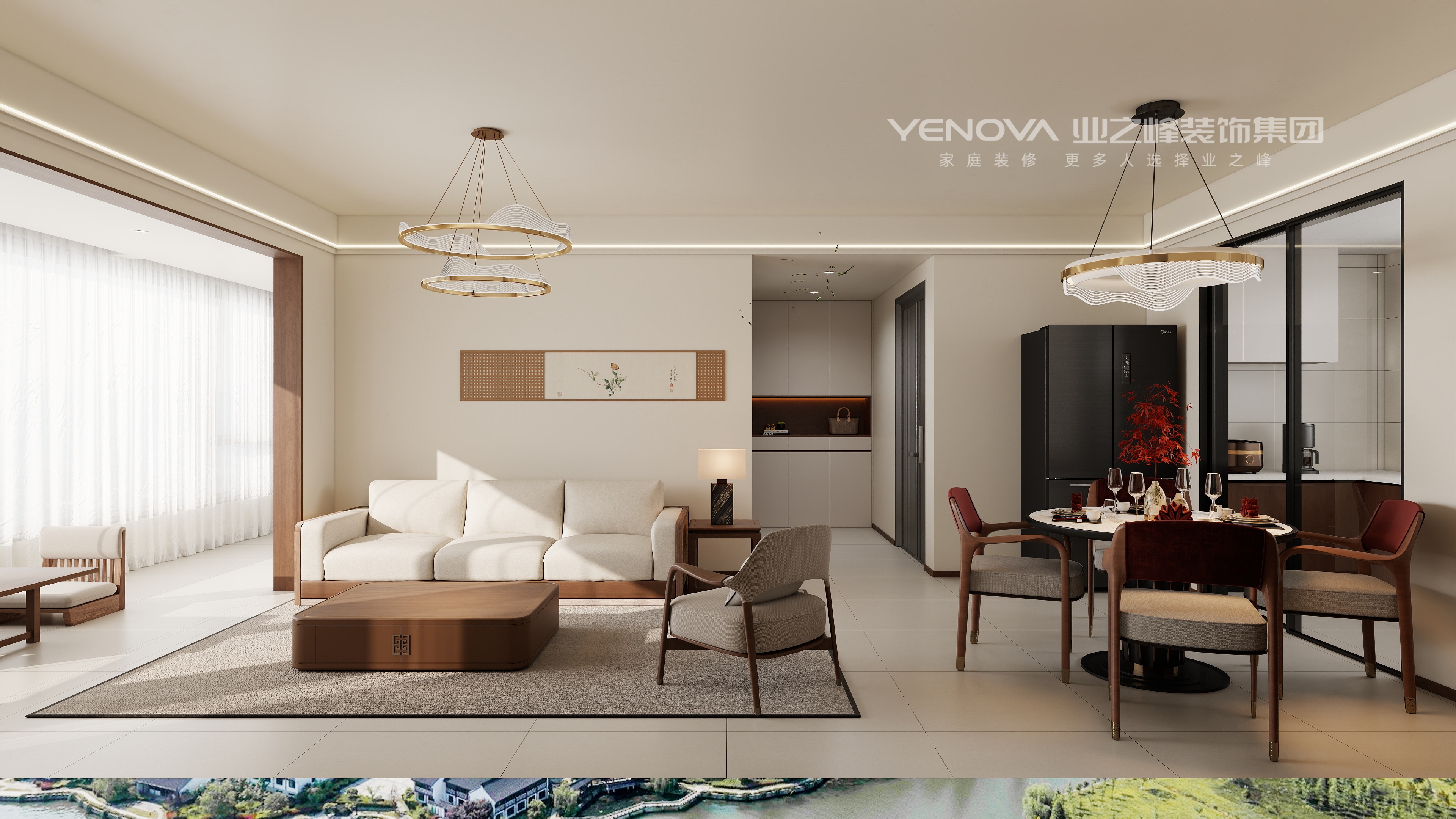 卧室以米白为基底,胡桃木色家具与格栅纹理灯具呼应东方质感,床品的棕灰配色 + 艺术挂画,在简约中融入雅致细节;客餐厅采用通厅布局,浅米墙面搭配胡桃木色柜体,弱化空间边界感。沙发的藤编元素、茶几的中式纹案,搭配水墨挂画与禅意摆件,柔化传统符号的厚重感;餐厅的红棕餐椅、悬浮餐边柜,结合现代线条的层叠吊灯,实现功能与美学的统一。
