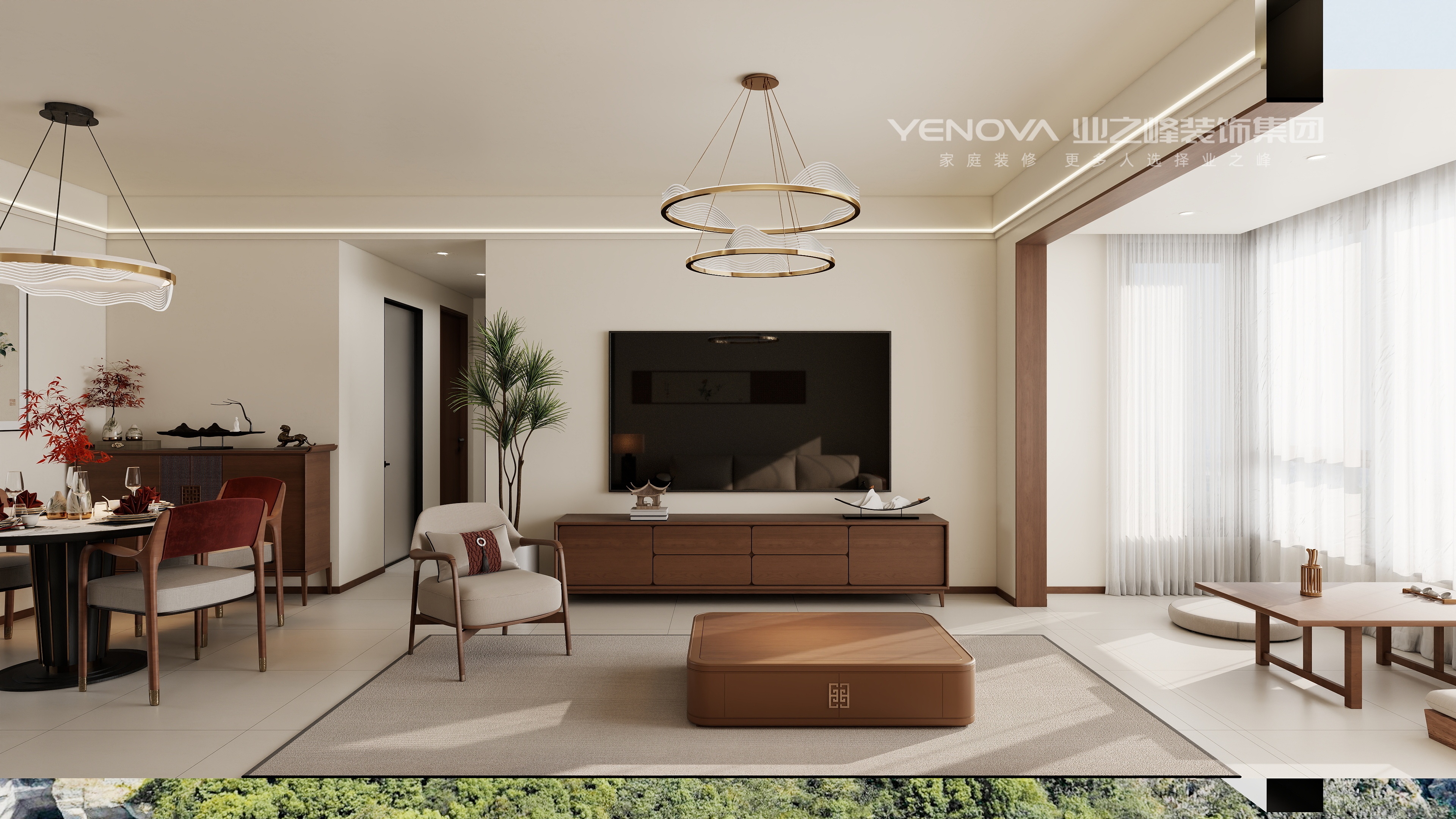 设计以 “轻中式” 为原则,通过材质(藤编、实木)、色彩(暖棕 + 米白)与光影(线性灯 + 吊灯)的层次,在通透空间中植入东方意境,既保留传统美学的雅致,又适配现代生活的松弛感。