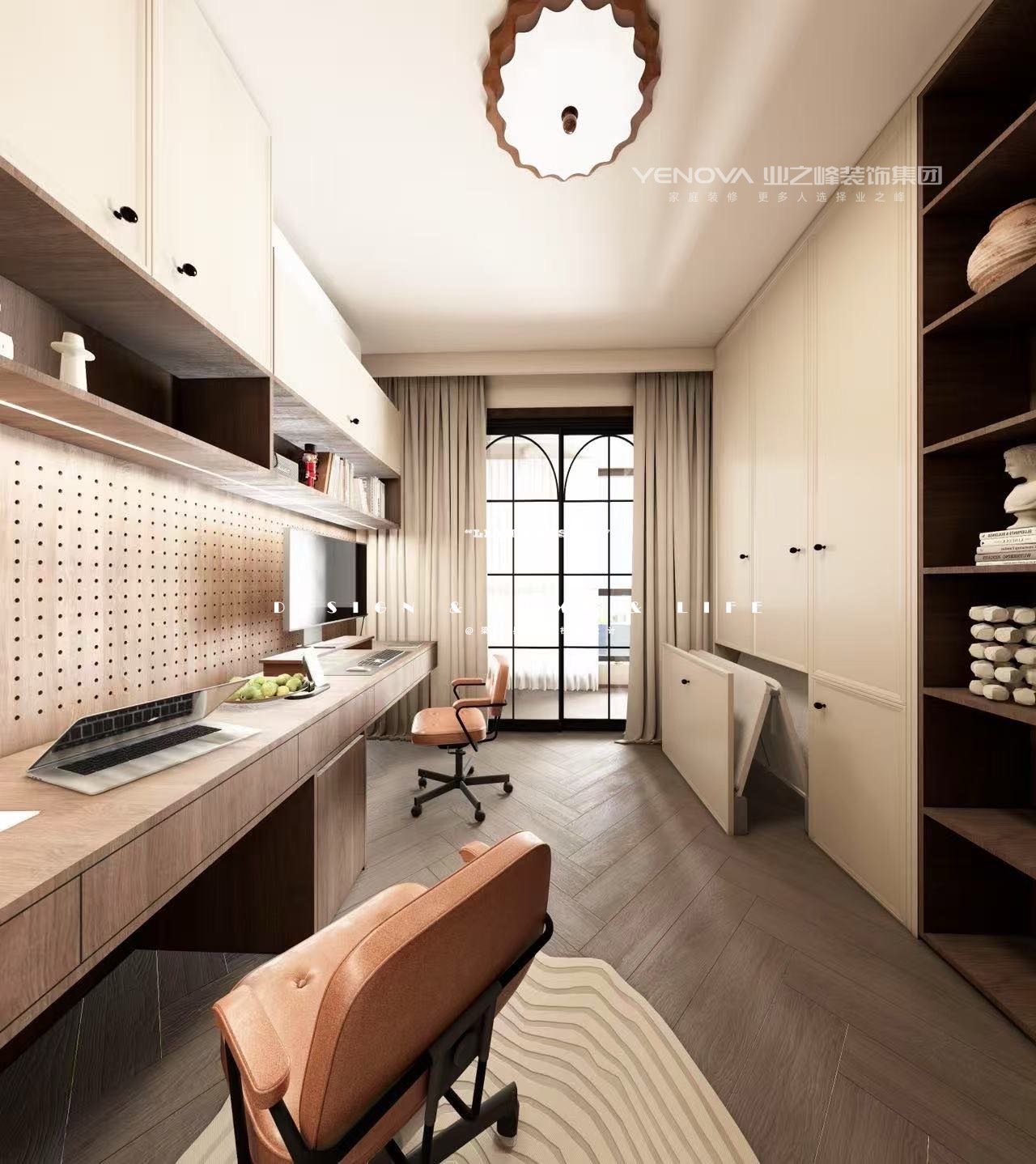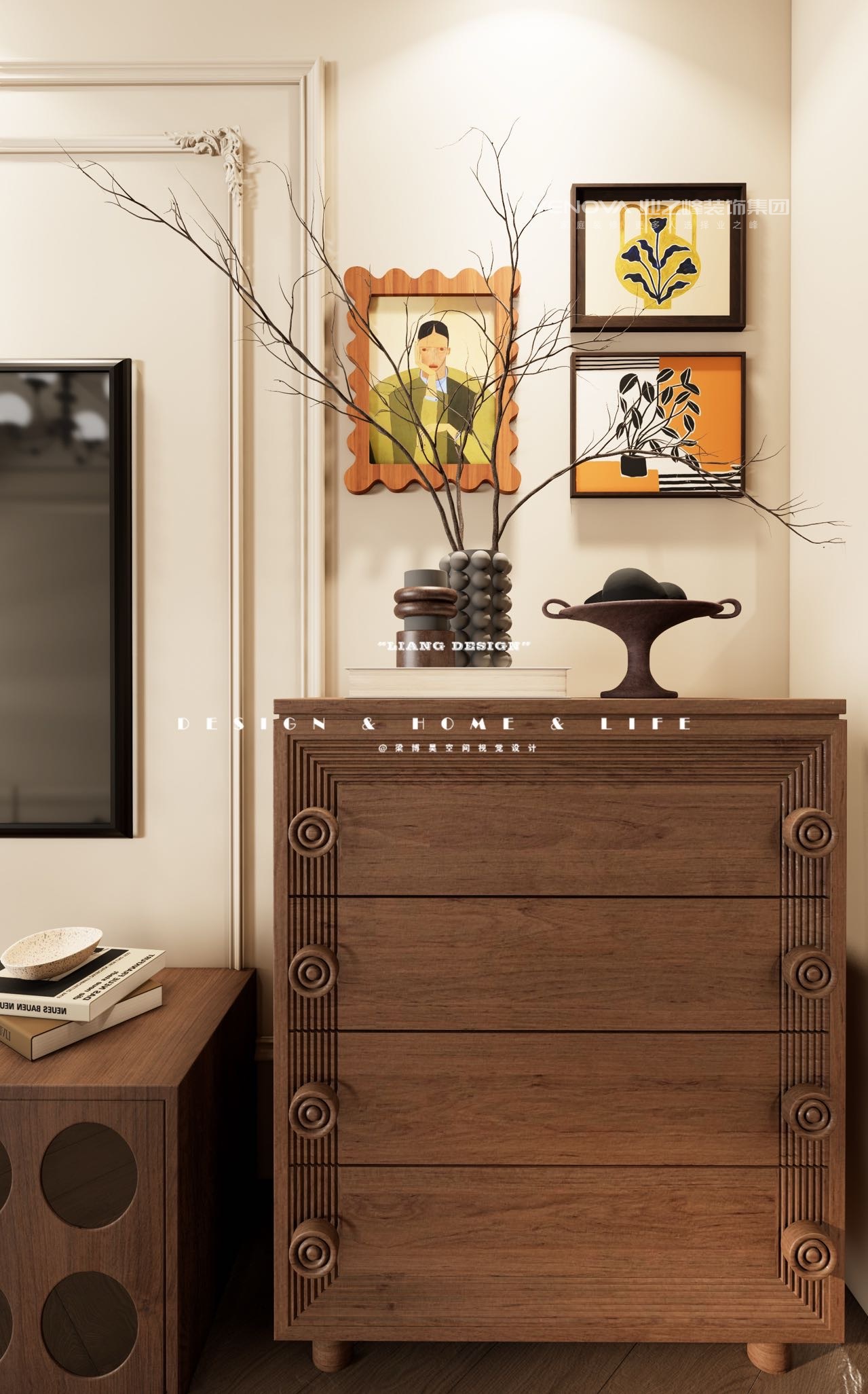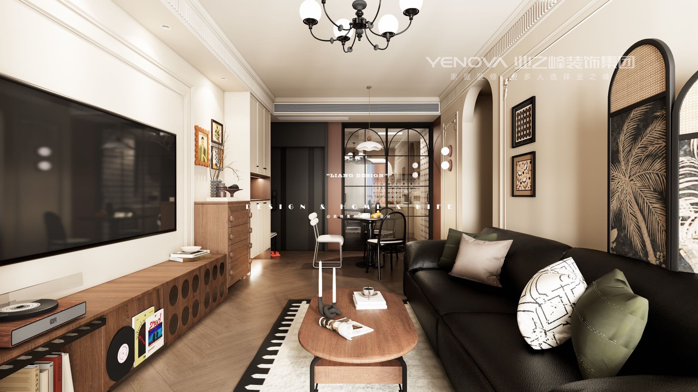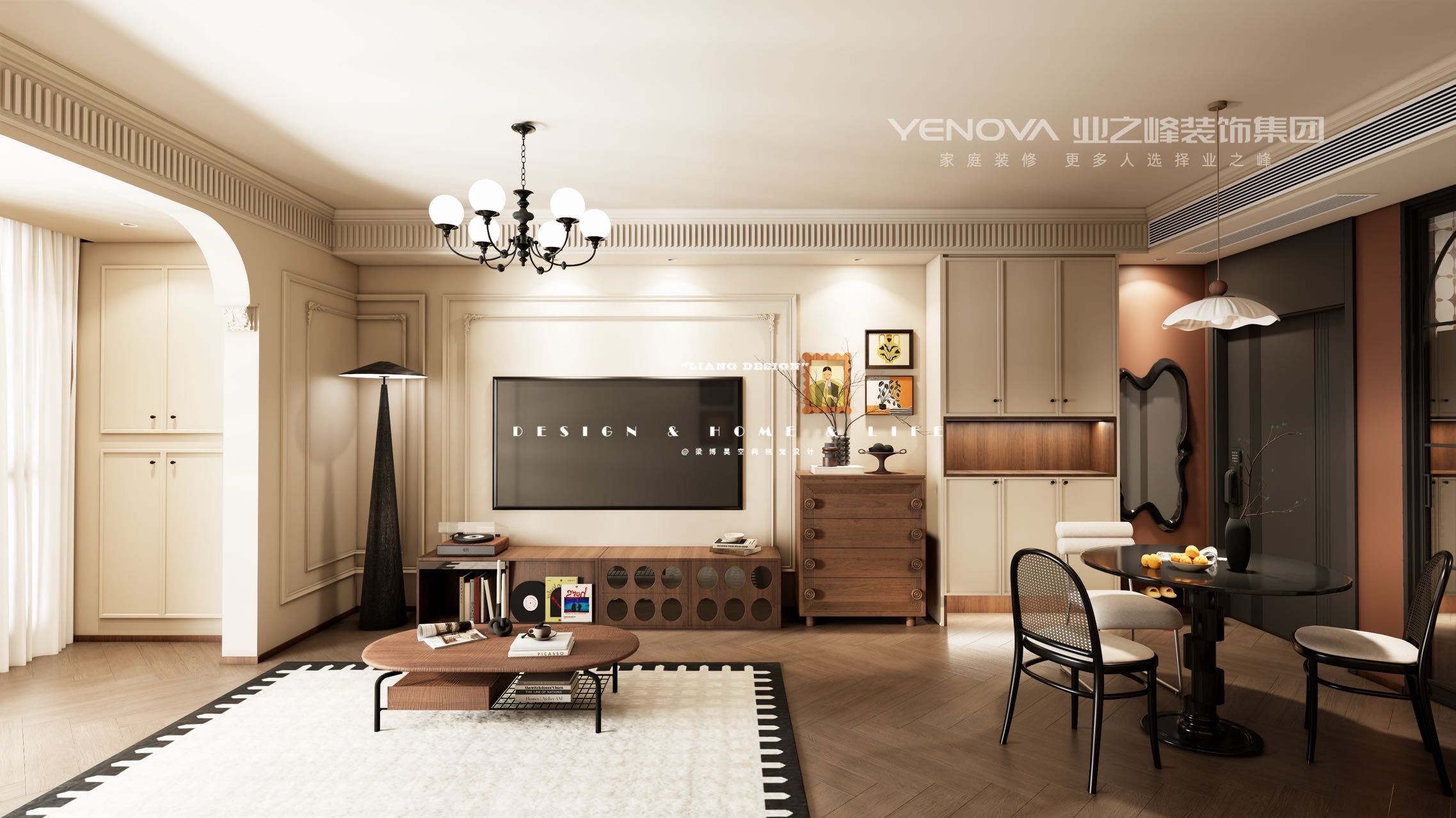 现代中古风,宛如一首悠扬的诗,将空间的大气与细节的精致娓娓道来。空间,在这里被赋予了灵动的生命。一入门,宽敞的布局如同一幅空白的画布,等待着生活的色彩去填充。高挑的天花板,像是天空的延伸,给人无尽的遐想,让心灵自由飞翔。家具的陈列看似随性,却又遵循着某种和谐的秩序,彼此间隔恰到好处,形成一种流畅的空间韵律,人在其中,步履都变得轻盈起来。