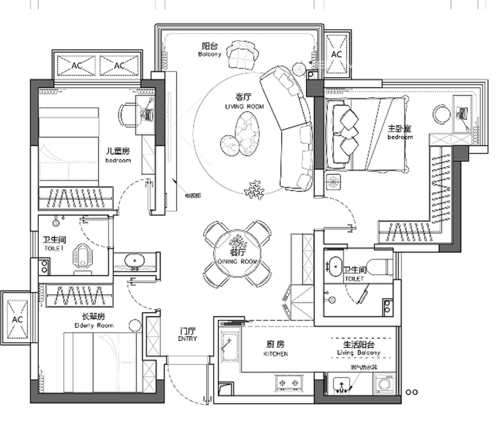 本案业主是一对即将新婚的夫妇,男女业均表示喜欢青春、热情的设计风格,需要独特的风格、房子为自己新婚后婚房使用,偶尔父母也会来居住,喜欢现代家具和电器,有石材和木材的搭配。优化空间的使用效率,预留儿童房和长辈房。