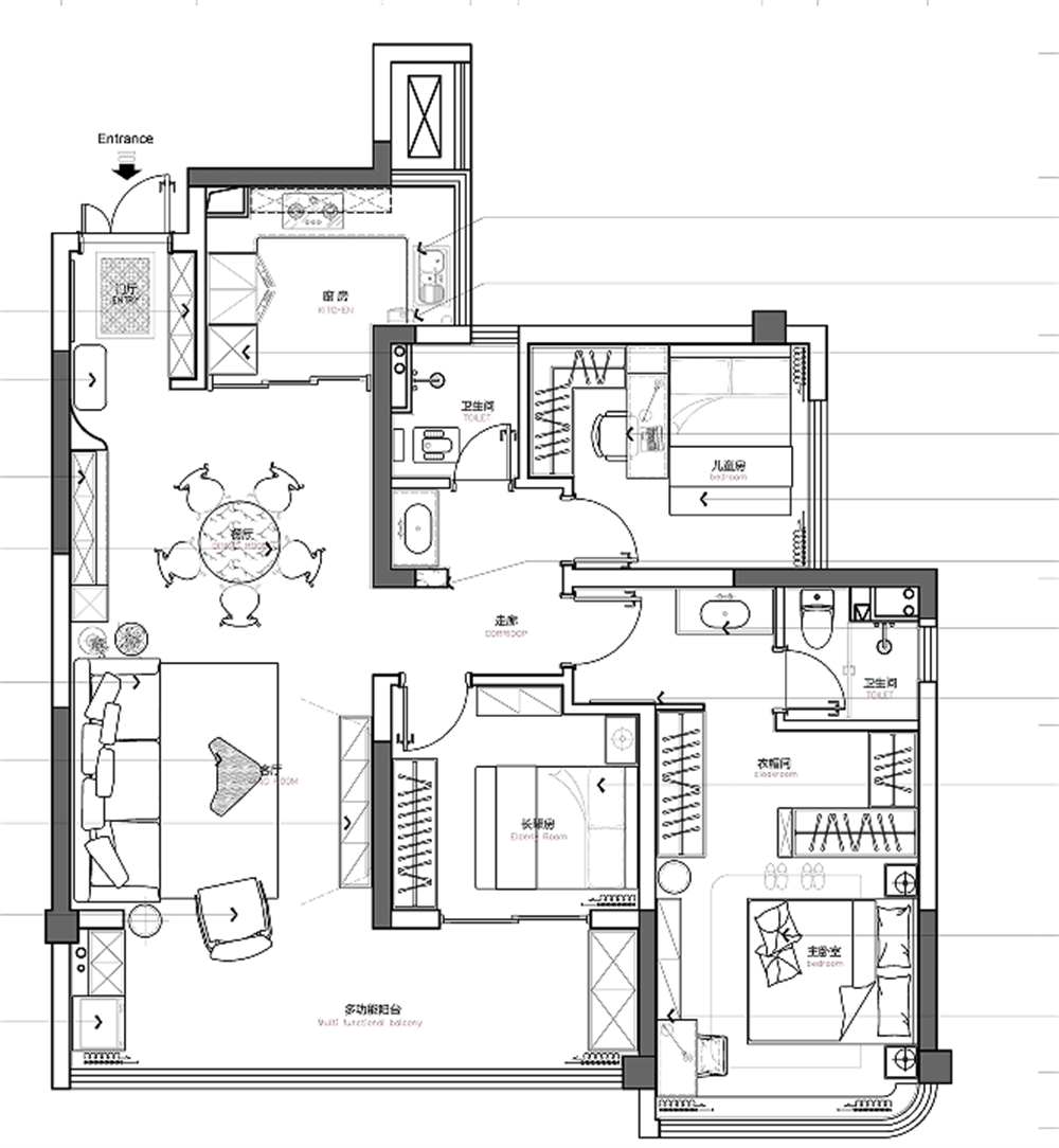空间规划:主卧增设独立衣帽间,满足收纳需求;优化过道走廊动线,提升使用效率;预留儿童房与长辈房,适应未来家庭变化。