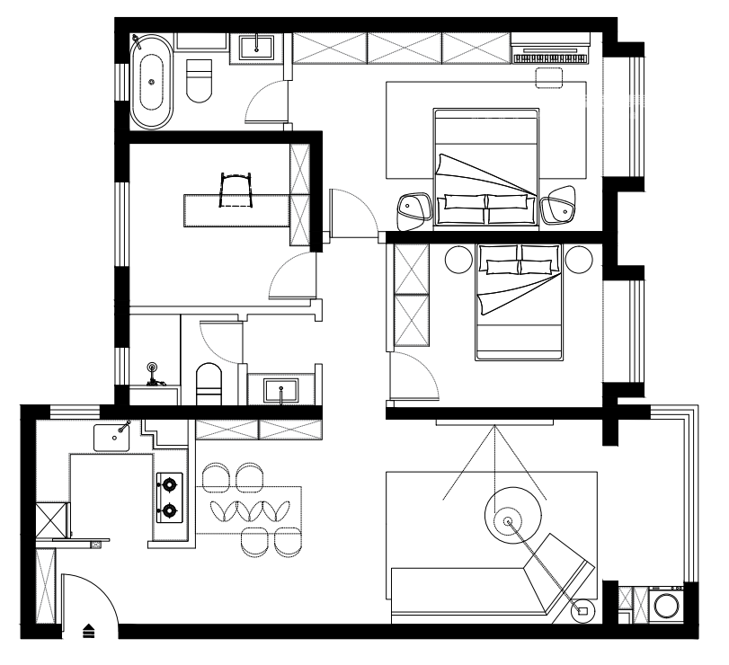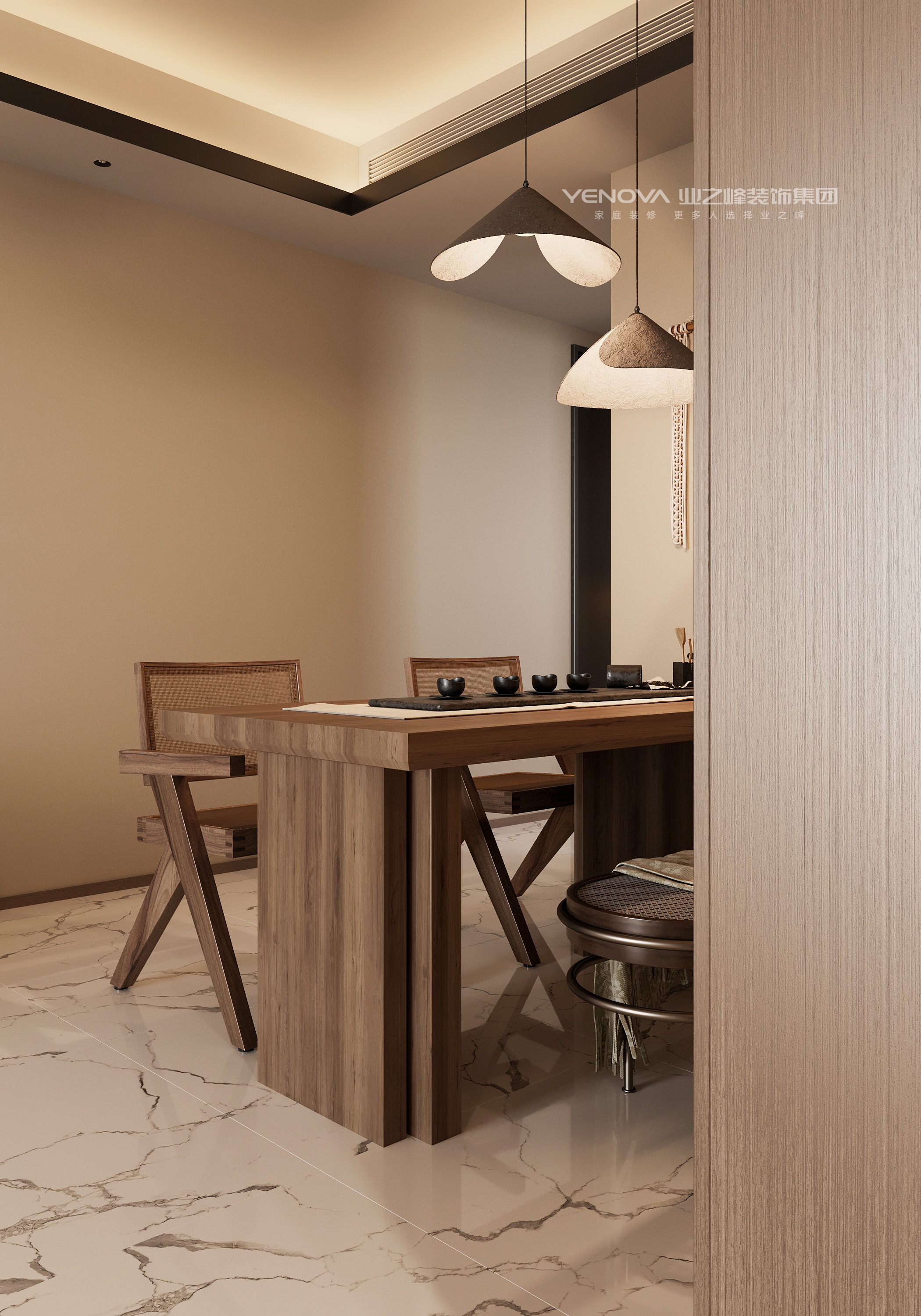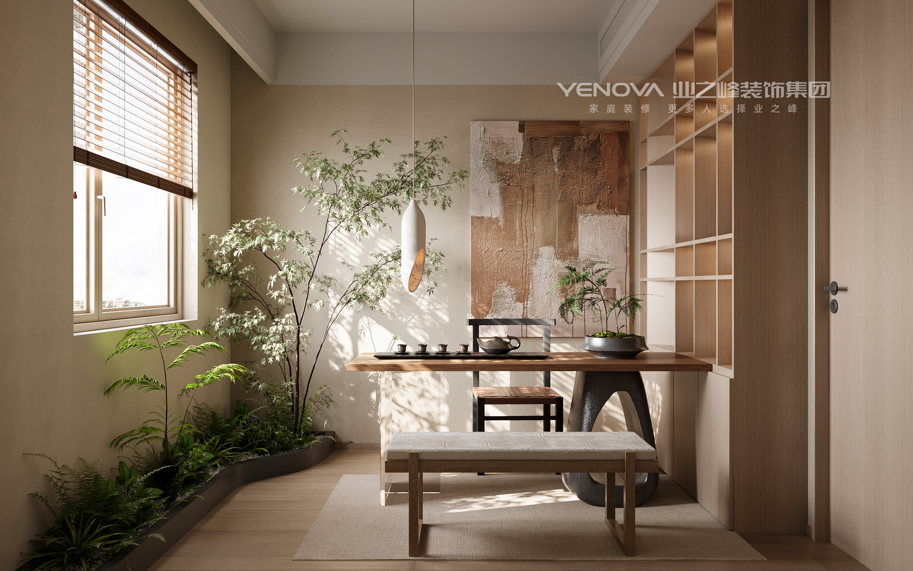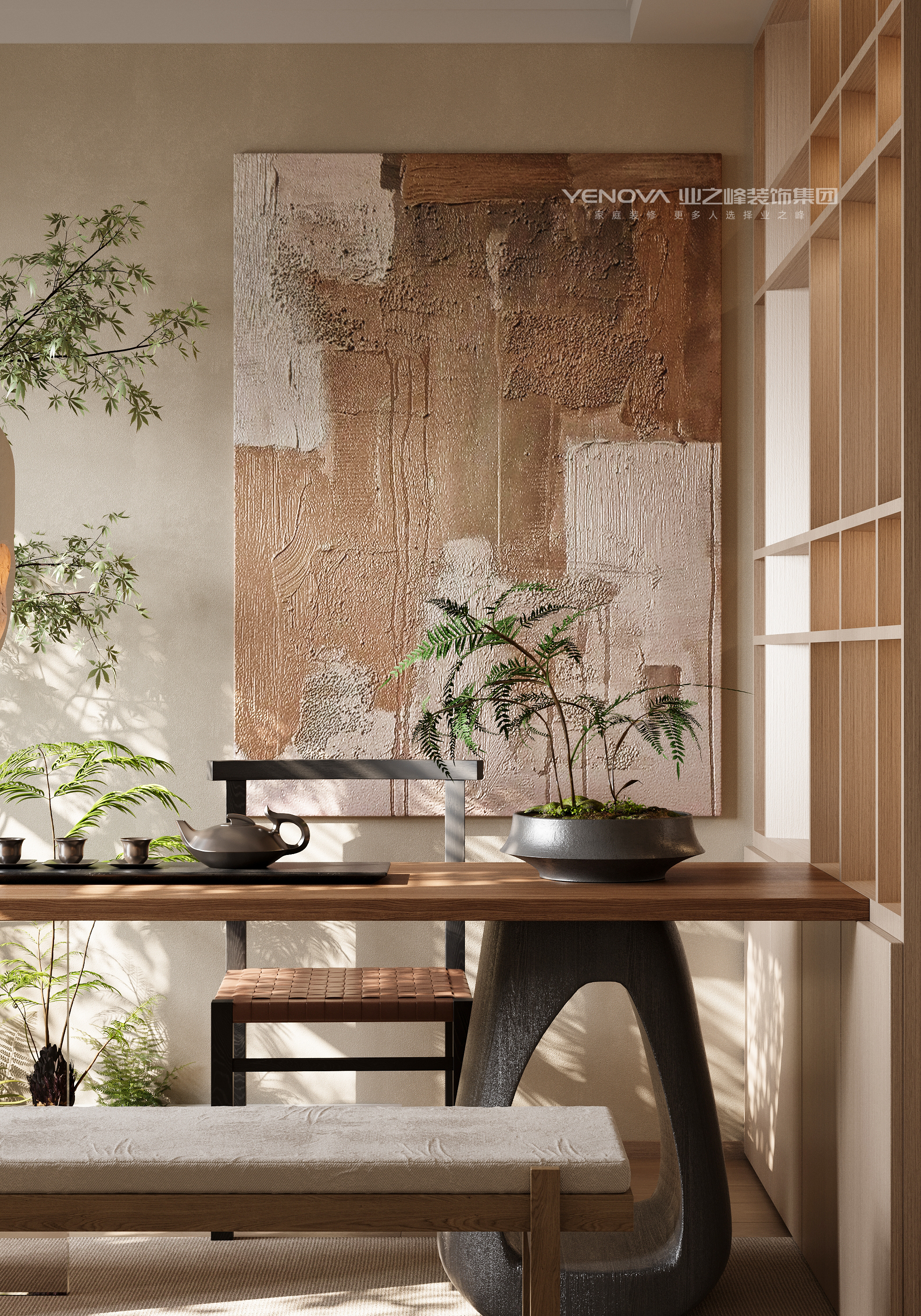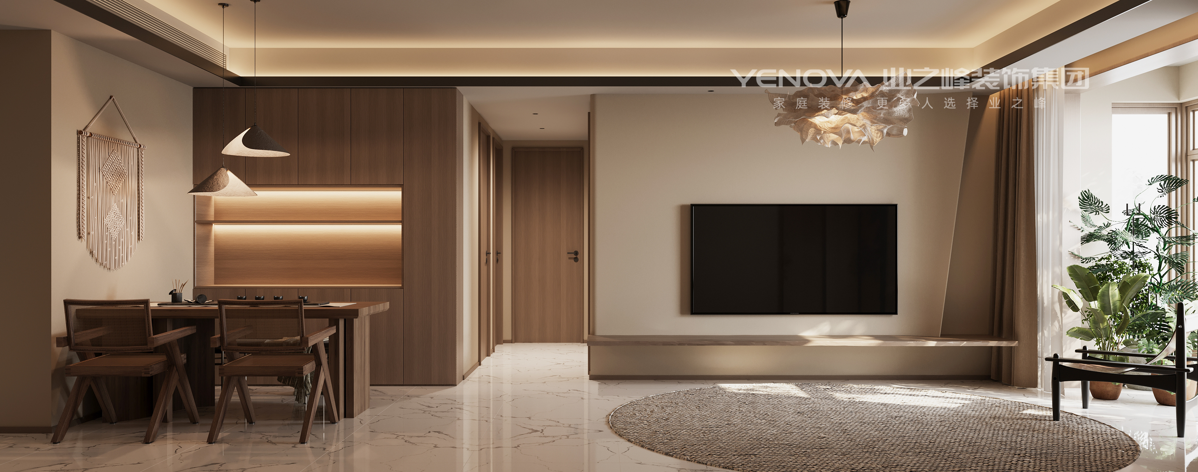 宋式美学的精髓,在于 “删繁就简,返璞归真”,它不追求浓墨重彩的堆砌,而是于朴素中见风雅,于平淡中藏深意。这份审美哲学延伸至居家设计,便成了一场对生活本真的回归 —— 暖调柔光裹着松弛的空气,米褐与原木织成温柔的肌理,让空间成为日子舒展的容器,复刻宋代文人 “闲雅自适” 的生活意境。材质的选择是宋式美学的根基,亦是空间温柔感的来源。摒弃冰冷的工业材质,以米褐亚麻织物包裹沙发,蓬松柔软的触感让人不自觉深陷其中,恰如宋代文人对 “舒适自洽” 的追求;原木家具贯穿全屋,保留木材天然的纹理与结节,带着阳光与草木的气息,与藤编灯的自然肌理相映成趣。藤编的镂空设计让光线透过时形成斑驳的影,在墙面与地面缓缓流动,没有强烈的明暗对比,只有柔和的过渡,仿佛将户外的天光引入室内,暗合宋画 “虚实相生” 的意境,让空间多了几分慵懒与通透。光影与氛围的营造,藏着宋式美学的 “慢哲学”。暖调柔光并非直白的照亮,而是如薄雾般弥漫在空间里,弱化棱角,软化线条,让每一处角落都显得温润可亲。木墩上摆放的枝叶无需刻意修剪,带着自然的野趣,在柔光中舒展枝叶,与慵懒的灯影交织,时光仿佛在此刻慢了下来。这种 “慢”,正是宋式生活的核心 —— 不疾不徐,不慌不忙,如同宋代文人煮茶论道,在平淡日常中品味生活的雅致。餐边的茶盏留着余温,是生活最真实的烟火气。宋式美学并非脱离生活的空谈,而是将风雅融入日常。没有繁复的装饰,没有艳丽的色彩,只用最朴素的材质、最柔和的光影、最自然的元素,勾勒出生活本真的模样。在这里,沙发的软、藤编的韧、原木的温、枝叶的鲜,都在诉说着 “天人合一” 的理念,让居住者在繁忙的俗世中,找到一处可以卸下疲惫、放松身心的港湾。这份设计,是对宋式美学的现代诠释,它将宋代的审美精神与当代的生活需求相结合,既保留了 “简约雅致” 的核心,又赋予了空间 “松弛舒适” 的现代质感。在这里,日子不再是匆匆赶路的奔波,而是可以静静感受的美好 —— 一盏灯、一杯茶、一缕光、一片叶,都能成为治愈心灵的良药,让居家空间成为藏在烟火里的风雅之地,活出日子最舒展的模样。