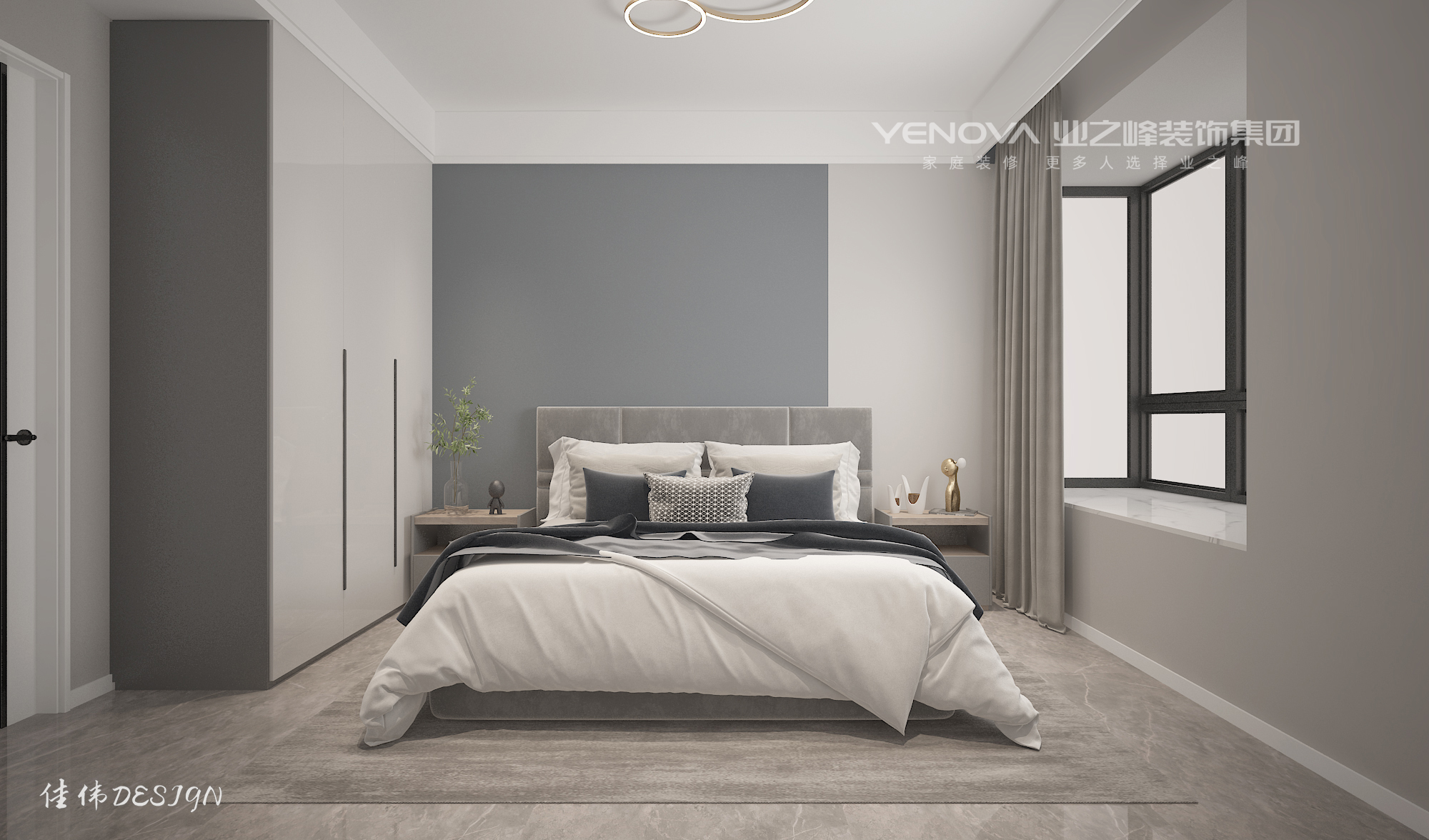 本案为110㎡现代简约风格住宅,以灰色为空间基调,营造理性静谧的氛围。沙发背景墙采用蓝色乳胶漆点睛,形成视觉焦点,打破单调。整体设计强调线条的简洁与材质的纯粹,通过墙面突出造型细节提升层次感,氛围光在简约中蕴含层次与温度,达成功能与美学的平衡。