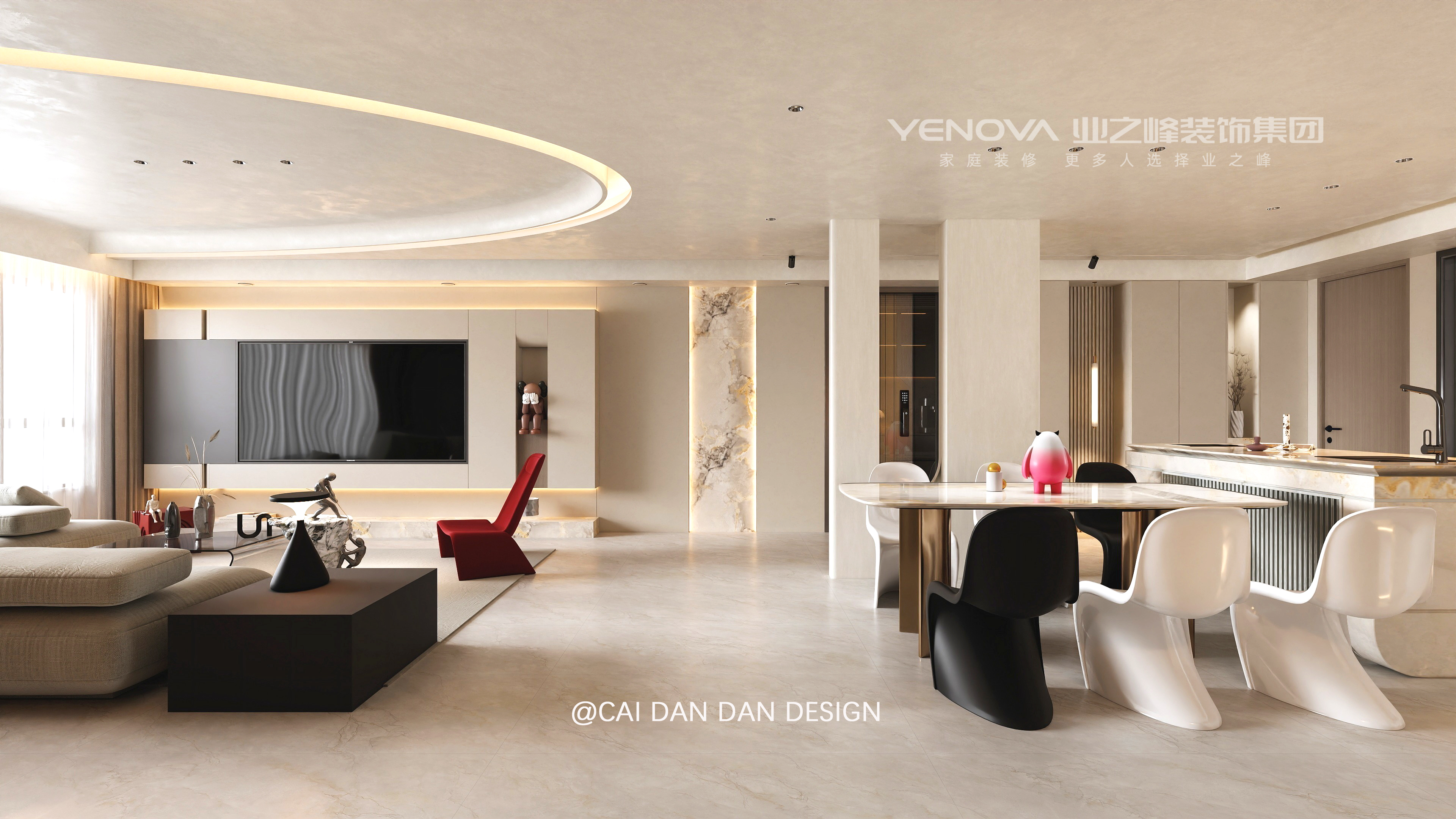 公共区采用开放式布局,弧形吊顶与立柱的内凹圆洞形成呼应,既优化了空间动线,又借内嵌灯带增强层次;客厅以低饱和沙发搭配红色单椅提亮视觉,电视墙融入波纹金属板与潮玩摆件,平衡极简与趣味。餐厨区的岛台选用大理石与弧形收边,玻璃柜 + 内嵌灯的组合让收纳兼具展示性,黑白餐椅则强化了现代感。