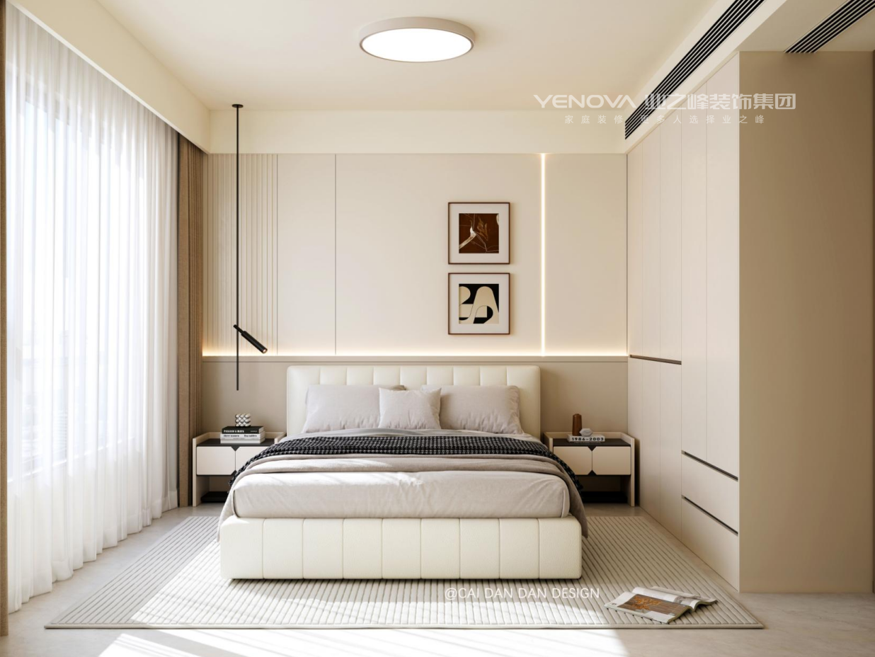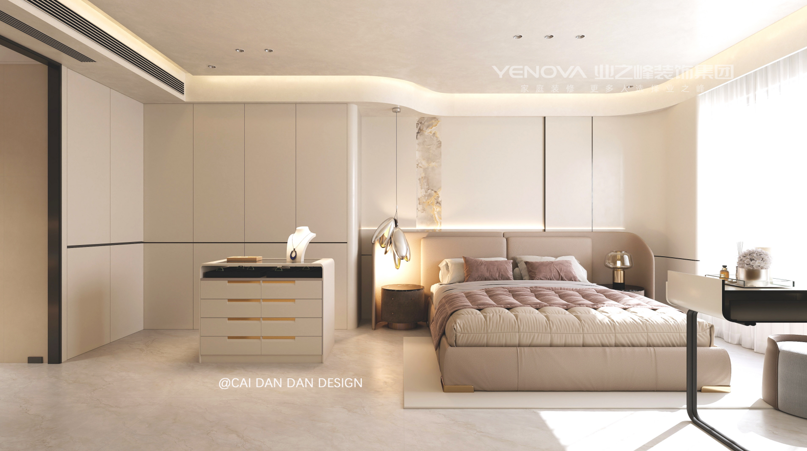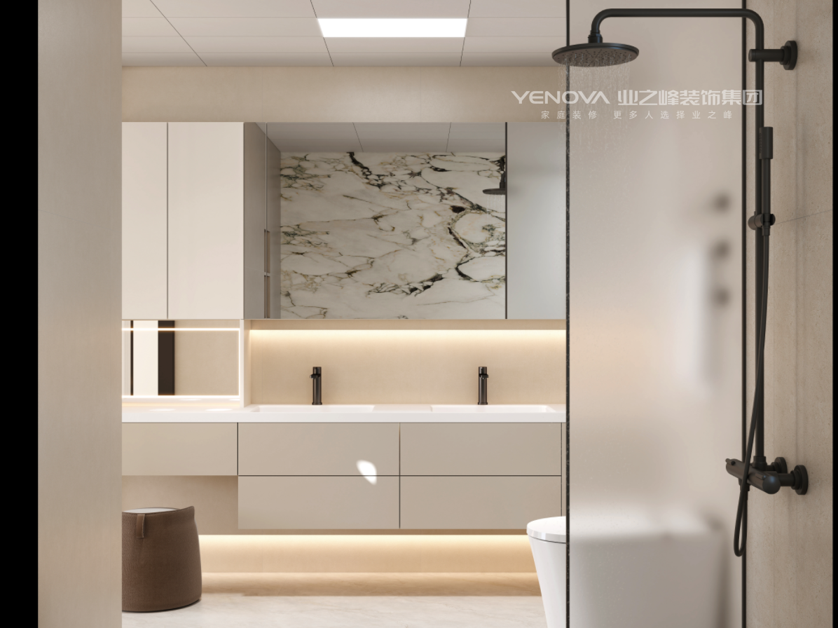 卧室延续柔和基调,弧形床头、悬浮柜与嵌入式灯带结合,配合低饱和床品与艺术摆件,塑造静谧休憩感;卫浴以大理石纹理 + 无主灯设计,实现功能与美学的统一。
