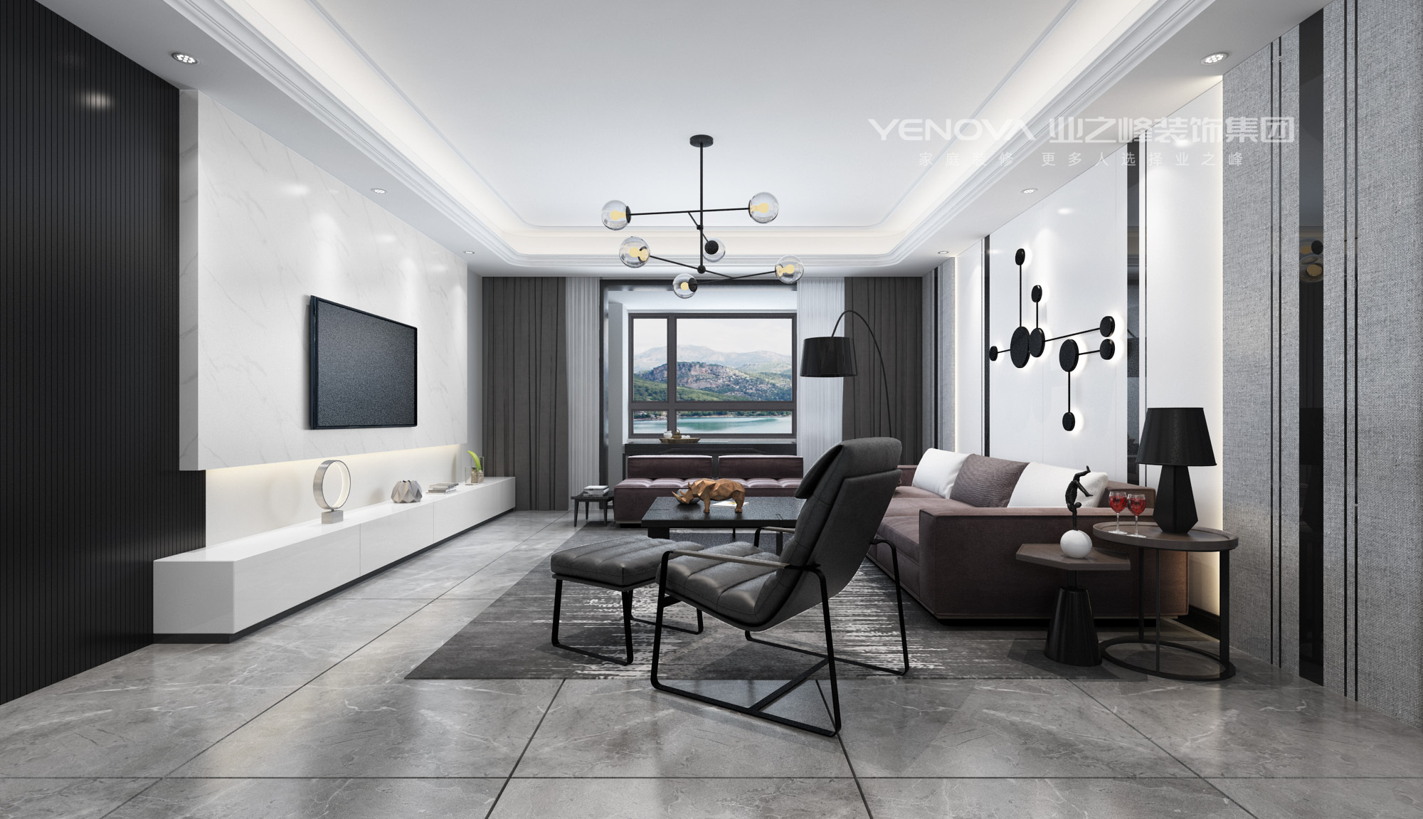 以沙发、茶几、电视墙为核心形成围合式会客区,搭配单人休闲椅与边几,满足多人社交与独处需求;电视墙采用“悬浮式”设计,下方留空便于收纳,上方嵌入电视,线条简洁且节省空间。