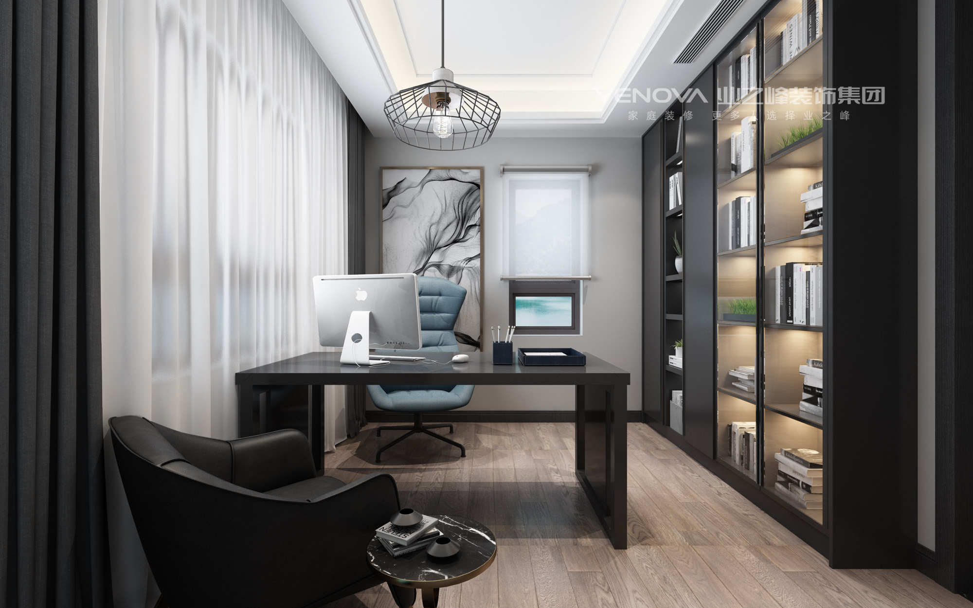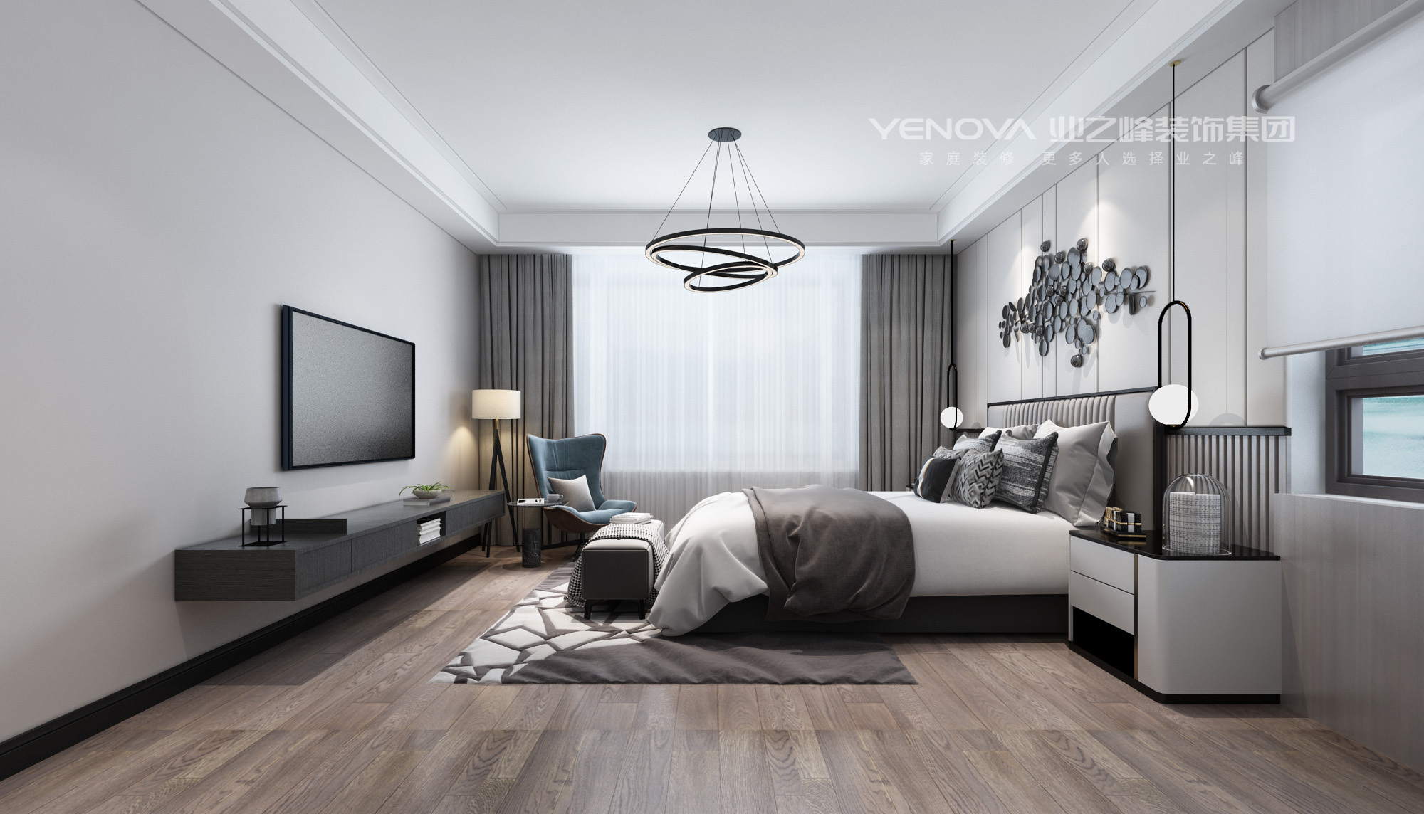 主色调:以低饱和度的中性色为基底(墙面浅灰色乳胶漆、地面浅木色地板、床品米白色),搭配黑色金属线条(床架、吊灯支架、家具框架),奠定沉稳大气的基调。