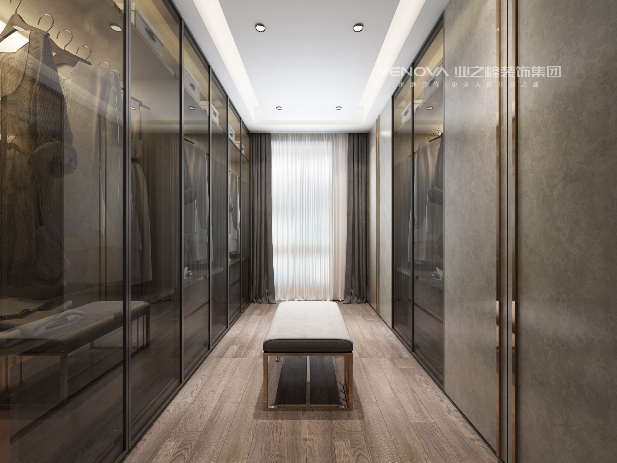 功能分区明确:以挂衣区、叠放区为核心形成围合式收纳区,搭配试衣镜、换鞋凳(如图中长凳设计),满足衣物存放与即时试穿需求;电视墙采用“悬浮式”设计,下方留空便于收纳,上方嵌入电视,线条简洁且节省空间。