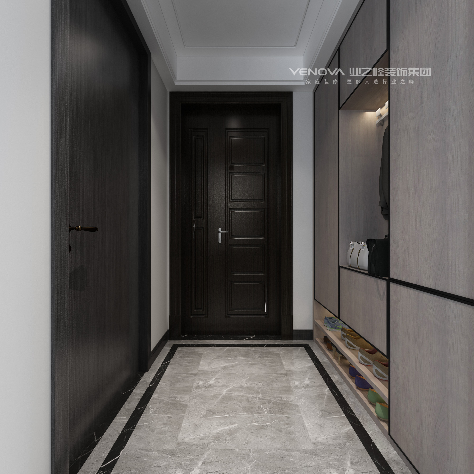 空间呈狭长型,左侧为入户门区域,右侧为储物与展示区,中间地面铺设浅灰色地毯,划分出“过渡地带”,引导视线延伸至室内深处。门后设置挂钩(左侧墙面),方便挂放外套、包包等随身物品,提升使用便利性。