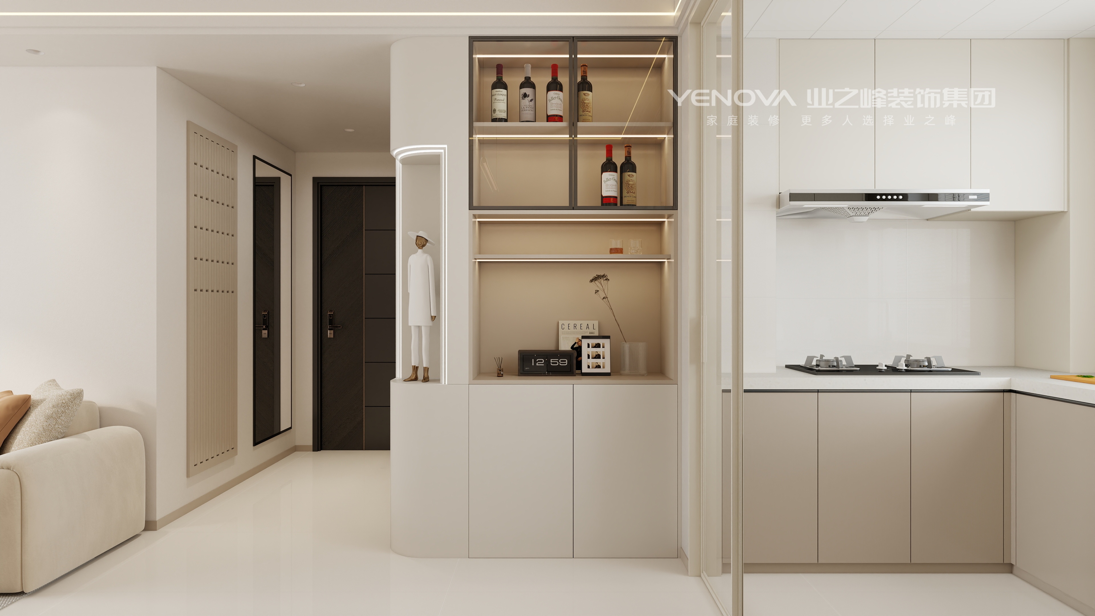 适配全龄段的居住定制奶油色酒柜与餐边柜一体化设计,玻璃柜门+内嵌灯带展示藏品,黑色金属框架做细节勾勒,兼顾收纳与颜值。同时融入个性化细节让空间更具生活温度。
