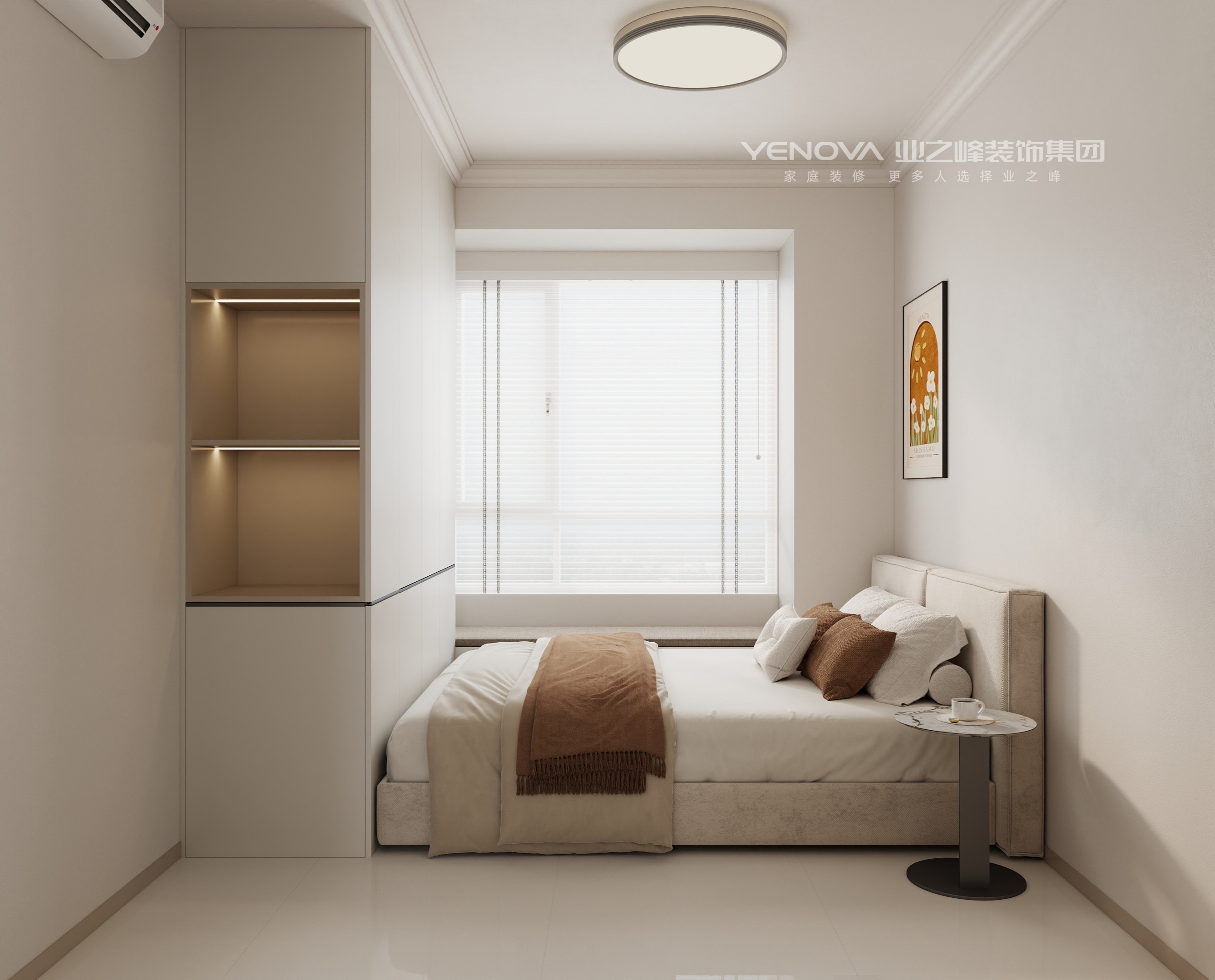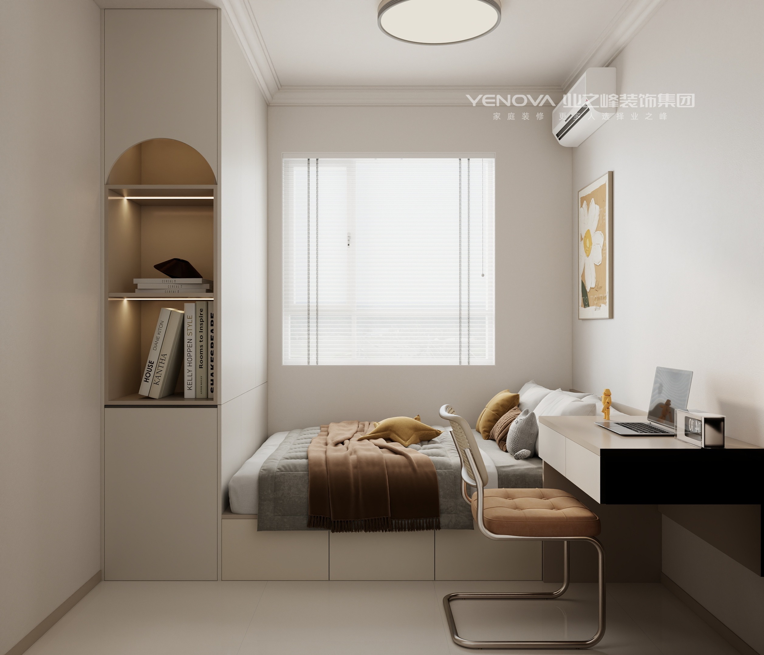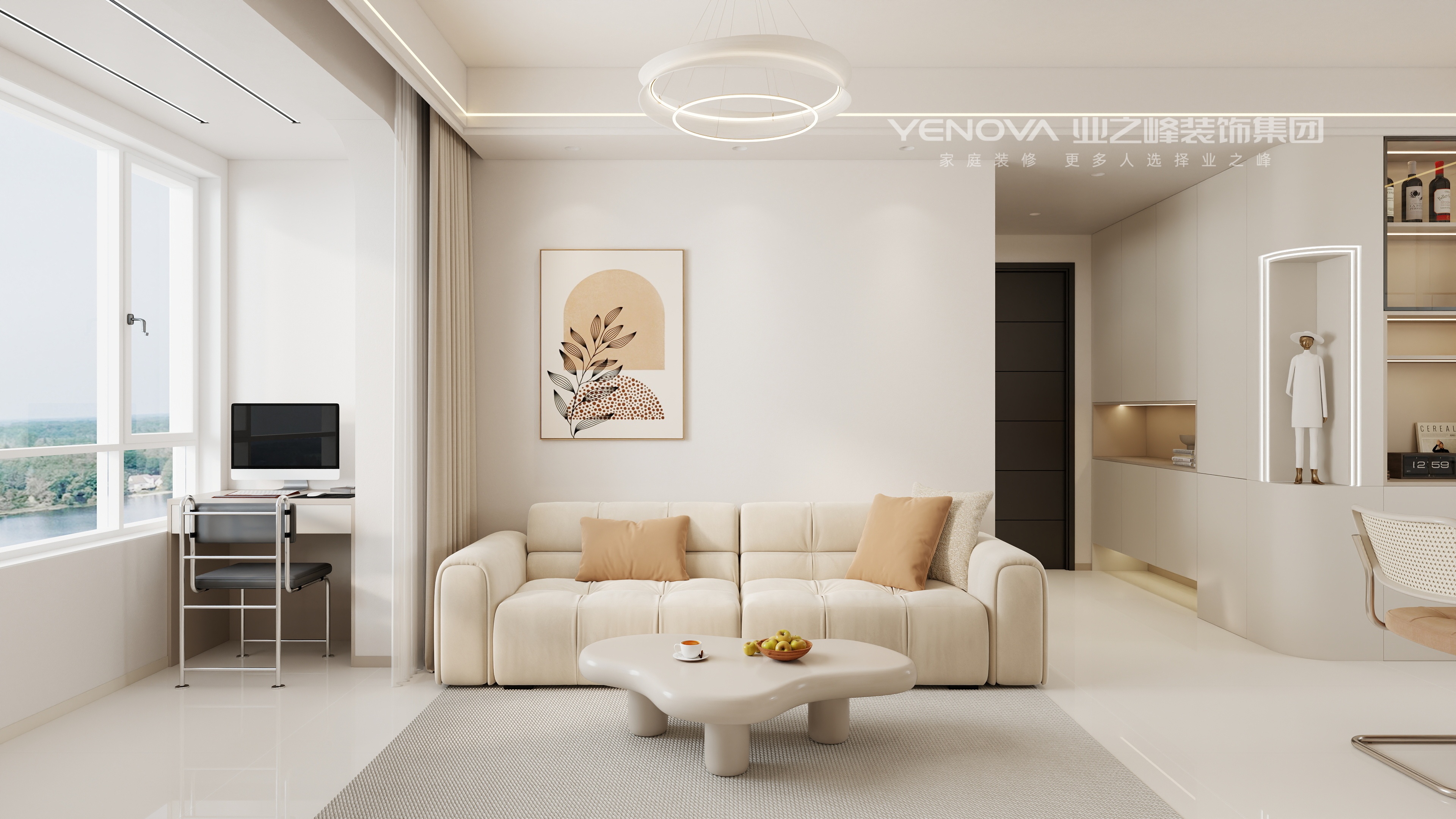 以奶油白、浅杏色、米咖色为空间主基调,通过同色系不同明度的色彩层次,营造温润治愈的视觉氛围,仅用黑色金属件、焦糖色软装做少量点缀,避免色调单调。