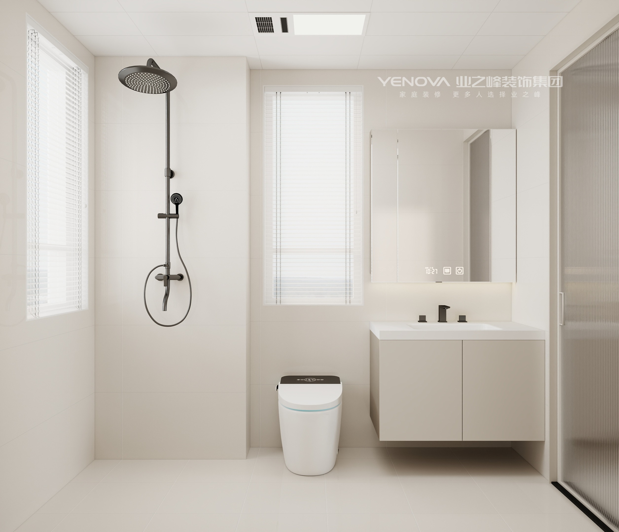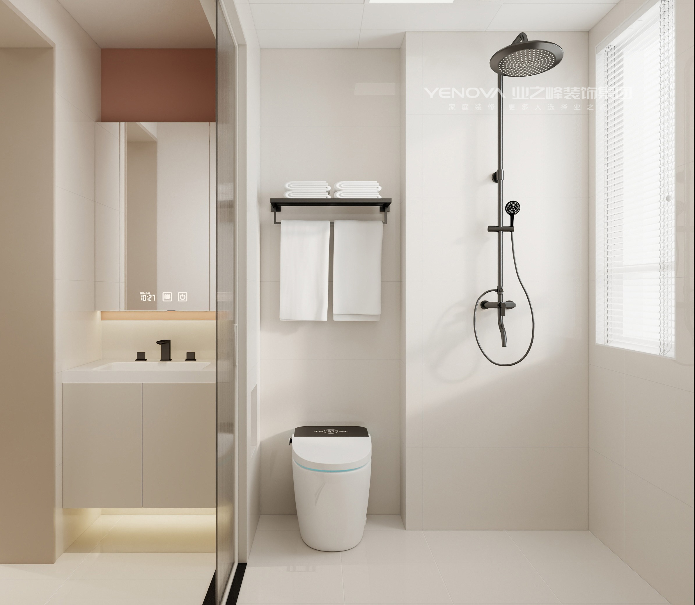 墙面与地面通铺柔光奶油色瓷砖,黑色金属卫浴五金做对比点缀,智能马桶、镜柜收纳等设计保证实用,在简约风格中兼顾功能性。
