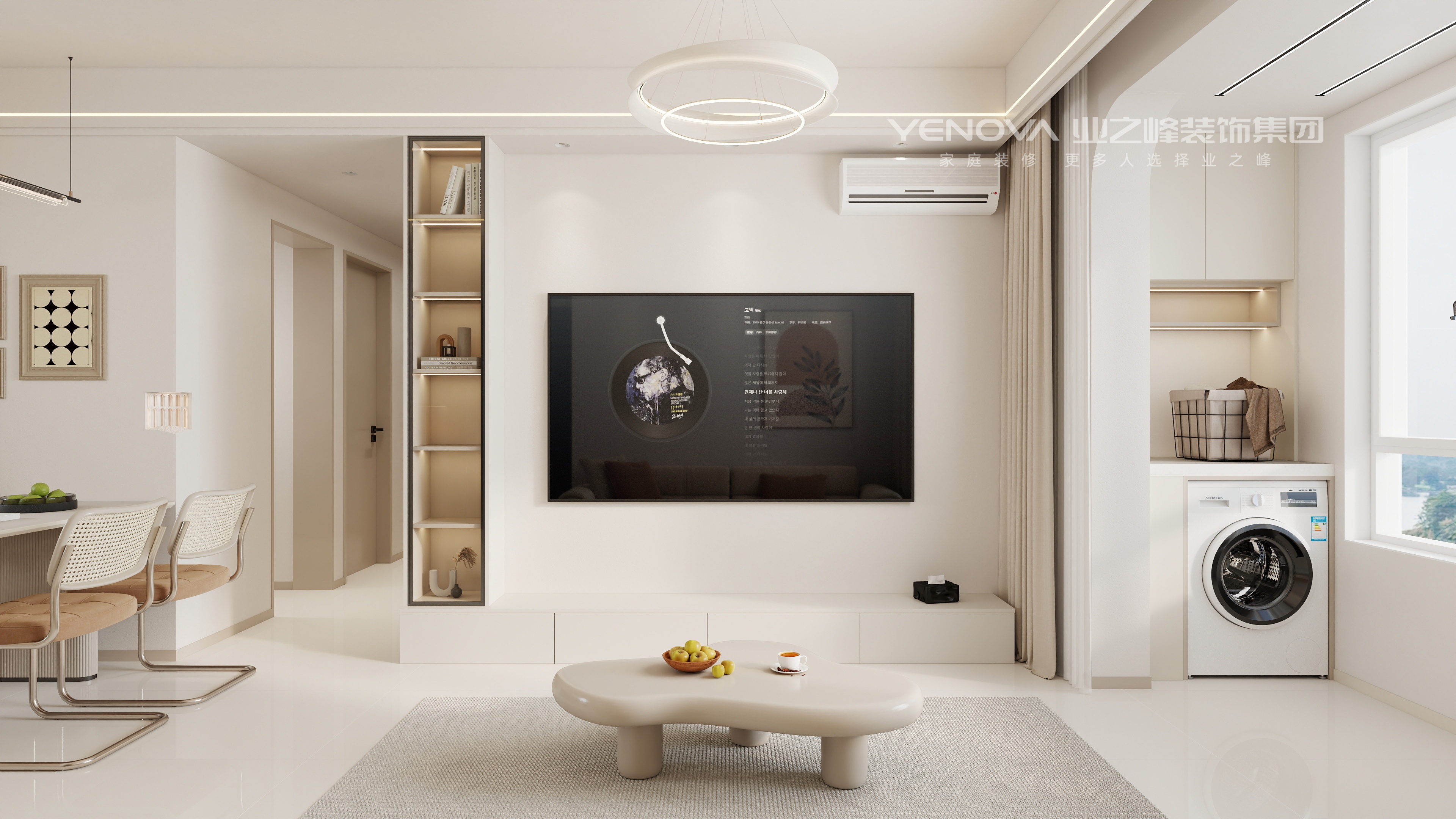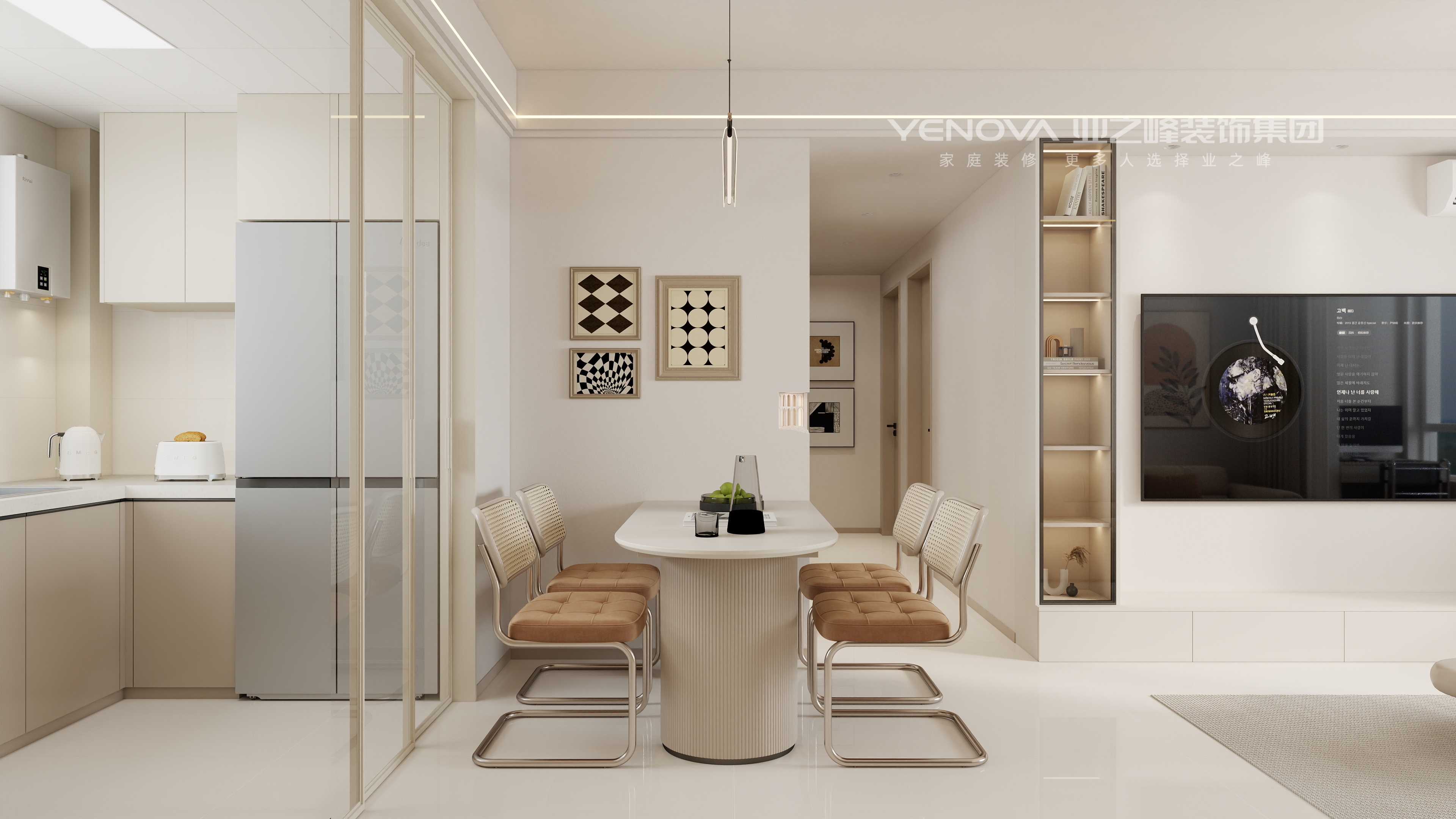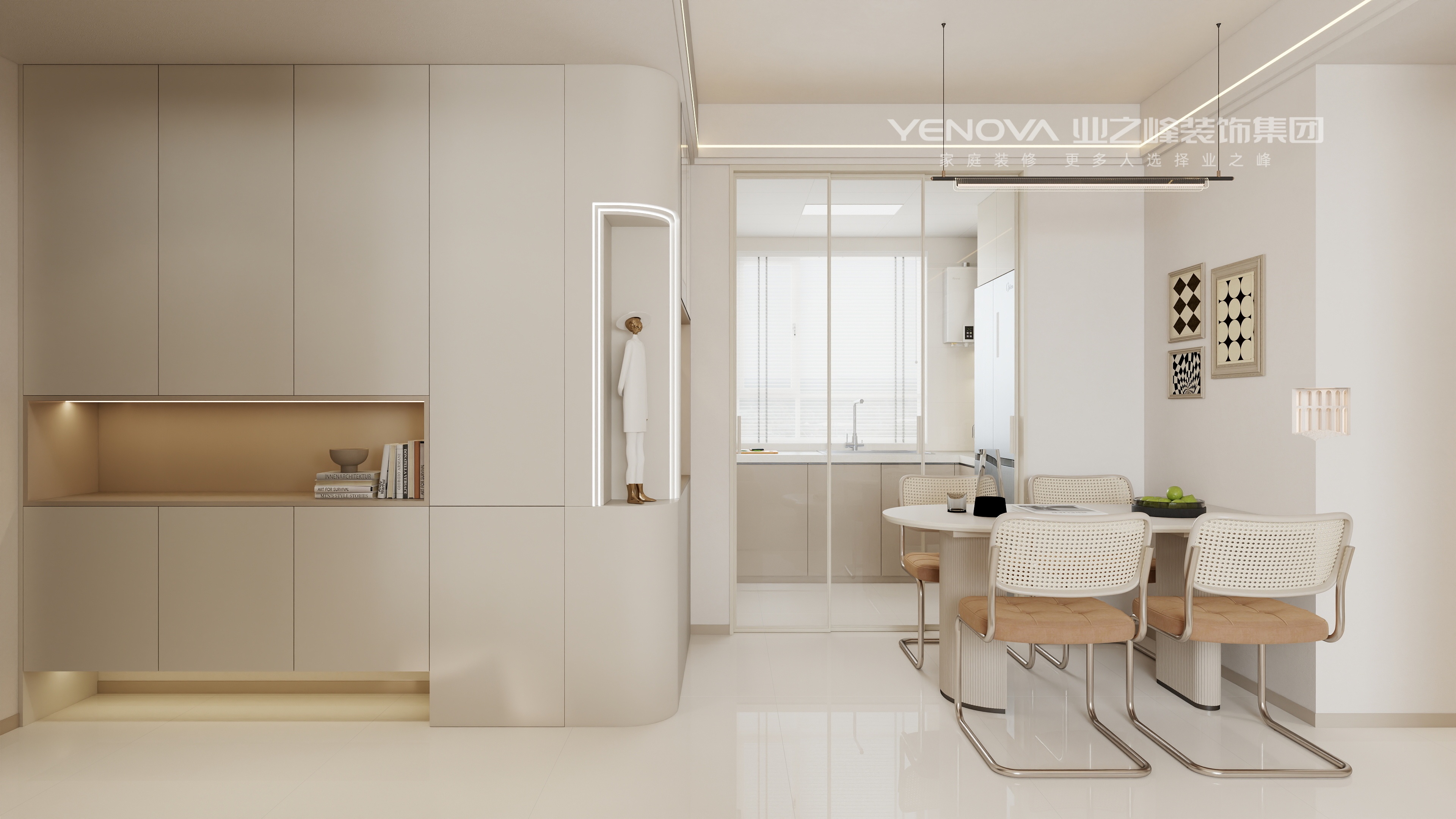一体化收纳柜体、嵌入式家电等设计,在奶油风的美学框架内,满足现代家庭的收纳与使用需求。同色系低饱和色调的运用,让空间视觉柔和统一,少量对比色点缀则让空间更具记忆点。