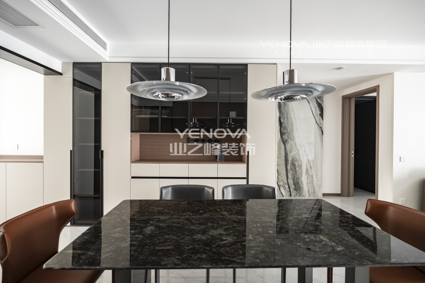 居住需求:本案房子为一家三口居住,客户夫妻在外地工作定居,西安这套房子是装好以后等孩子上学回来长住,客户也是业之峰的回头客了,家人几套房子都是公司装的,客户整体喜欢高级感,所以我主打意式风格+现代简约的元素,因为客户夫妻比较年轻,不想太过于成熟厚重感,户型原本4室4叶草布局,家人卧室不需要太多,加上厨房面积过于小,所以把厨房与小卧室打通做了中西厨结合,增加了西厨的功能,客户想要浴缸,我把主卫面积改造打了,压缩了一点主卧的面积空间,把主卫增加了浴缸区域,让客户的生活品质瞬间提升,全房750*1500的大理石连纹瓷砖让整个空间通透大气,墙面多采用了混油胡桃木纹色的墙面来点缀体现高级感,电视墙运用了岩板+展示柜的设计手法来体现档次与生活气息,尤其入户门正对的端景墙,用一块奢石来做端景,把整个装修档次拉满,胡桃木纹墙板,岩板,大理石瓷砖,氛围灯光的结合,让简约而不简单体现的淋漓精致~~~