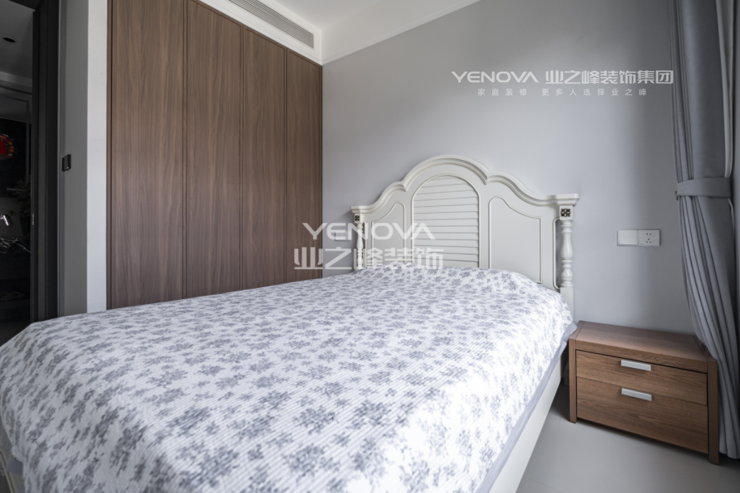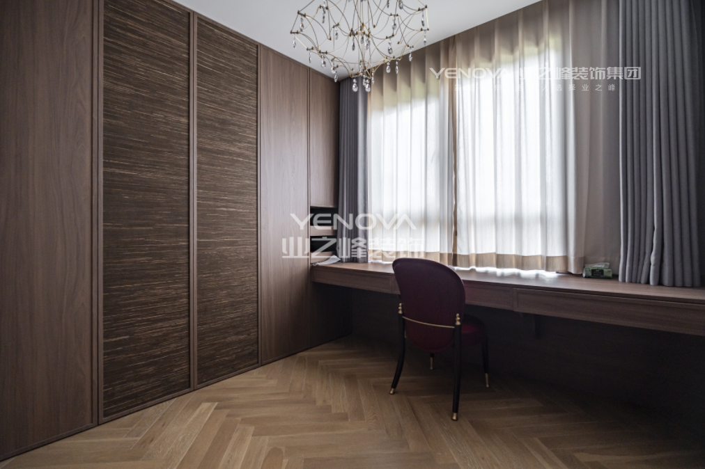 卫浴间以深灰门板 + 岩板台面形成对比,镜柜内置灯光提升实用与氛围感,藤编收纳筐则增添自然肌理;卧室通过不同风格适配居住需求 —— 既有带雕花床头的柔美元素,也有莫兰迪色调 + 简约软包的静谧质感;书房以木饰面通顶柜实现收纳与美观统一,人字拼地板与丝绒椅的组合,让办公区兼具温度与精致度。