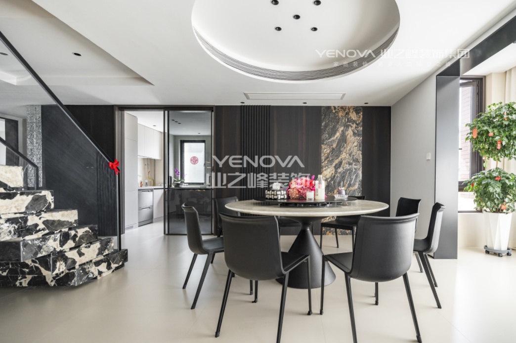 公共区域(客餐厅)采用 “黑白灰 + 木色” 的中性配色,搭配大理石纹理的视觉焦点墙,既保持极简的利落感,又以金属线条、水晶吊灯等元素点缀轻奢细节;开放式布局联动厨房与餐厅,圆形餐桌与悬浮楼梯的设计,进一步强化空间的通透与互动性。