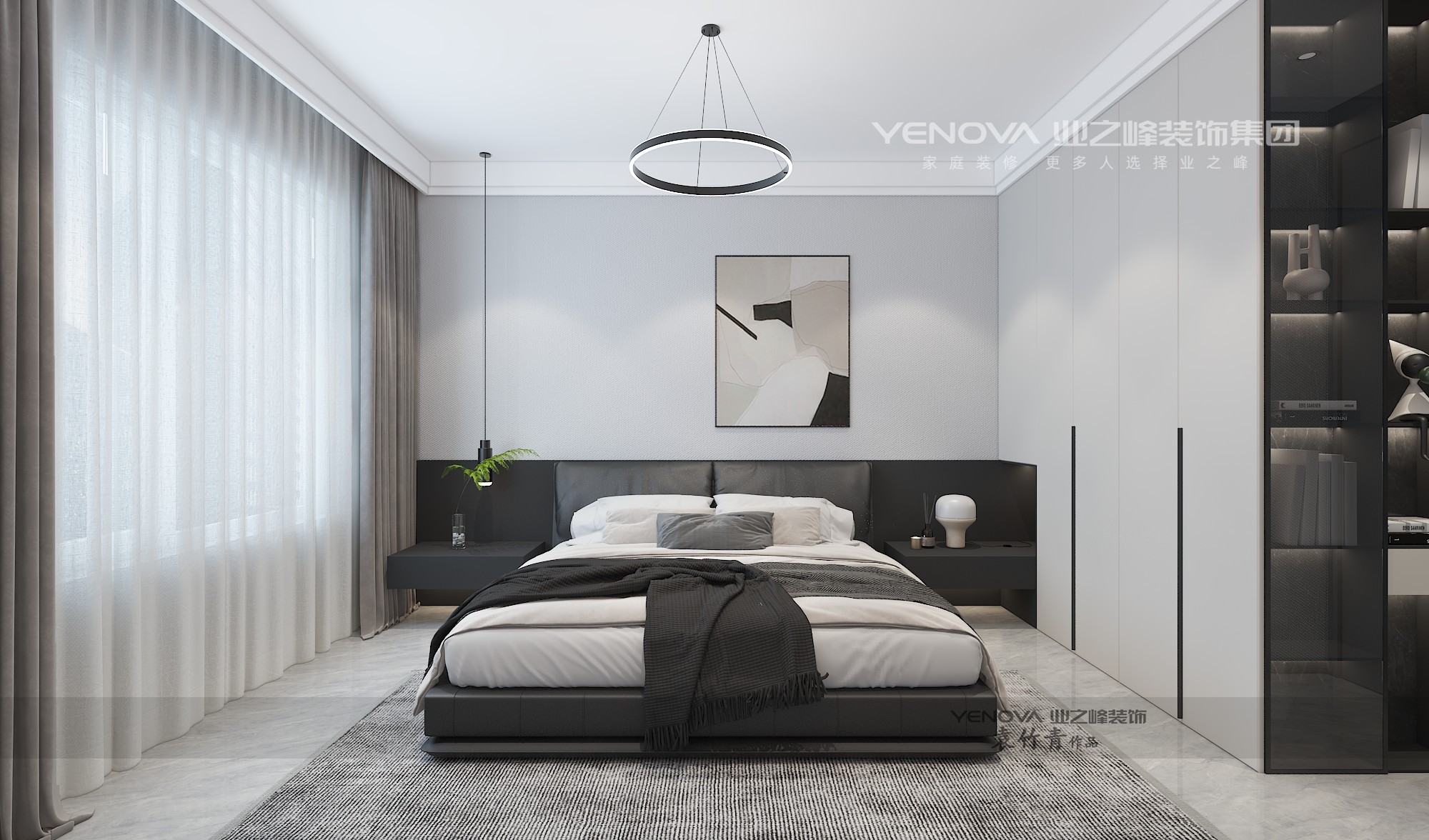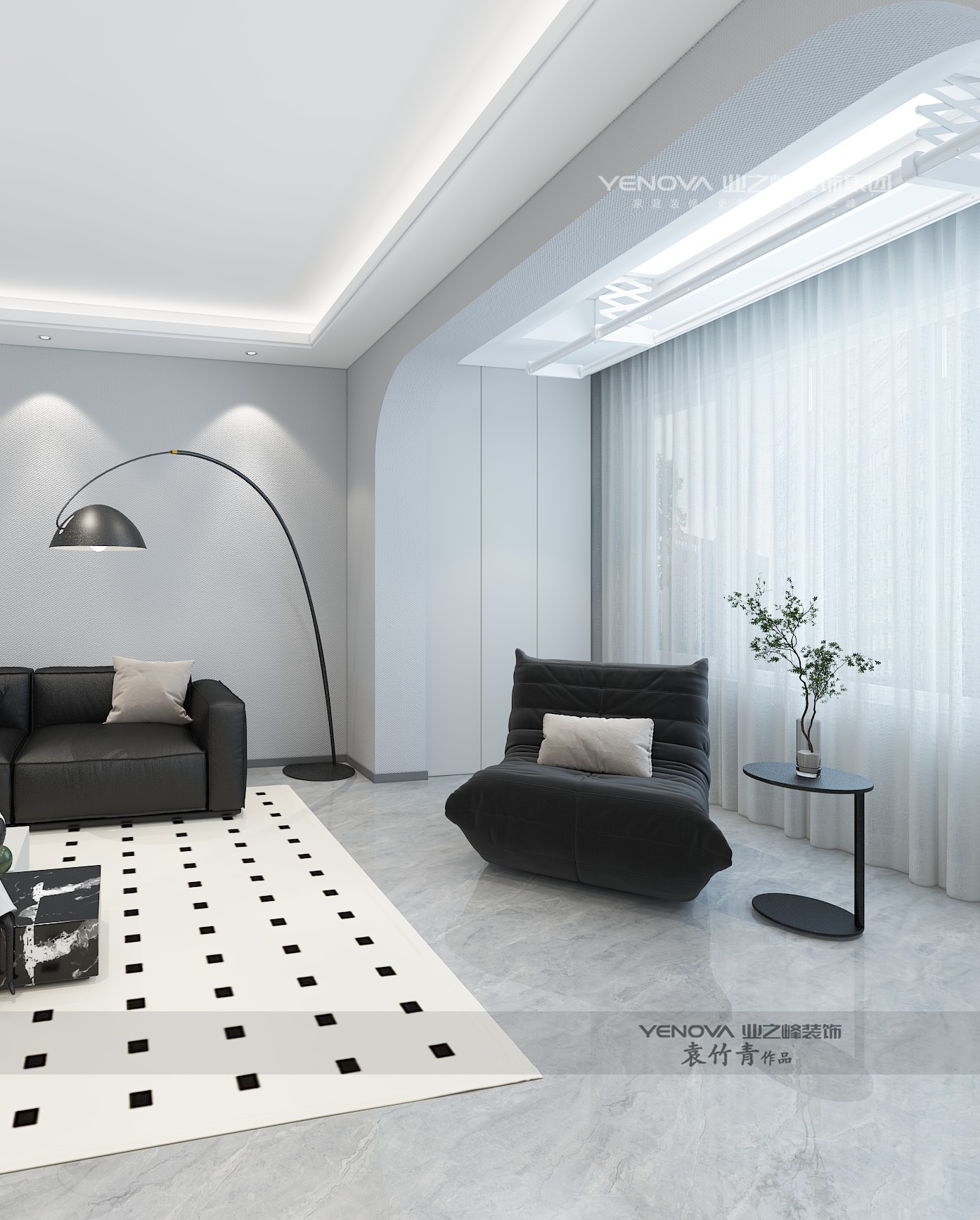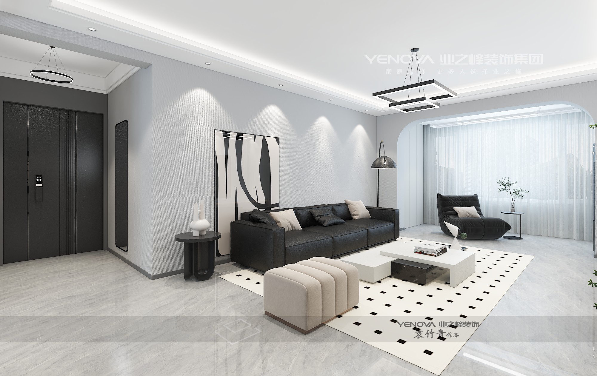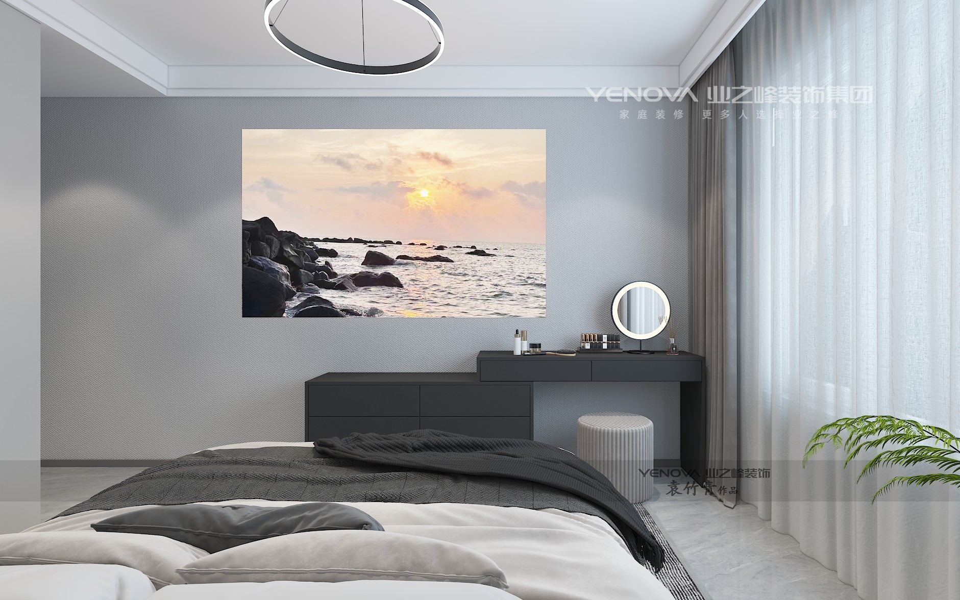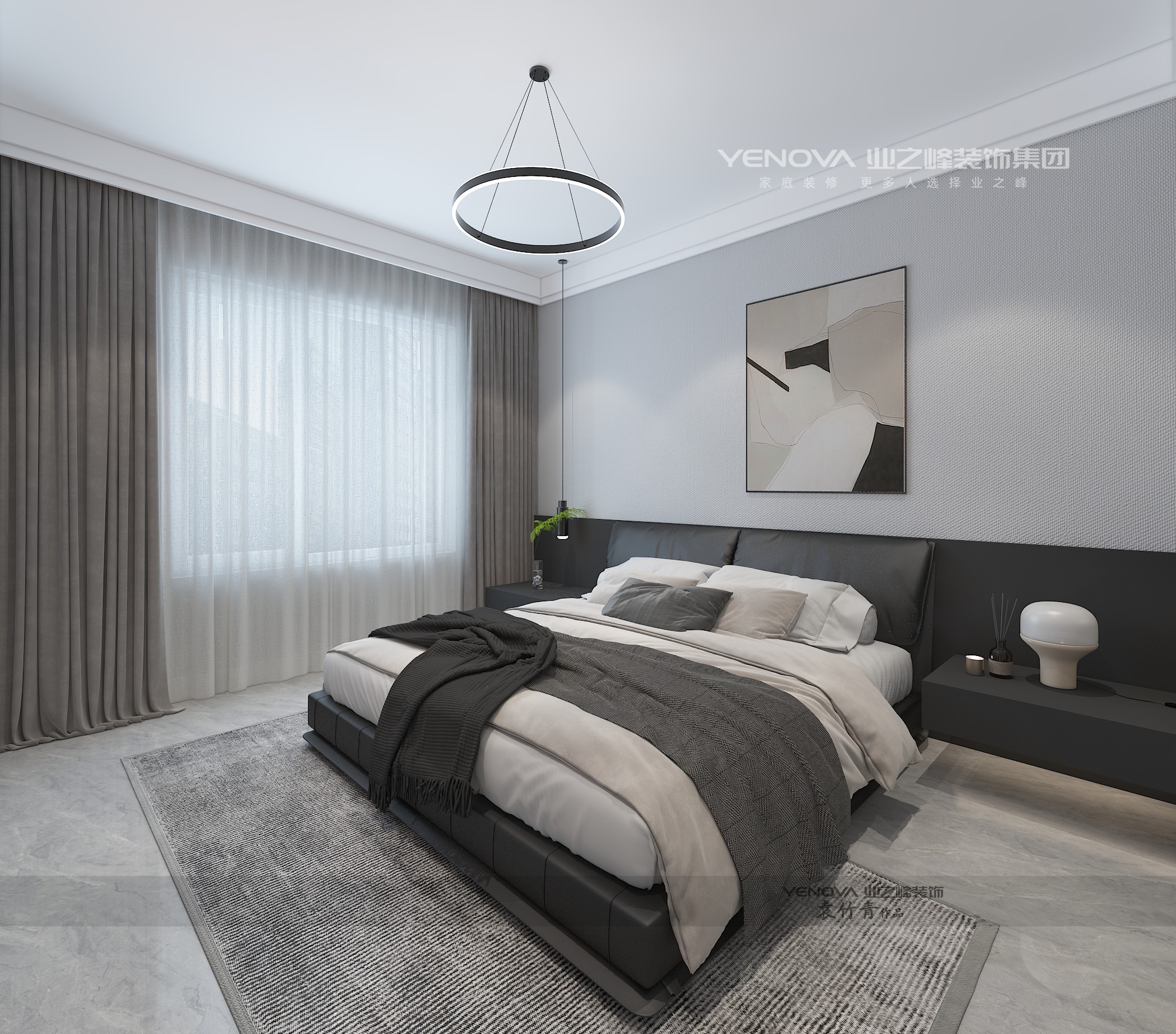 本方案是爱达九溪设计,现代简约黑白灰配色,黑白灰配色不是冰冷的色块堆砌,而是用克制的灰度调和黑白的锐度,为家装留出呼吸感。摒弃繁复纹样,以不同明度的灰作基底,浅灰铺陈墙面温柔包容,深灰勾勒柜体线条利落,黑白则作为点睛之笔——玄黑的金属拉手、皓白的棉麻窗帘,在灰度空间里碰撞出低调张力。