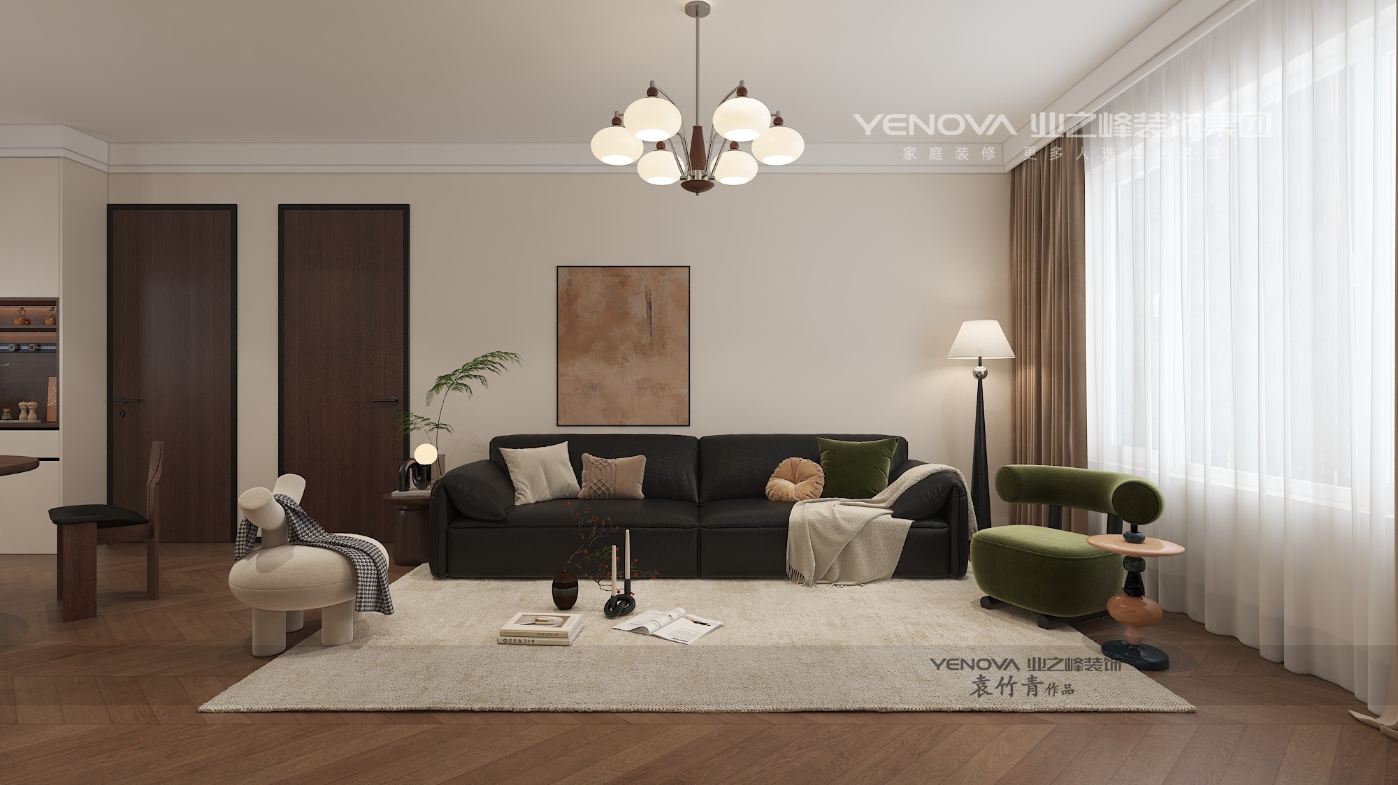 本方案是华尚万象设计,中古风,是功能主义的诗意。它以“形随机能”为骨,让每一道曲线都服从于手感与光影。空间里,是胡桃木的温润与金属冷光的并置对话,也是宝石蓝、橄榄绿等高纯度暖调在中性背景上的理性跳跃。它并非单纯怀旧,而是在包豪斯的理性框架内,进行一场关于材质、色彩与有机线条的感性漫游。