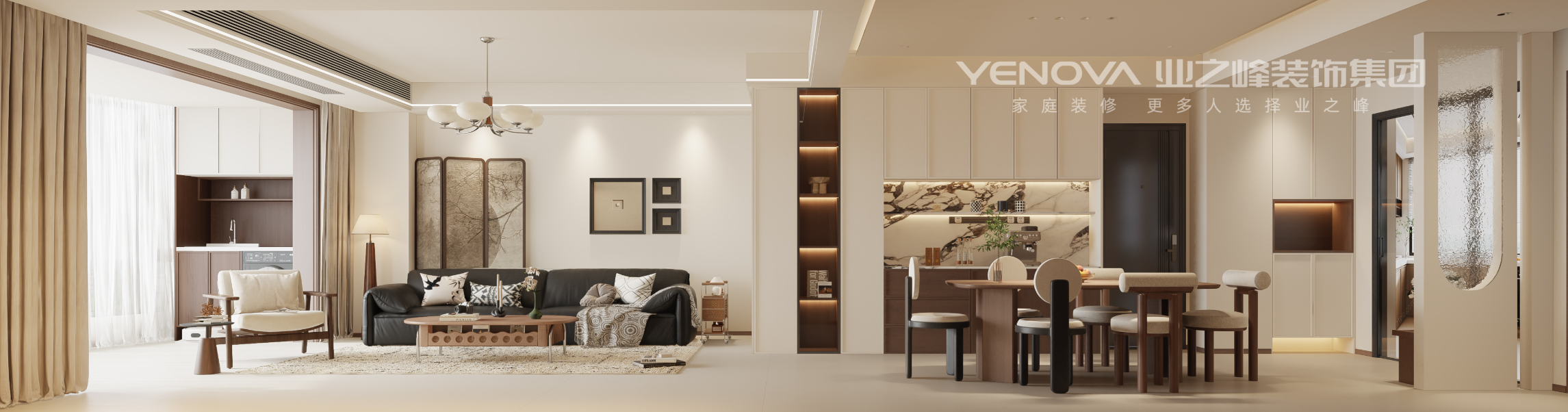 本空间以新中式风格为核心基调,延续优雅、简约的设计理念,选用高品质材料打造质感空间,注重空间层次感与使用舒适度的双重呈现,为居住者营造低调奢华且贴合日常需求的现代家居氛围。入户区域布局简洁实用,门侧规划合理动线,确保入户视野通透。正对面定制专属鞋柜,满足日常鞋履收纳需求,保持入户区域整洁有序;相邻空间自然衔接客餐厅,让整体格局更显开阔流畅,实现功能与美观的平衡。餐厨区域围绕生活实用需求规划,餐桌一侧衔接 U 字型厨房,严格遵循洗菜、切菜、炒菜的人体工程学动线设计,让烹饪流程连贯顺畅,提升日常烹饪的便捷性与舒适度;餐桌另一侧配置餐边柜,与客厅电视背景墙无缝衔接,既有效扩充了储物空间,又让客餐厅视觉风格统一协调,让空间过渡自然无违和。阳台空间聚焦功能收纳与日常使用,专门规划洗衣机放置区域,满足衣物洗护需求;同时搭配小型洗手台盆,方便日常小物件清洗;两侧定制储物柜,分别用于存放扫地机器人、清洁用品及各类杂物,让阳台空间整洁有序,兼顾实用性与收纳性。室内过道设计兼顾功能分区与美观性,右侧打造多功能室,内部暗藏折叠床设计,平时可作为休闲娱乐空间,需要时展开折叠床即可增加居住容纳空间,实现空间的灵活多用;过道左侧将洗手台盆外置,搭配屏风与半高柜,既增加了洗漱用品的存放空间,又巧妙划分过道区域,强化空间层次感,让整体布局更具设计感;卫生间内部采用干湿分离设计,满足日常卫浴使用需求,保持空间干燥整洁。走廊尽头左侧为客卧空间,采用衣柜嵌入墙体的设计,最大化节省室内空间,提升空间利用率;飘窗位置改造为实用书桌,充分利用闲置角落,满足居住者日常办公或学习需求,让客卧兼具休憩与办公双重功能。客卧对面为主卧套间,主卫内部配置独立洗手台与马桶,同时安装钻石型玻璃隔断,实现高效干湿分离,保障卫浴空间的整洁与干燥;卧室左侧定制靠墙衣柜与床头柜,满足衣物收纳与休憩时的置物需求;一物两用,让主卧空间更贴合现代居住者的多元生活需求。