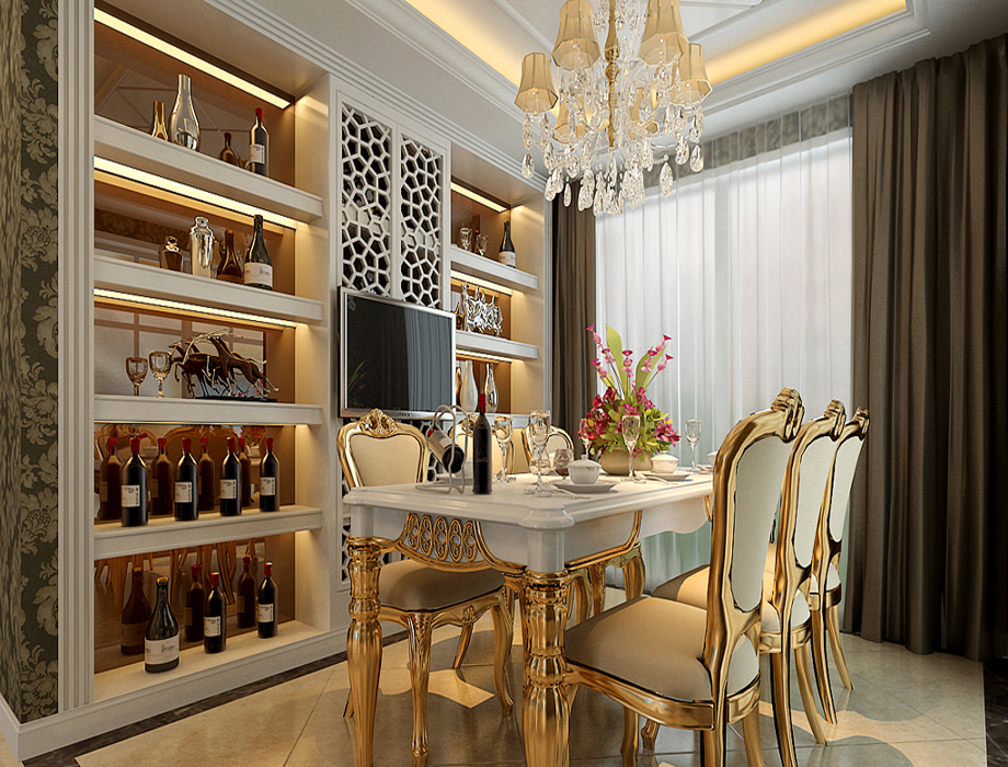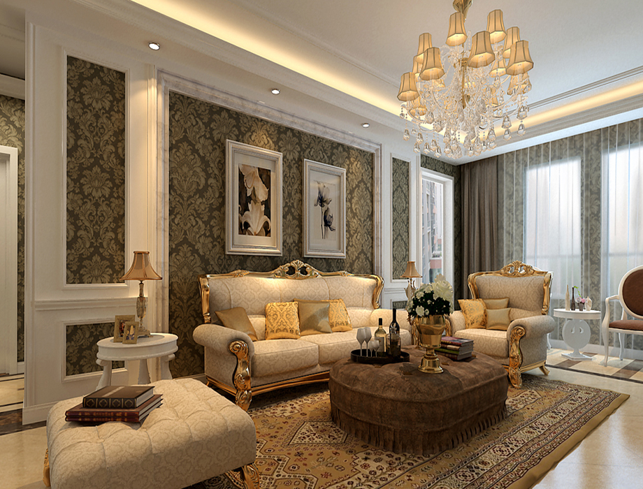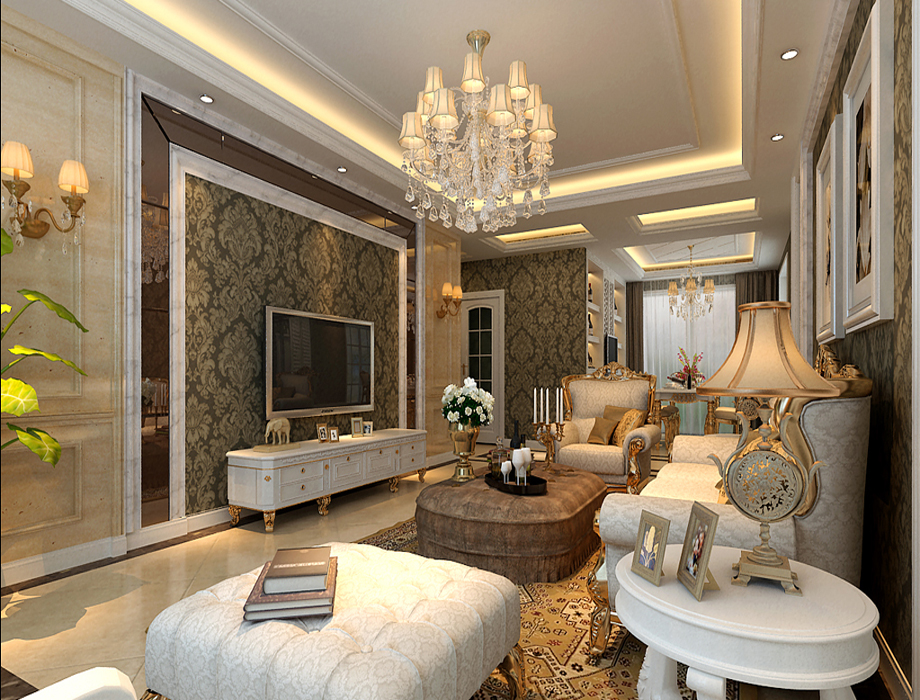 客厅1:狭长的电视墙通过石膏线的划分,使他们的主次关系更加明确。比较夸张的欧式花纹壁纸布满整个空间,统一而不有变化。客厅2:为了整个空间的统一,将沙发背景墙设计为暖黄色,宽边勾缝,既前后呼应又富有变化,更显大气。