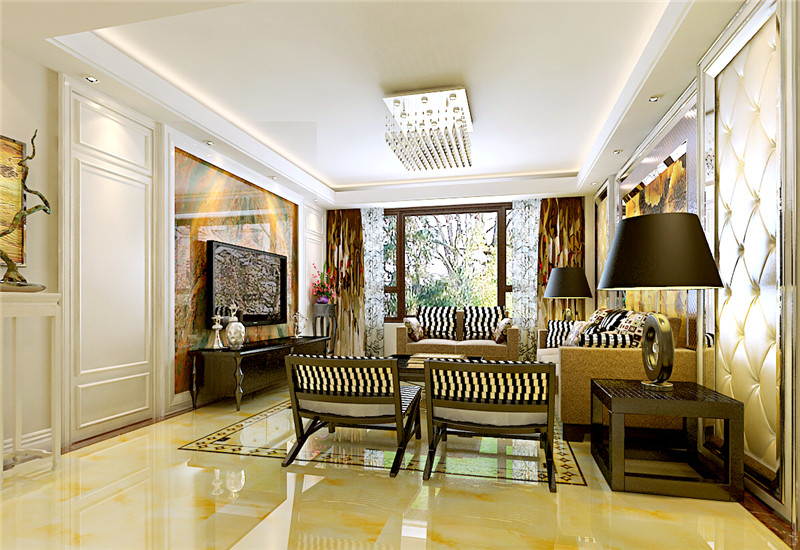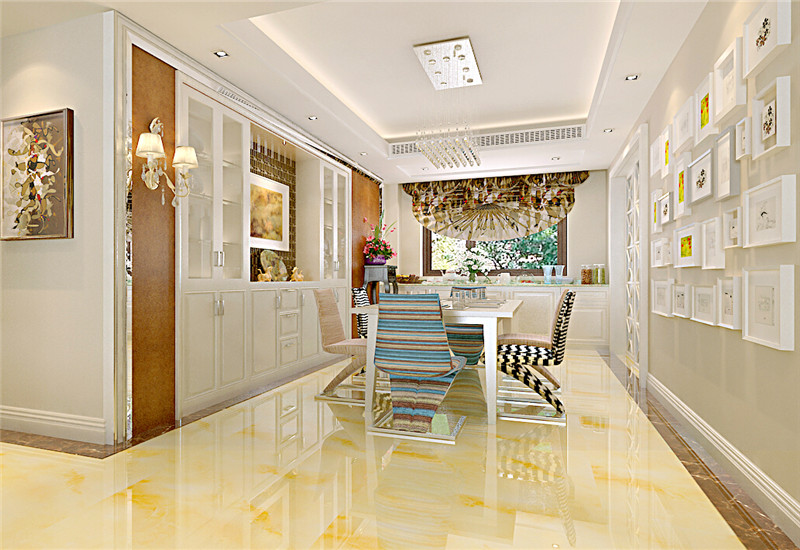 客厅以黄色为主调,电视墙处理简洁而富品味色调古旧的电视柜和背景墙是客厅的焦点所在,配合仿古地砖,展现出和谐宁静的家居生活氛围。从客厅窗户望向餐厅,黄色基调的休闲气氛,空间简洁而相当富有品味。