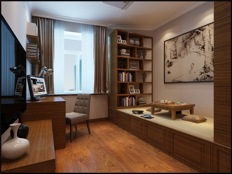 此小区位于308国道中间李村路段,繁华,生活方便。家中小两口,有一个活波可爱的三岁小男孩,男主人喜欢中式风格,女主人喜欢现代风格,中和二人喜好,做了这个新中式风格的设计。弧形墙面比较多,在书房通过书柜及增大的窗的宽度来把墙面取直。入户两面墙不一样长,通过屏风取直墙面。此设计风格线条简练,颜色对比鲜明,不但具有中式传统意境又有现代简约的舒适感觉。会使喜欢中式的年轻人眼前一亮。