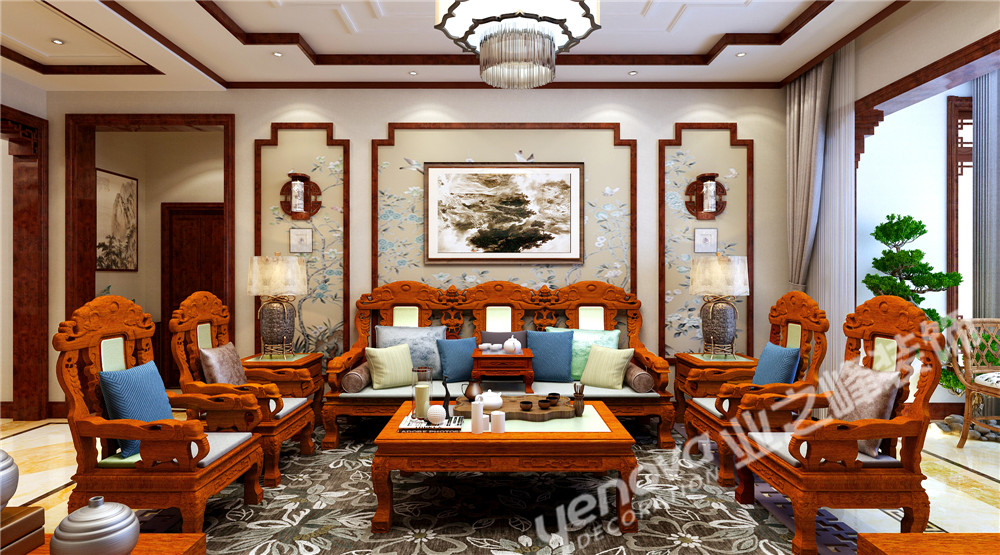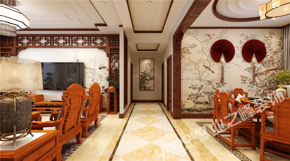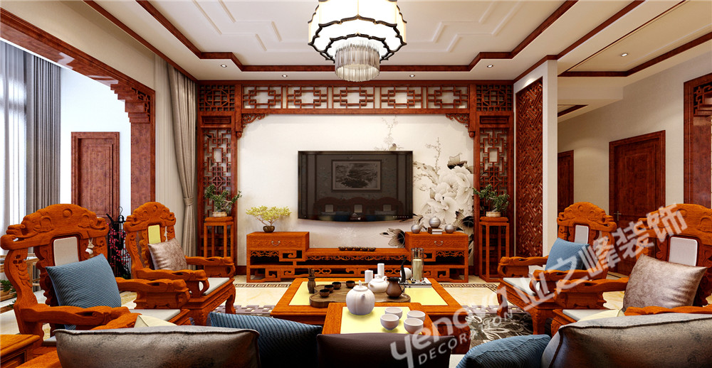 中国风的构成主要体现在传统家具(多为清明家具为主)装饰品及黑,红为主的装饰色彩上。室内多采用对称式的布局方式,格调高雅,造型朴
