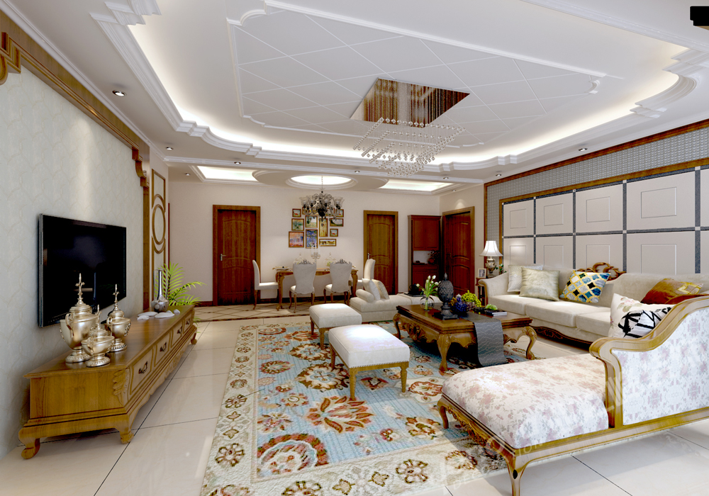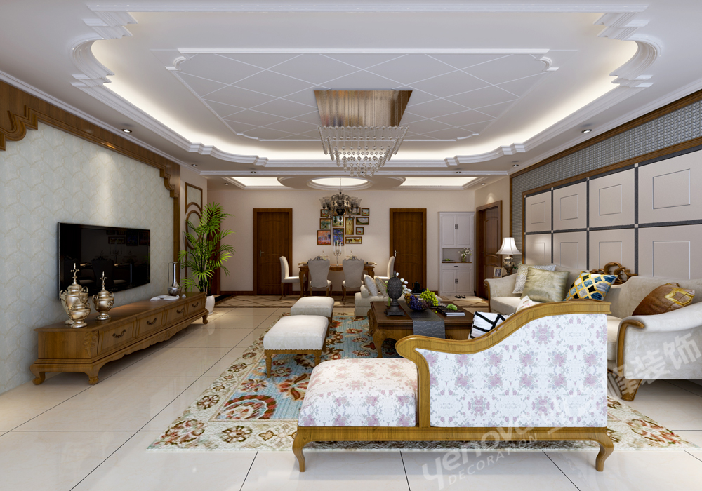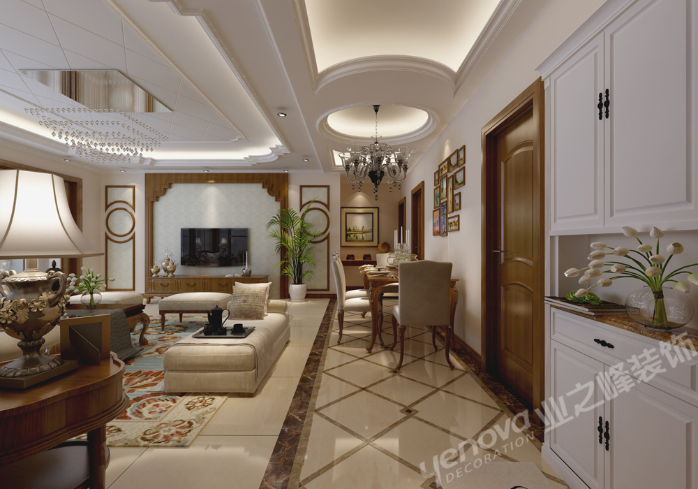 客户的素质涵养极高,待人亲和,礼貌,所以客户对于家的认知也是别具一格,要求含敛并包,家里的整个格调要求简欧风格,要求稳重大气。顶面和木门的样式都是高度的一致和格调统一。地面拼花和客厅的吊顶造型也是呼应统一。 电视墙的造型是和客户沟通在三之后,与客户一起定下了这个风格。
