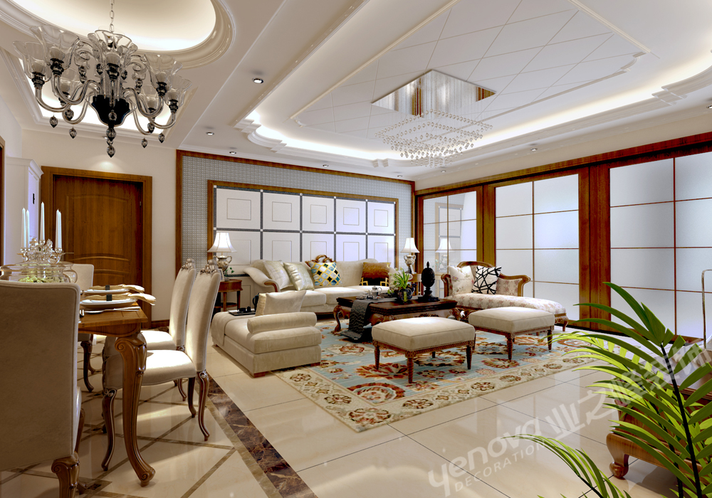 客厅餐厅的吊顶分明,功能动静分区划分详细。石膏线和顶面切角的流畅衔接使得整个大厅显得大气,但是又不盛气凌人,达到了兼容并包,含蓄并收的效果