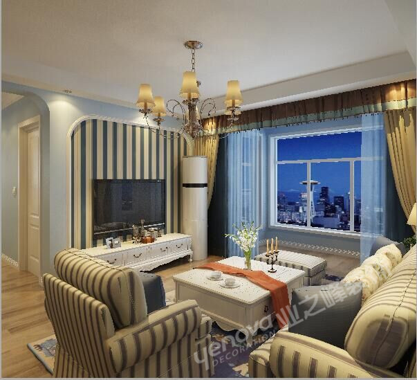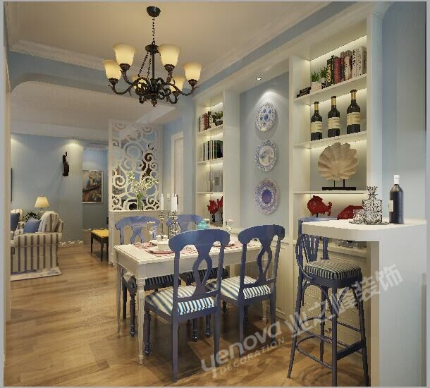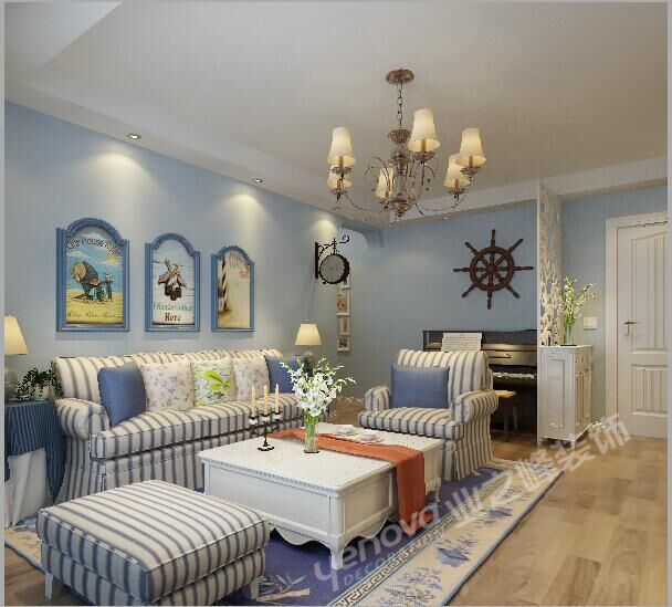 业主喜欢清新的彩色,钟爱地中海风格,但考虑到家庭和孩子居住感受,纯粹的地中海风格色彩过冷,故最终采取简约与地中海结合的形式,保留地中海风格特色元素,如天蓝海蓝,船舵,假百叶装饰,及拱形门洞等元素的同时,整体墙面地面颜色有采用暖黄色,又保证了家居生活温馨舒适的需求。做到了美观与舒适的完美融合