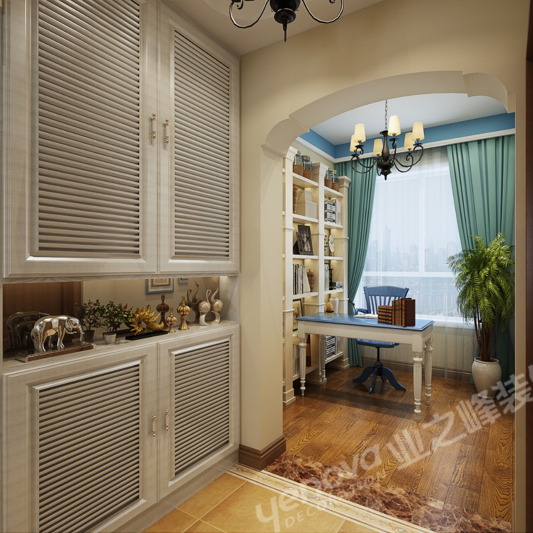 门厅区域 –造型上边采用了地中海的特征造型拱形,拱形垭口的运用增加了温馨的色彩,书房的风格色彩给人以舒适安逸之感。