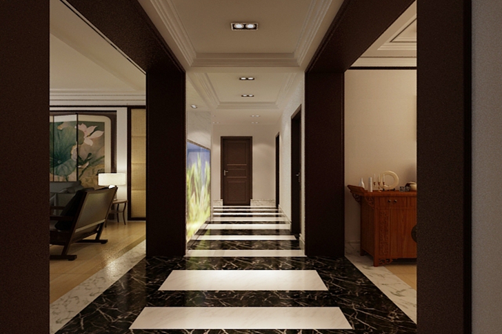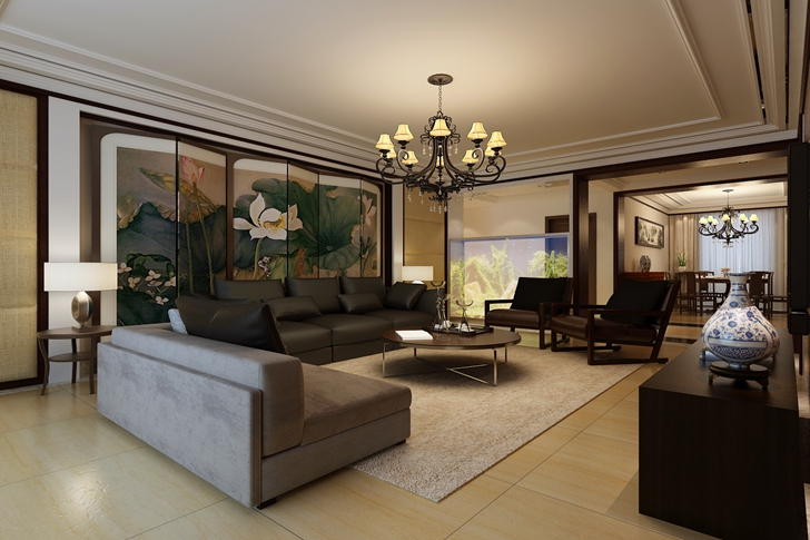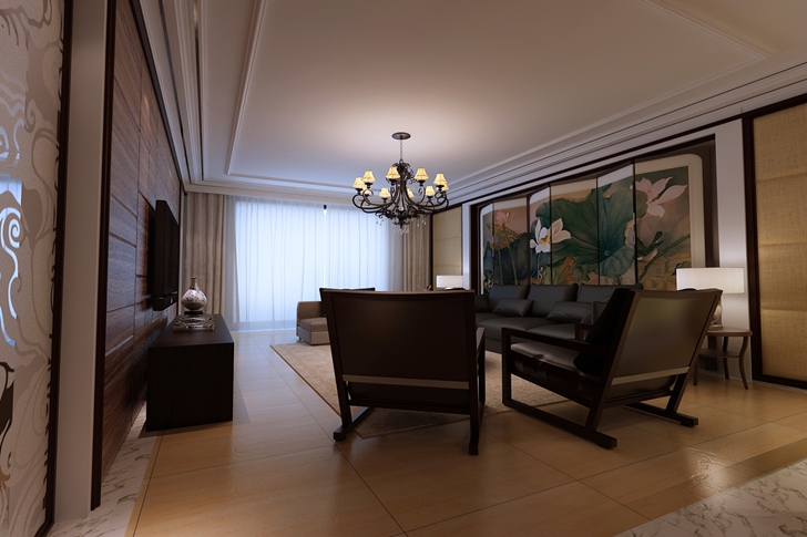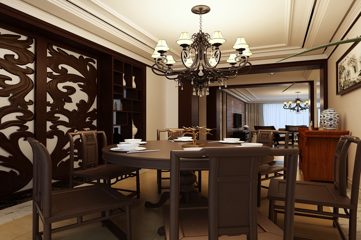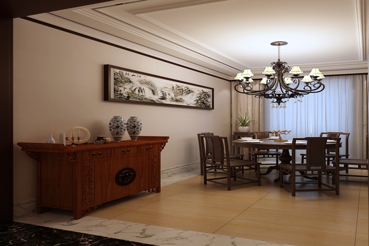 本案家居布局上讲究方正、对称的布局形式,讲究整体的布局和风水格调高雅,造型朴素优美,色彩浓厚而成熟。中式风格的装饰主要体现在传统的家具,再辅以字画、盆景,陶瓷、古玩、屏风等装饰品,最求的是一种修身、齐家的生活境界。在整体的色彩选择上以庄重的红黑为主,体现中式文化深沉、厚重的底蕴。中式风格在整体的布局上虽然最求对称庄重,而在细节上有更倾向于自然情趣、花鸟鱼虫等精细雕刻,取其美好的寓意来表现人们对美好生活的追求