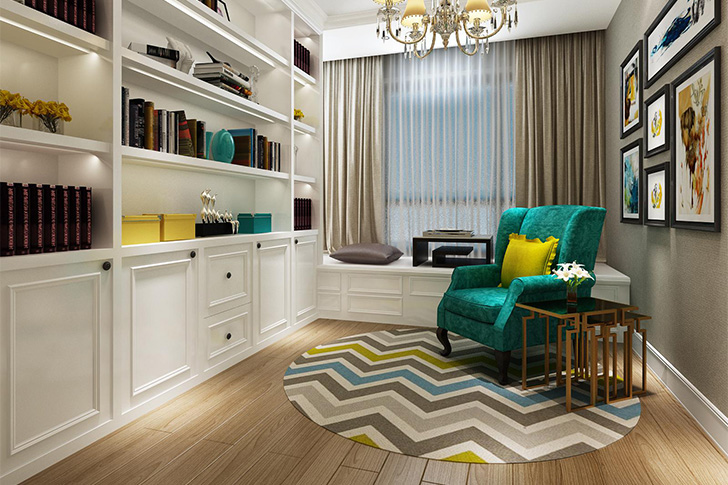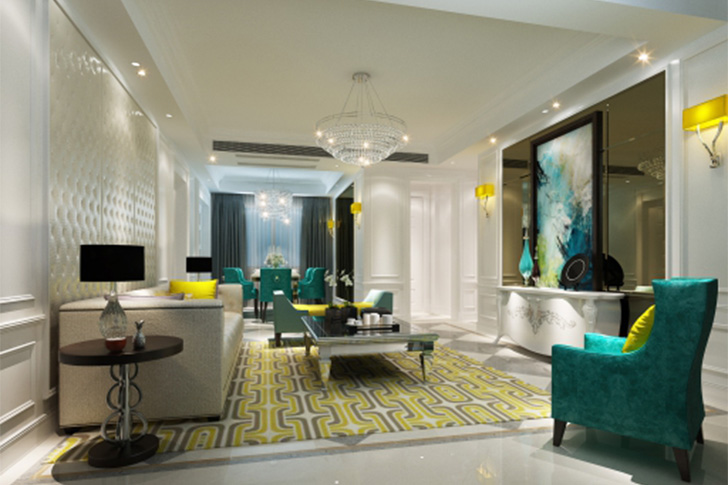 简约的欧式装修,采用了一些温和的色彩,让人温馨而别致。餐厅采用了黄色和红雀绿的搭配,让餐厅家具更有古典的高贵与优雅。加上室内灯光的效果,让客餐厅空间充满氛围感。而客厅中的地毯、沙发的颜色相配,具有婉转、柔和的特色。书房白色哑光漆的家具与孔雀绿沙发的对比色搭配,更显空间的饱满和张力。