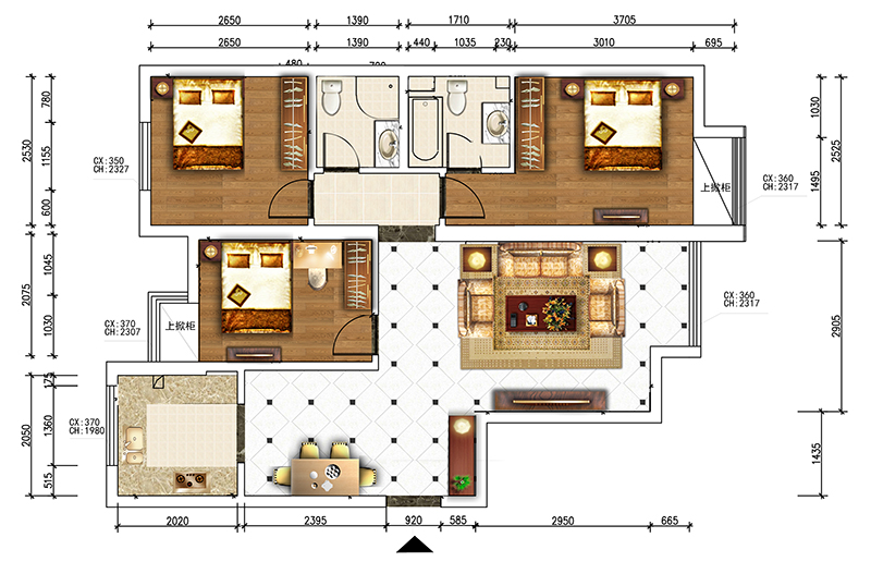 此案是三代人一起住,客厅窗户是侧采光,卧室外墙影响部分客厅采光,后期地砖选择上颜色为浅色微晶石,斜铺点角,增大空间灵动性。背景墙用防外墙砖肌理漆装饰,增加田园性。餐厅摆放在靠外墙一侧,由于是父母在家用厨房居多,故将餐厅东侧作为过道,仅放置双开冰箱,方便日常餐厅厨房的行走。照片墙为餐厅墙面点缀。