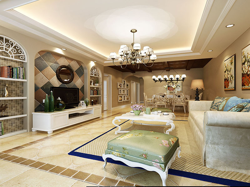 整体色调是浅咖啡色的处理,墙面素色壁纸,地面仿古地砖,有斜铺角花的点缀,电视墙是家里的亮点,左右对称的拱形造型墙结合装饰横板,可随意摆放装饰摆件。电视墙中间是马可波罗的五彩仿古地砖上墙,陵铺处理,延伸房间高度。餐厅位置的顶面是深色生态木吊顶,与客厅碟级的灯池颜色和材质形成强烈反差,整体空间层次感强烈。整体的家居配饰建议是白色混油家居和布艺沙发,营造温馨浪漫的居家氛围。