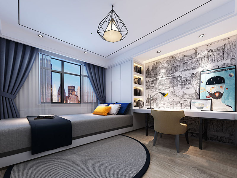 书房兼客卧结合功能,以冷色为主,衣柜和展示柜结合宽大的工作台,满足女业主的需求,抽象的壁画让书房不那么生硬,还有那副抽象画,很有艺术范儿。