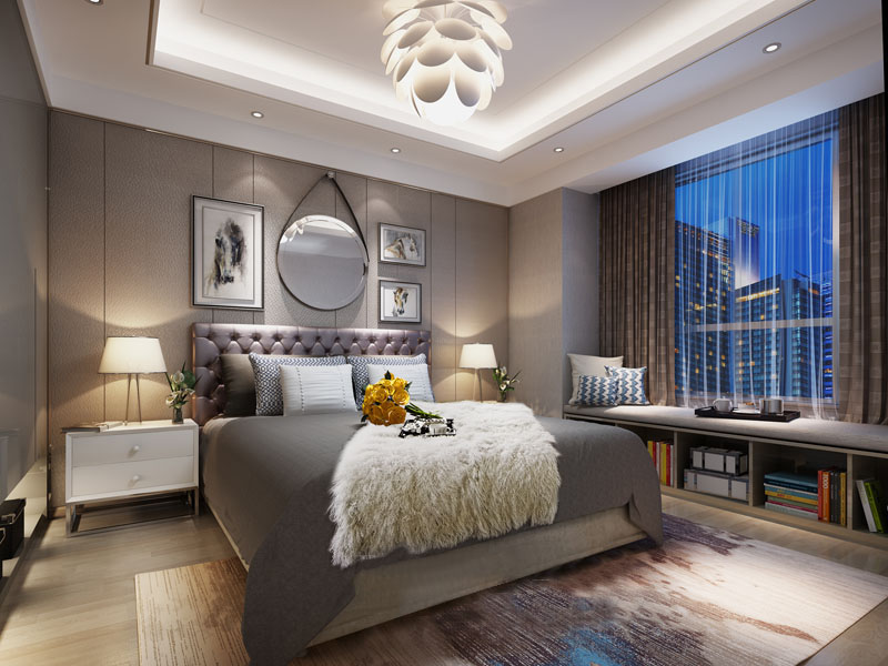 美式软包床,浅咖色亚麻布的壁布上墙,金属压条装饰处理,飘窗位置的墙体拆除后,做了矮柜,以书架的形式存在,方便女主人随时阅读的需求。整体追求温馨唯美的生活氛围。